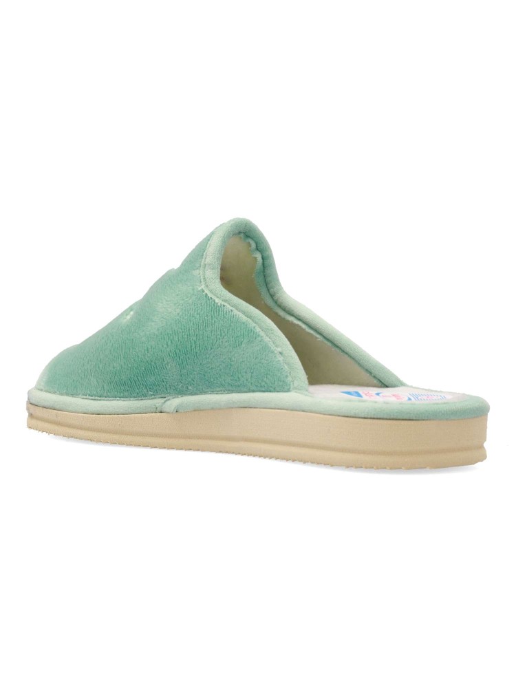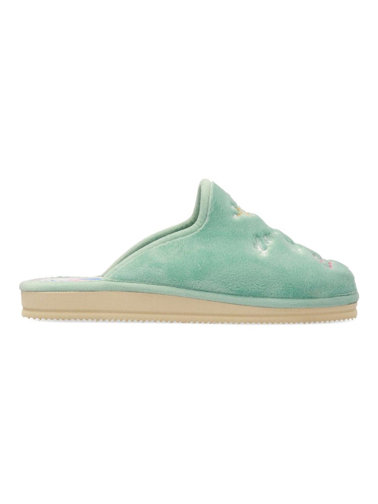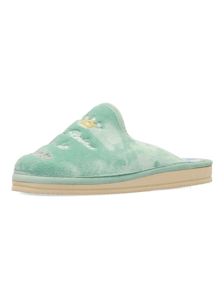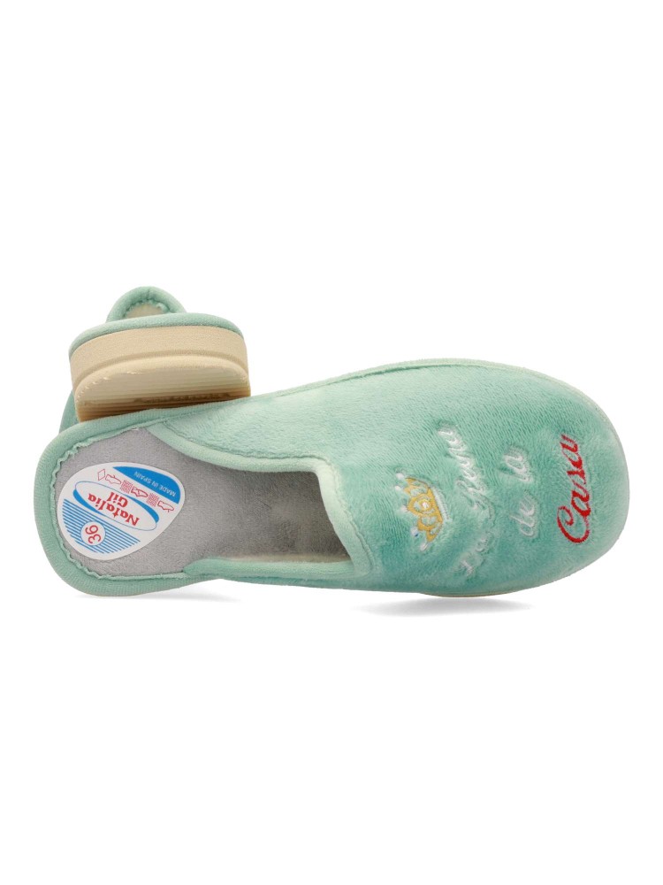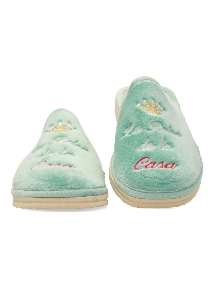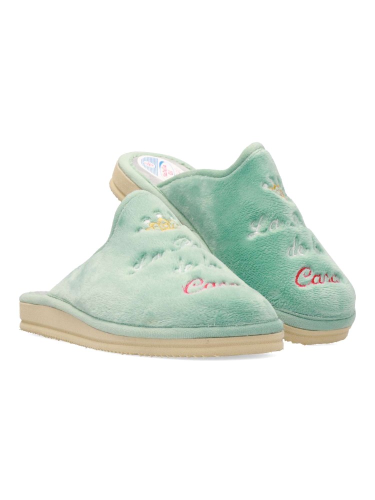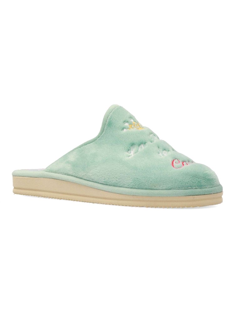 Zapatilla de casa para mujer. Disponible en color verdina. Fabricada en textil suave, con suela de goma EVA (especial parquet). Detalle frase bordada. Modelo ligero, cómodo y abrigado para los días más fríos. Hecho en España.