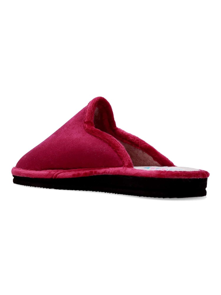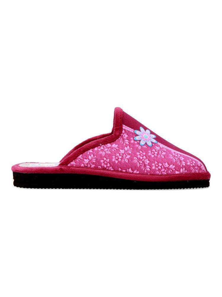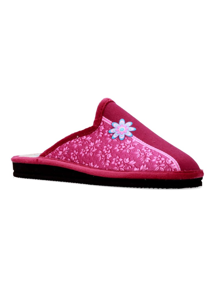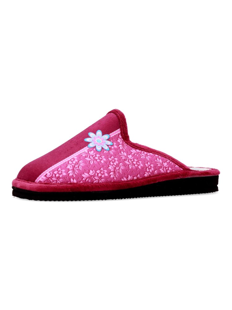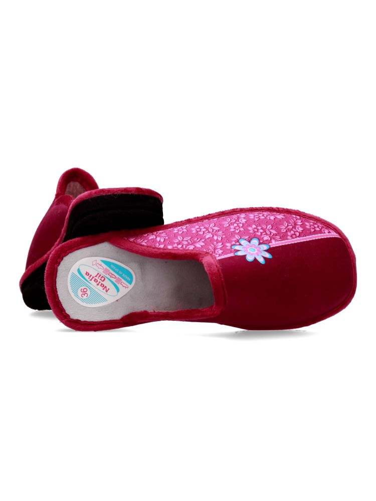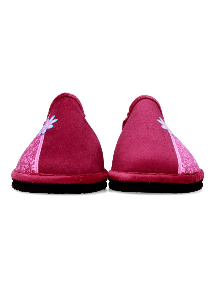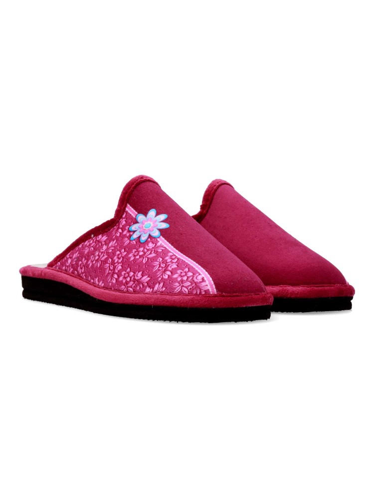 Zapatilla de casa para mujer. Disponible en color burdeos. Fabricada en textil suave, con suela de goma EVA (especial parquet). Detalle estampado flores. Modelo ligero, cómodo y abrigado para los días más fríos. Hecho en España.
