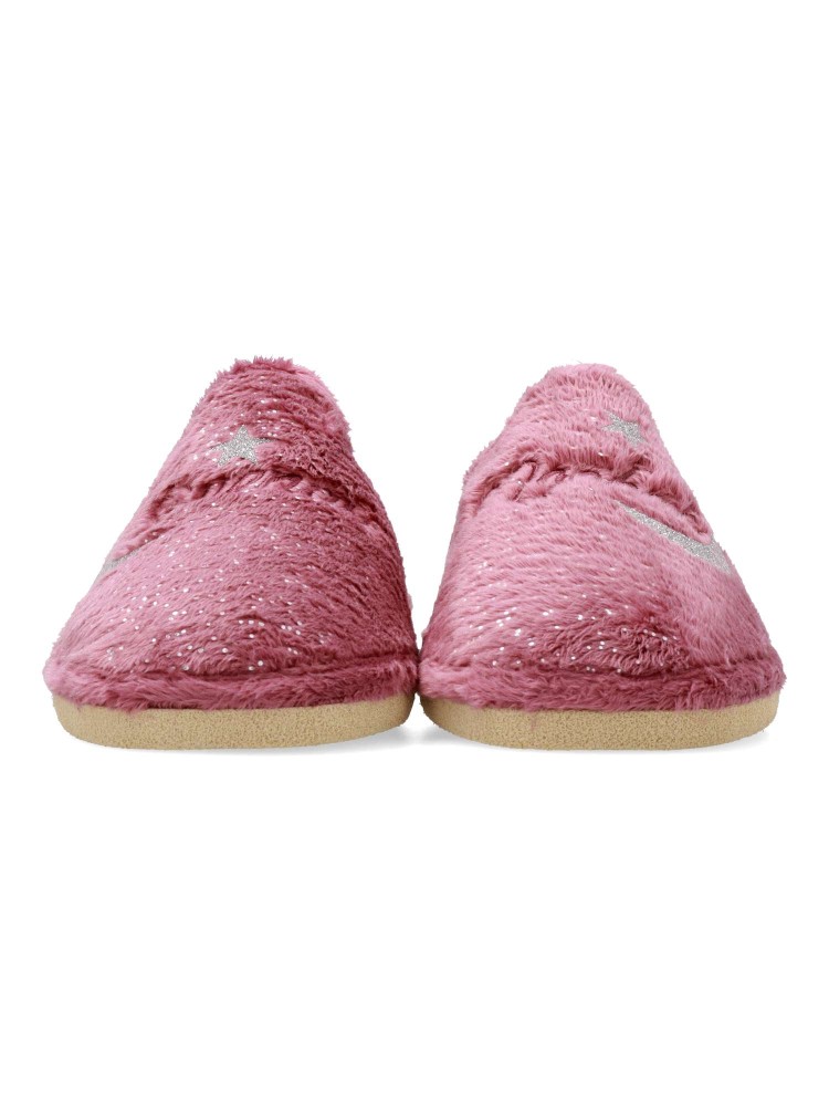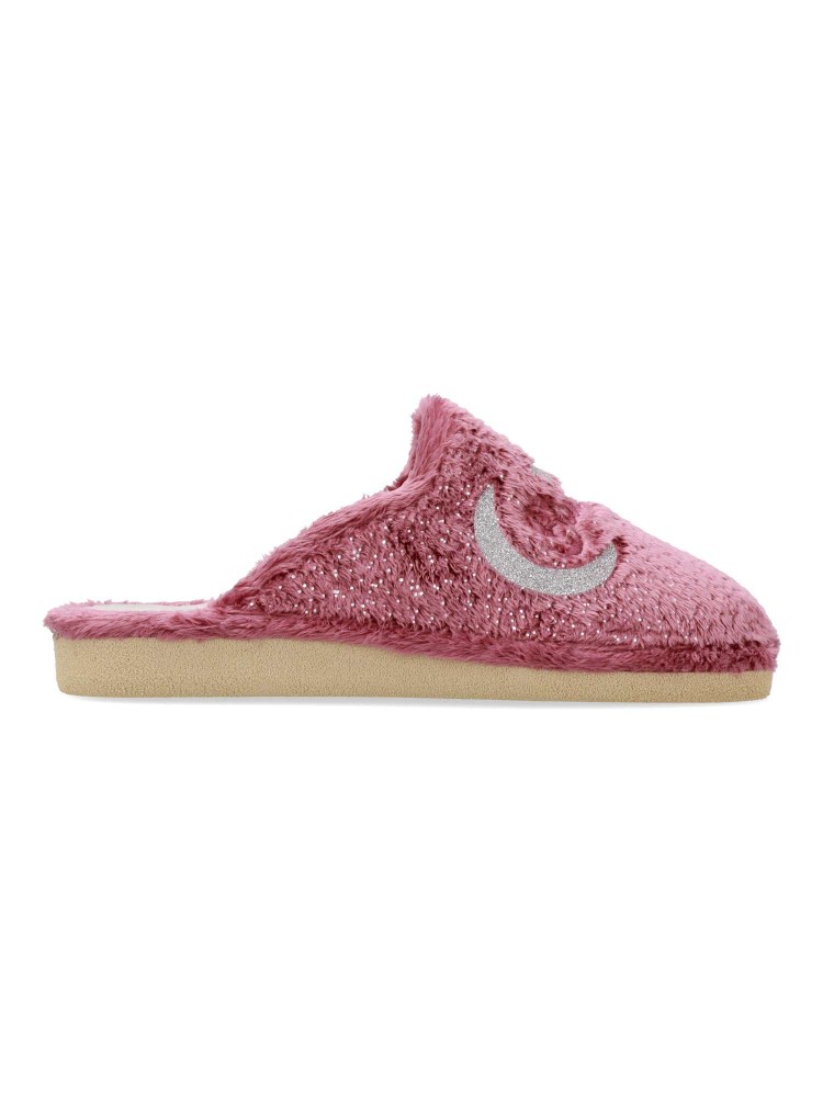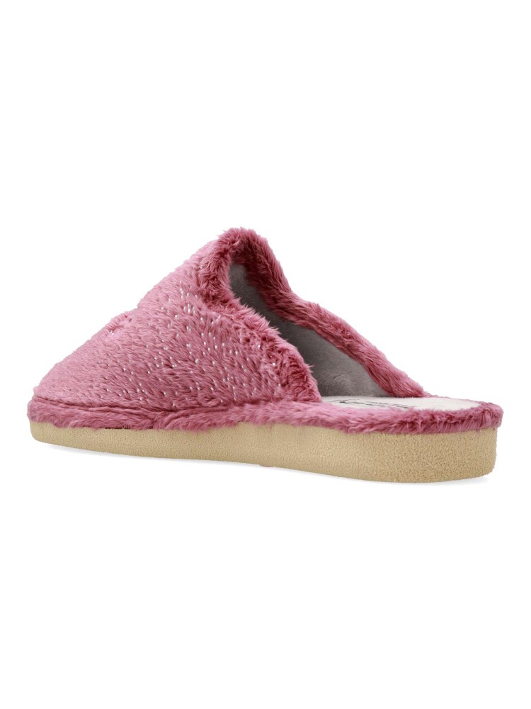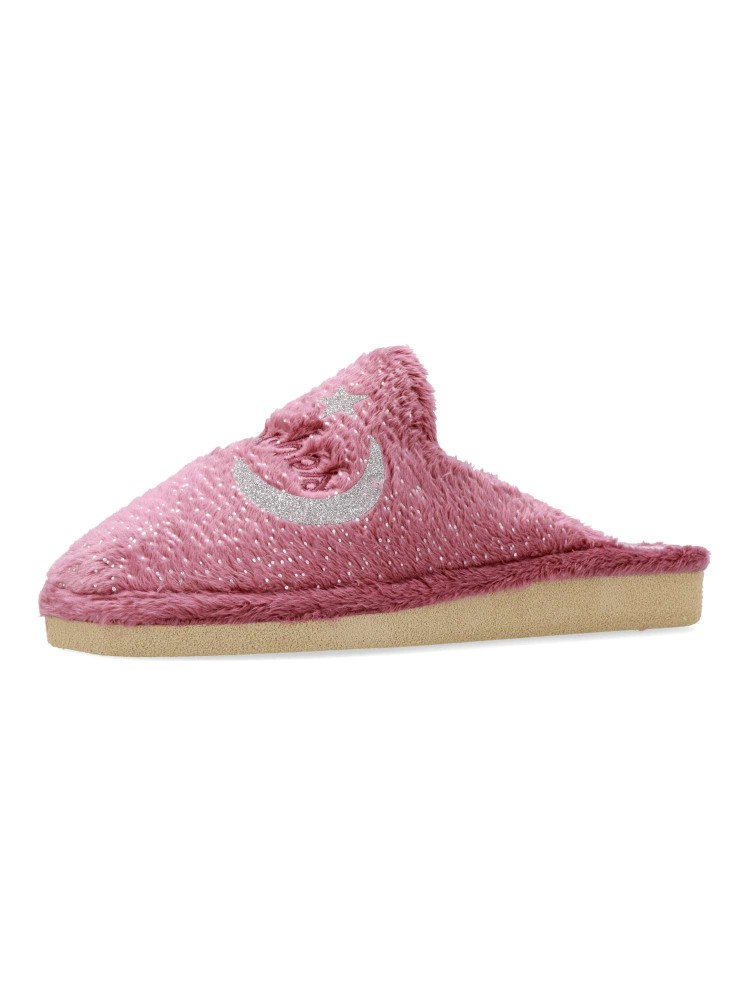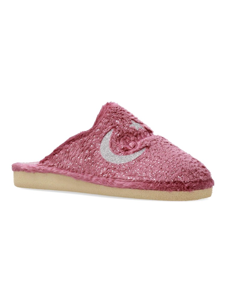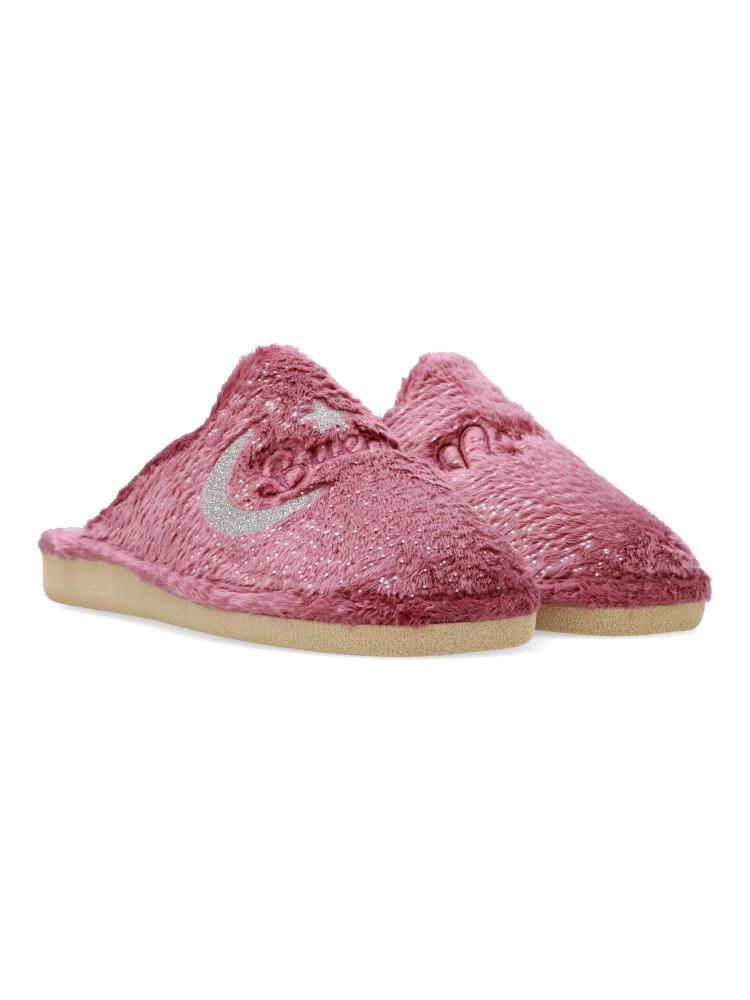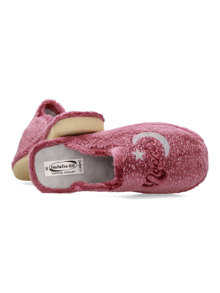 Zapatilla de casa para mujer. Color malva. Fabricada en textil suave, con suela de goma EVA (especial parquet). Detalle frase bordada "Buenas Noches". Modelo ligero, cómodo y abrigado para los días más fríos. Hecho en España.
