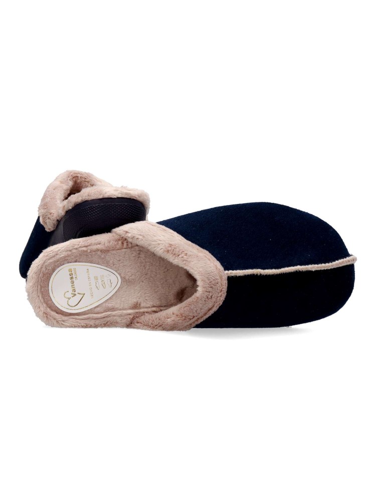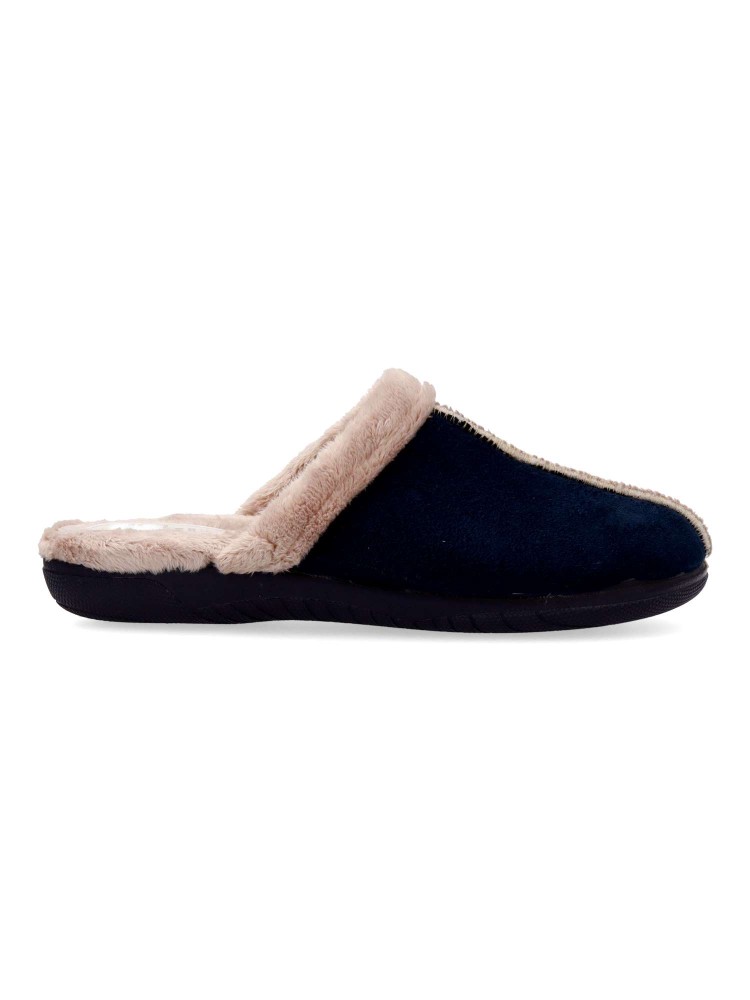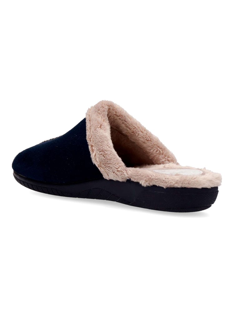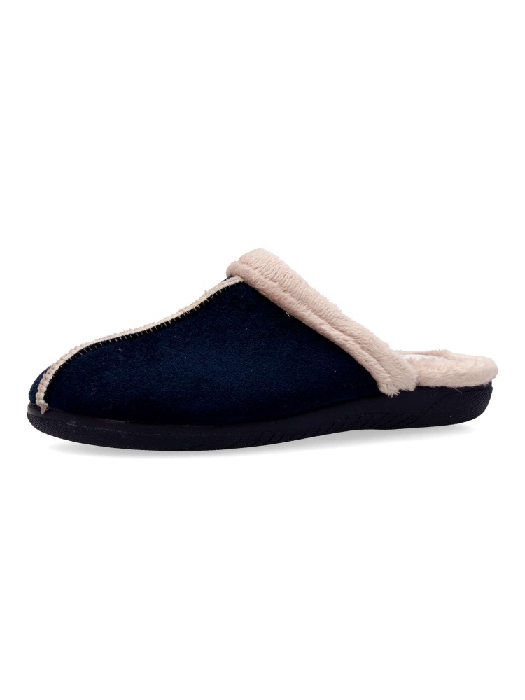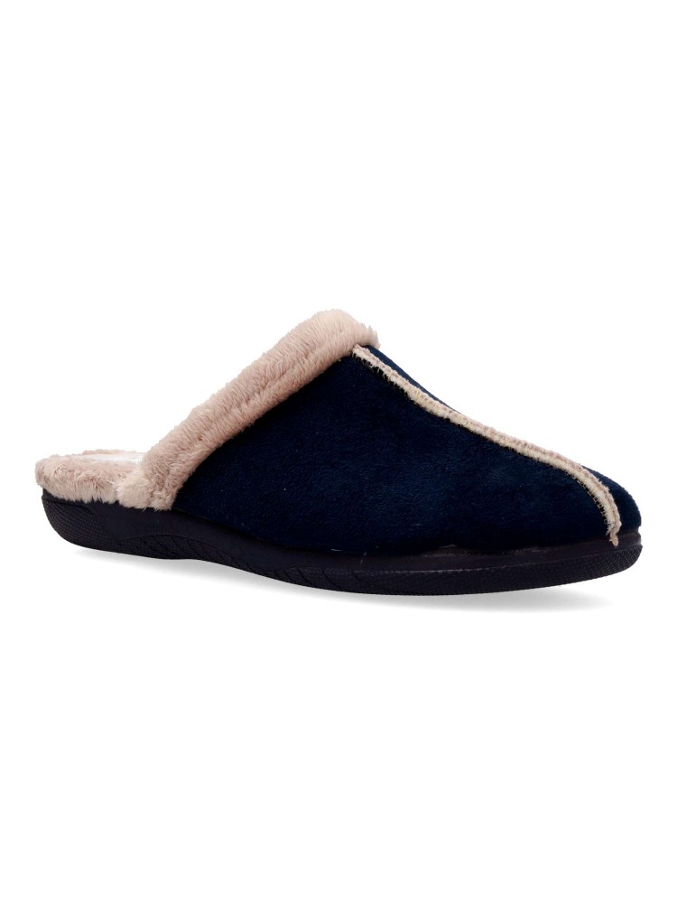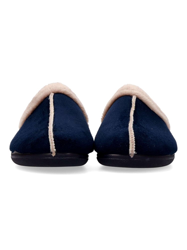 Zapatilla de casa para mujer. Fabricada en textil con suela de goma ligera y flexible. Color marino. Plantilla acolchada. Interior y exterior de suave pelo sintético. Agradable sensación de comodidad y calidez para los días más fríos. Hecho en España.