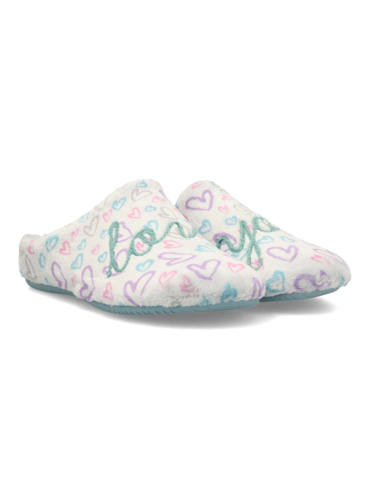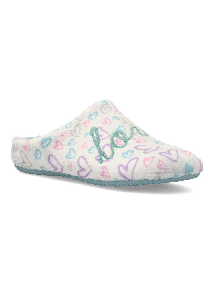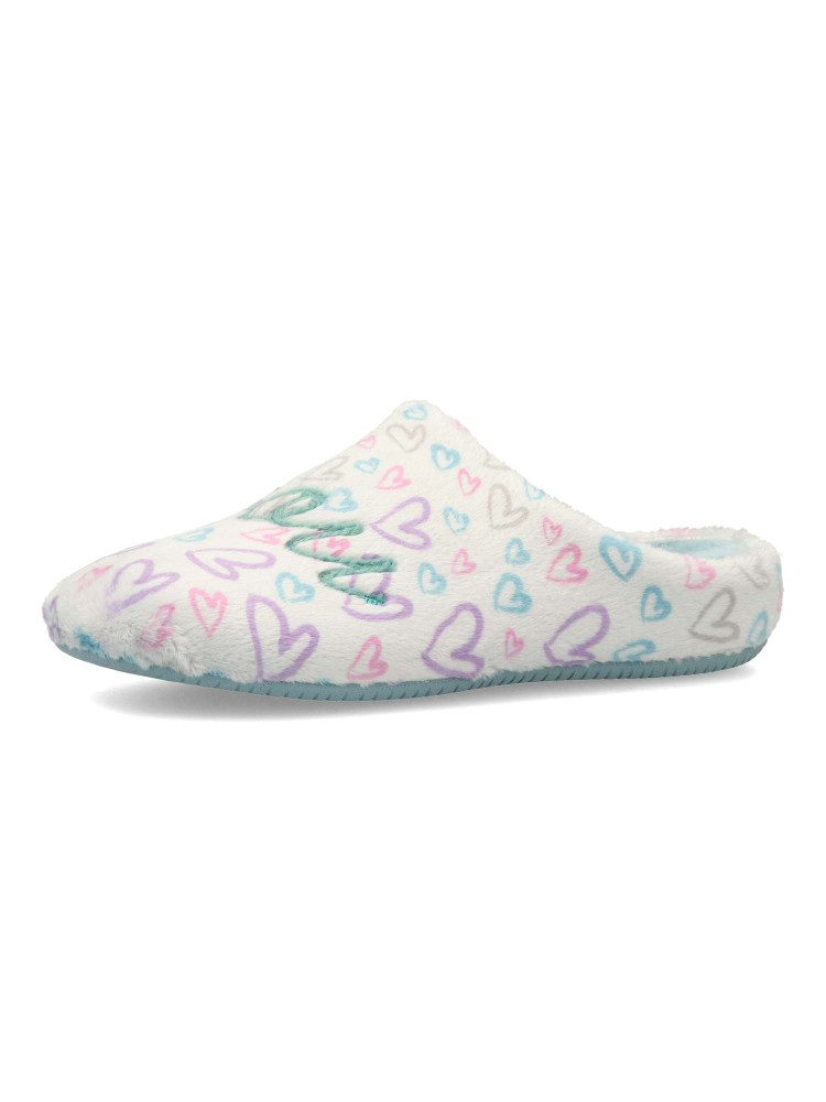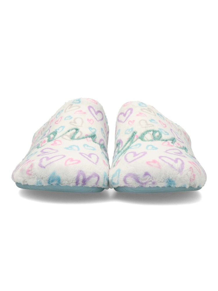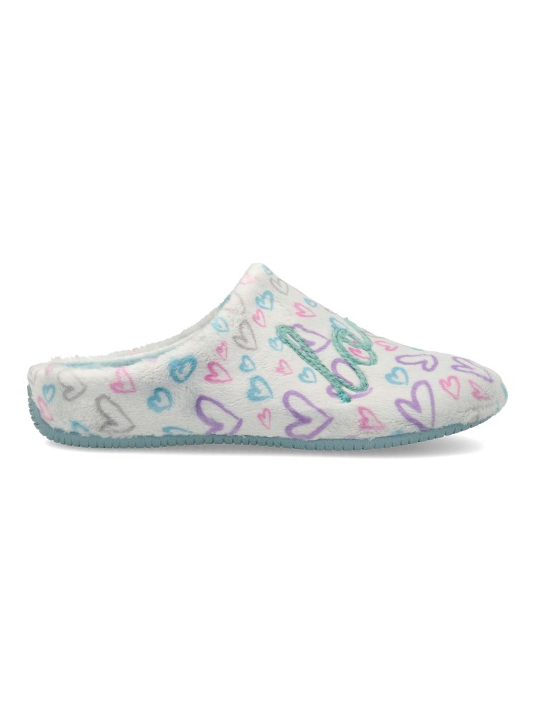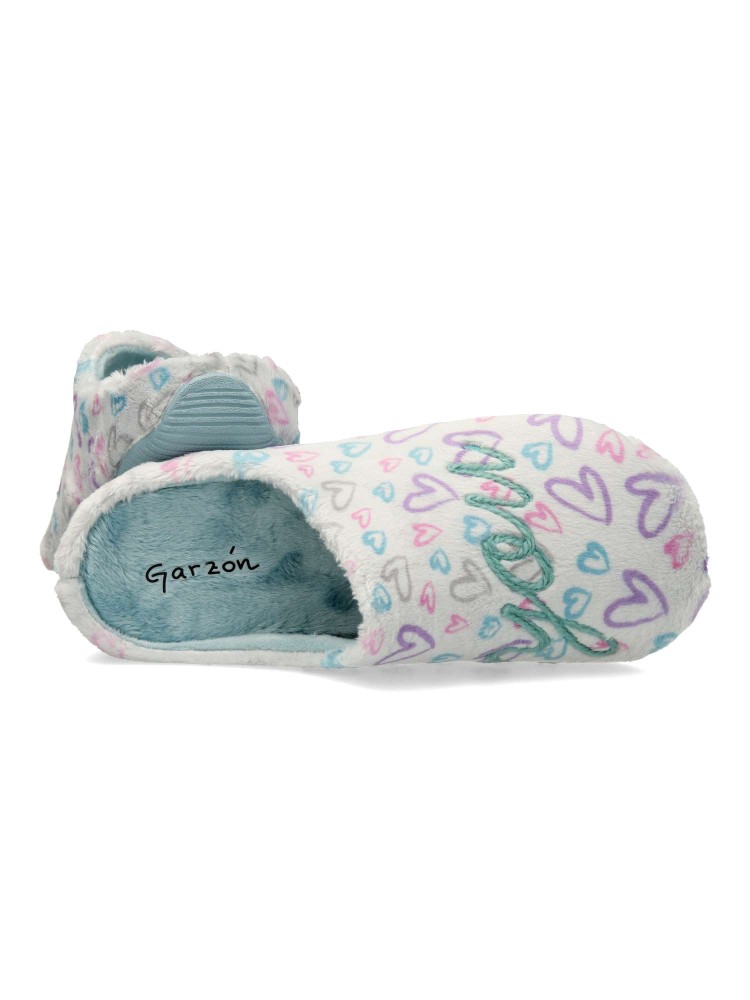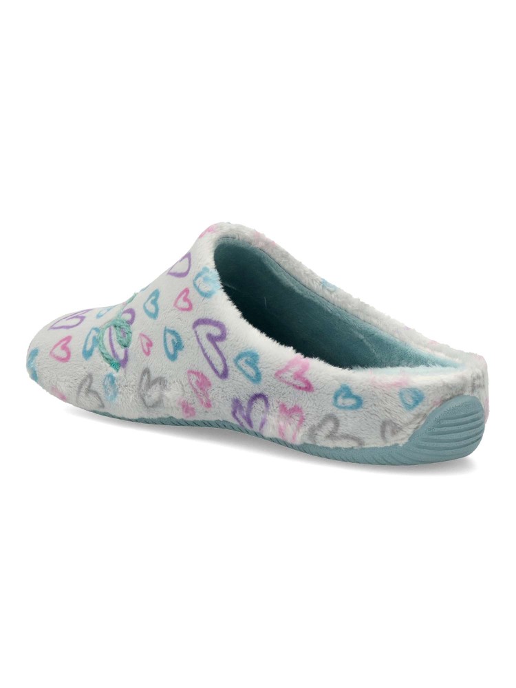 Zapatilla de casa para mujer. Disponible en color plata-turquesa. Planta acolchada. Piso de goma antideslizante. Modelo cómodo, suave y abrigado para los días más fríos. MONTLIS (S. LOVE/YOU). Hecho en España.
