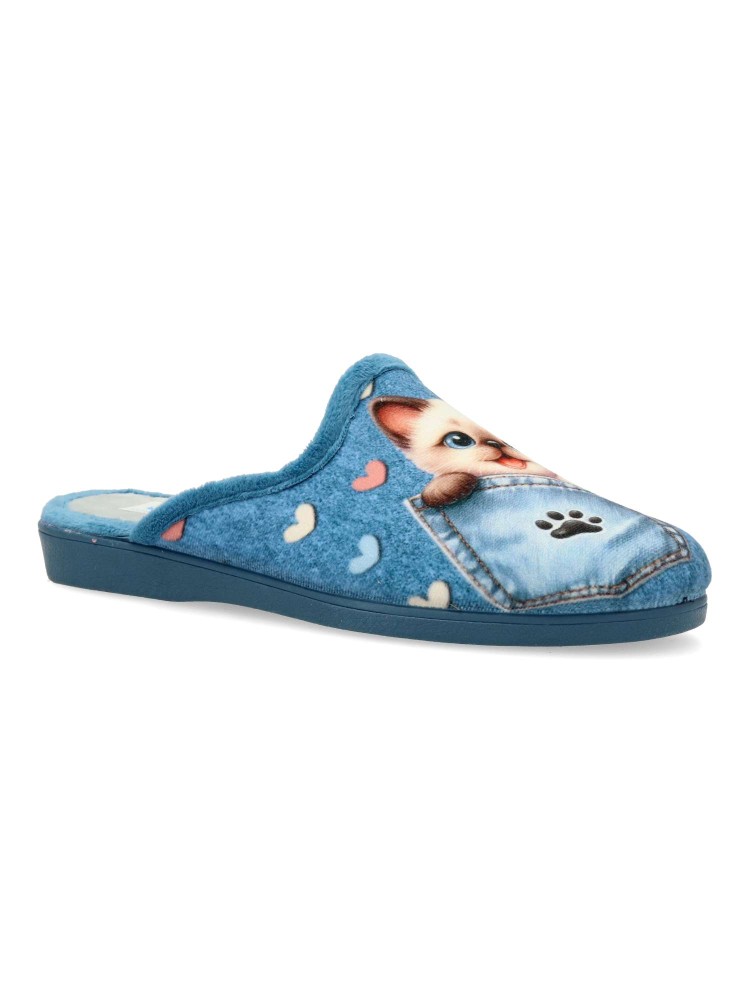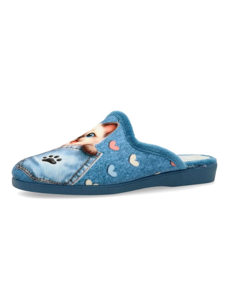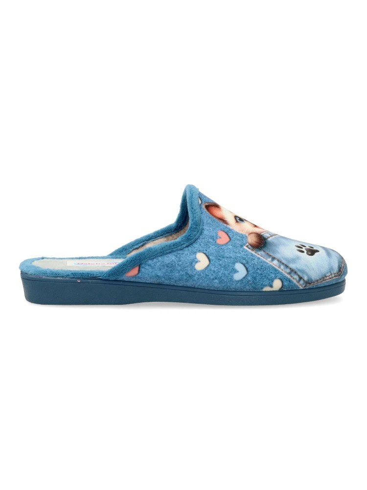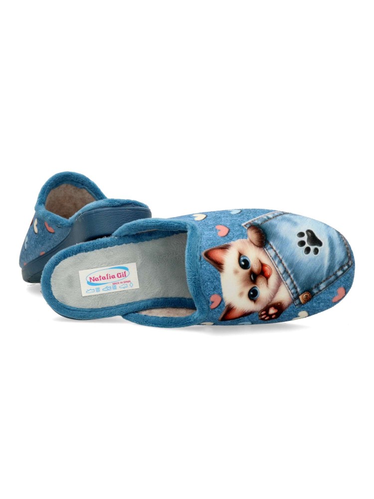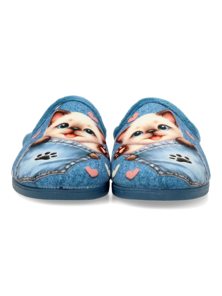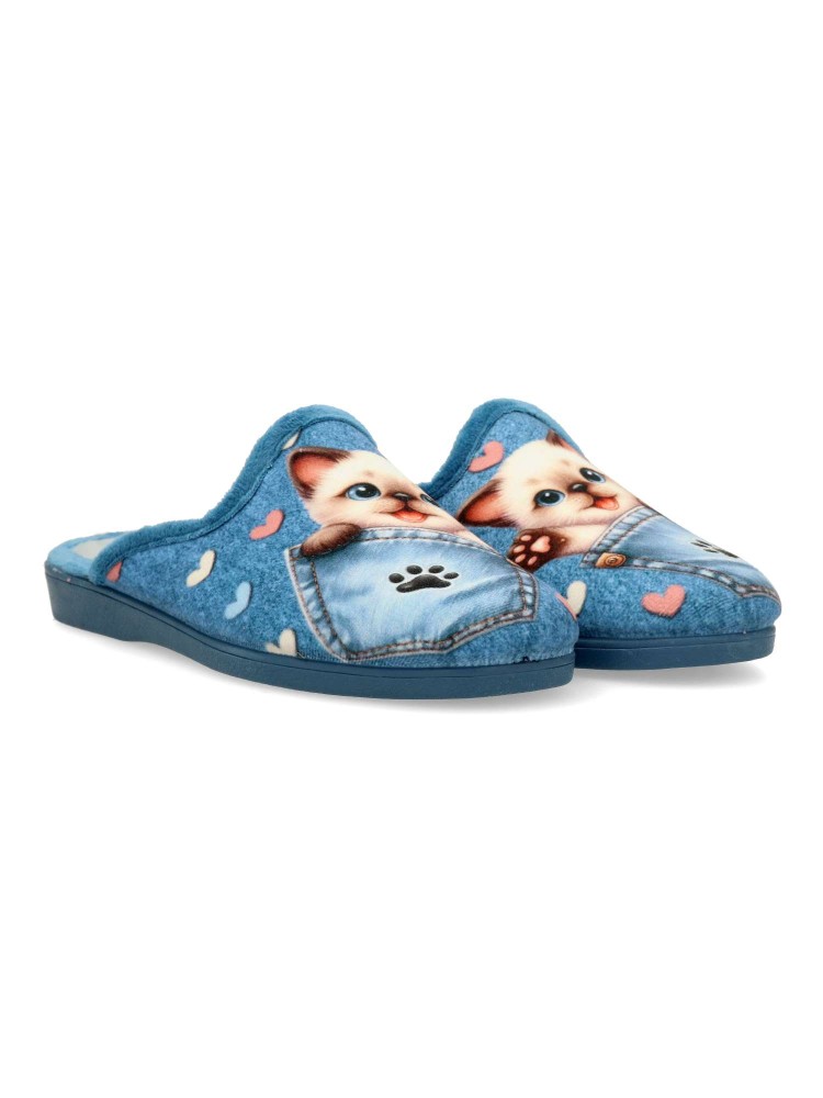 Zapatilla de casa para mujer. Detalle estampado gatito. Fabricada en textil aterciopelado, con suela de caucho antideslizante, flexible y ligera. Plantilla acolchada. Zapatilla que te ofrece comfort y te abriga en los días más fríos. Hecho en España.