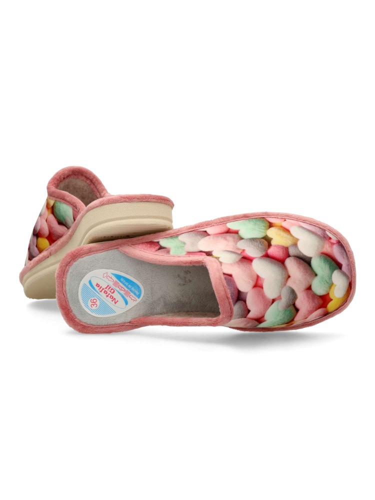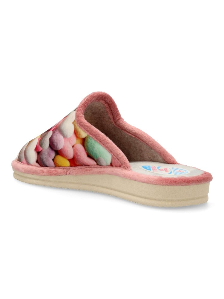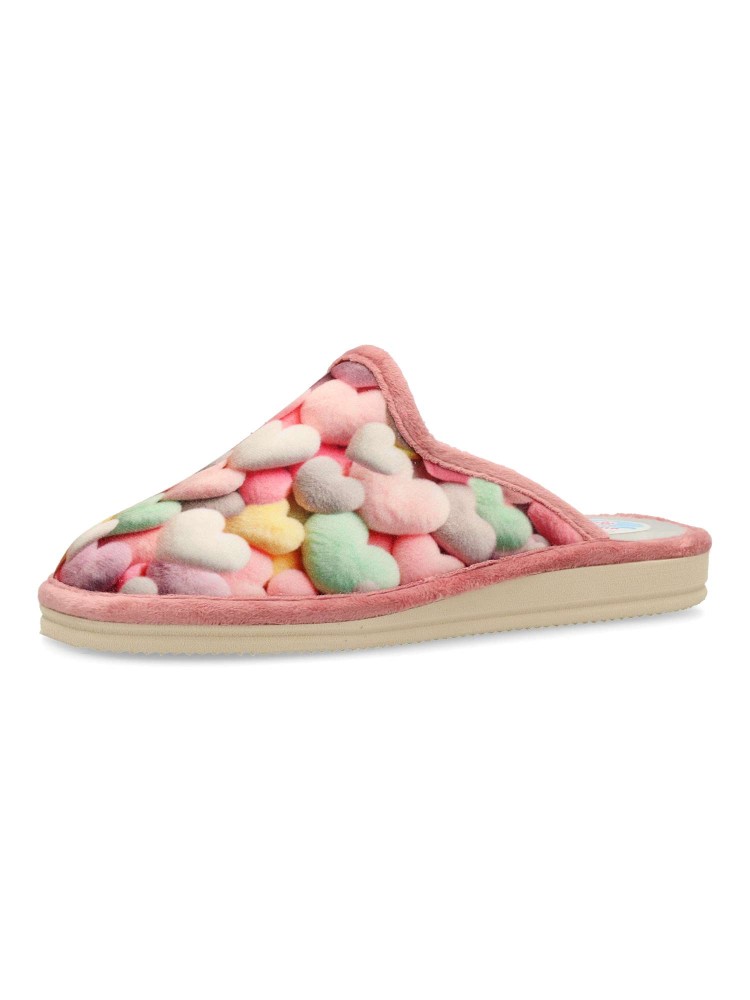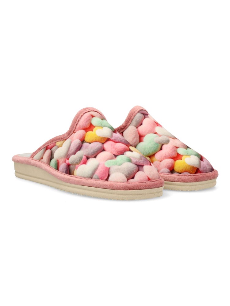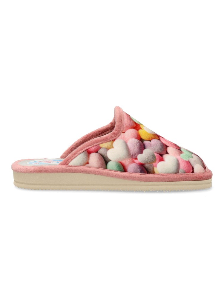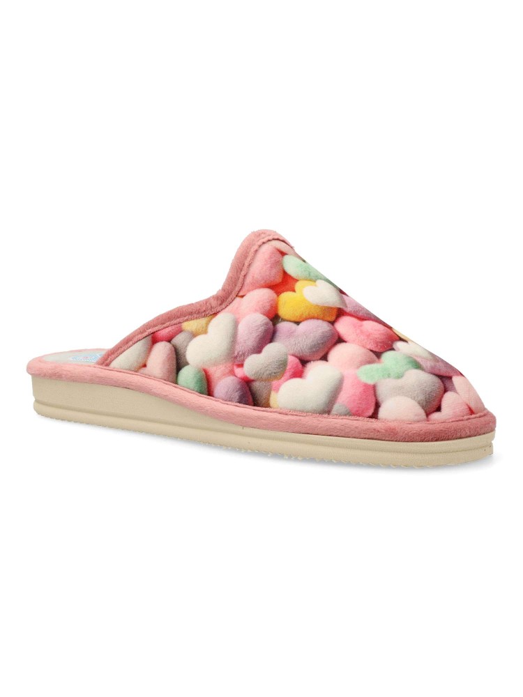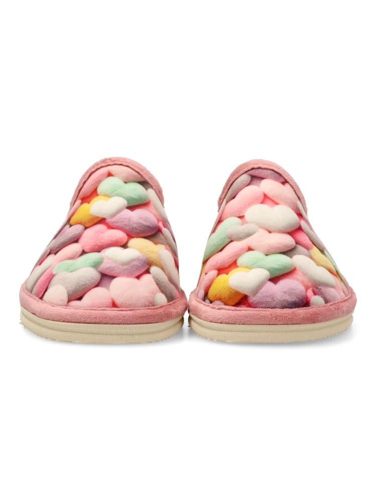 Zapatilla de casa para mujer. Disponible en color malva. Fabricada en textil, con suela de goma EVA (especial parquet). Detalle estampado corazones. Modelo ligero, cómodo y abrigado para los días más fríos. Hecho en España.