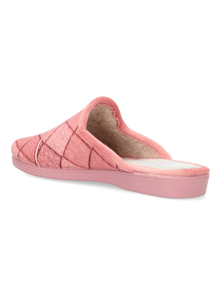 Zapatilla de casa para mujer en color malva. Fabricada en textil aterciopelado, con suela de caucho antideslizante, flexible y ligera. Plantilla acolchada. Zapatilla que te ofrece comfort y te abriga en los días más fríos. Hecho en España.
