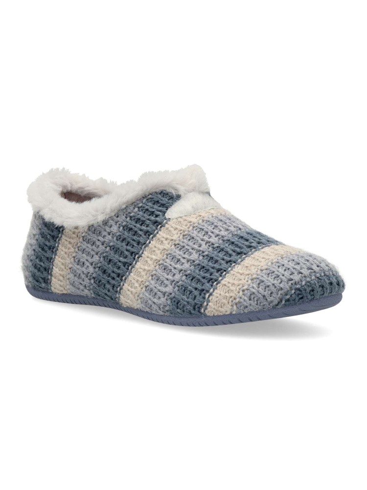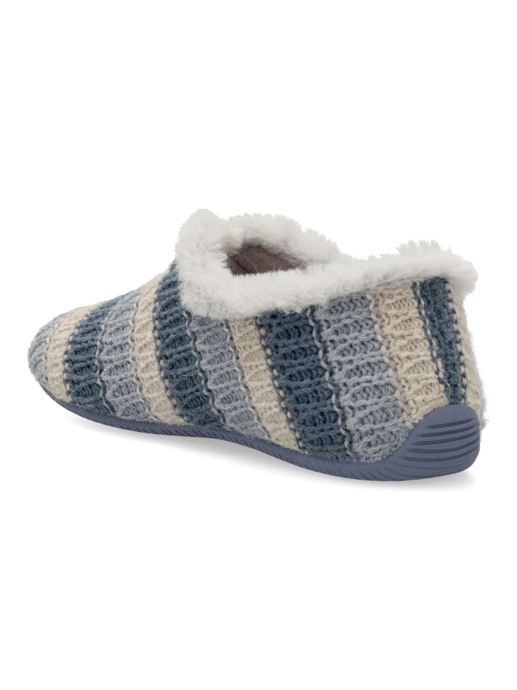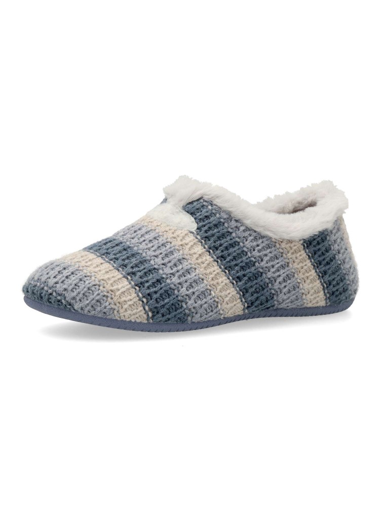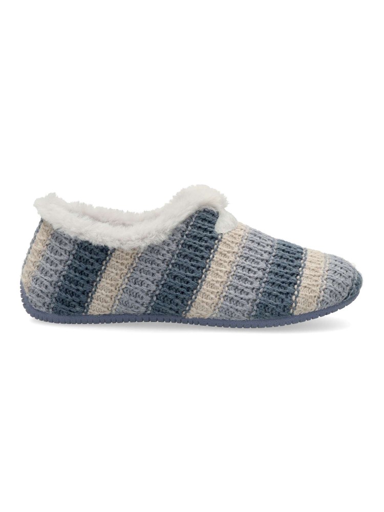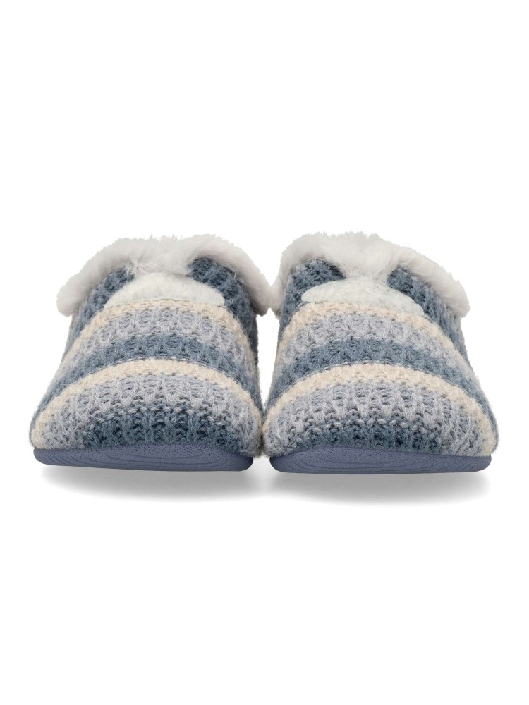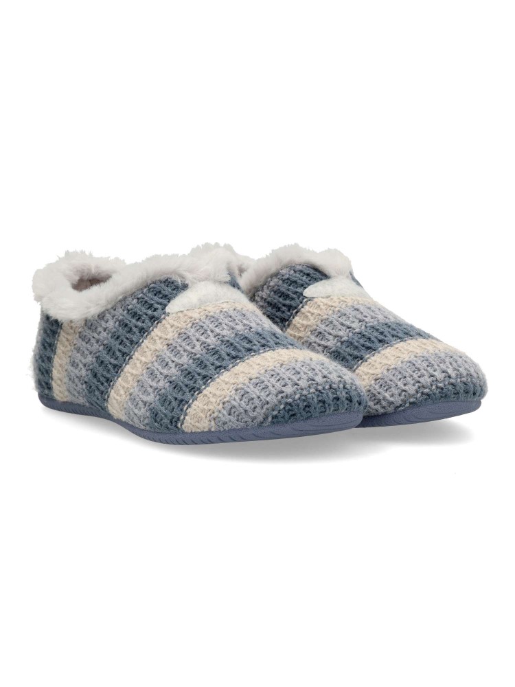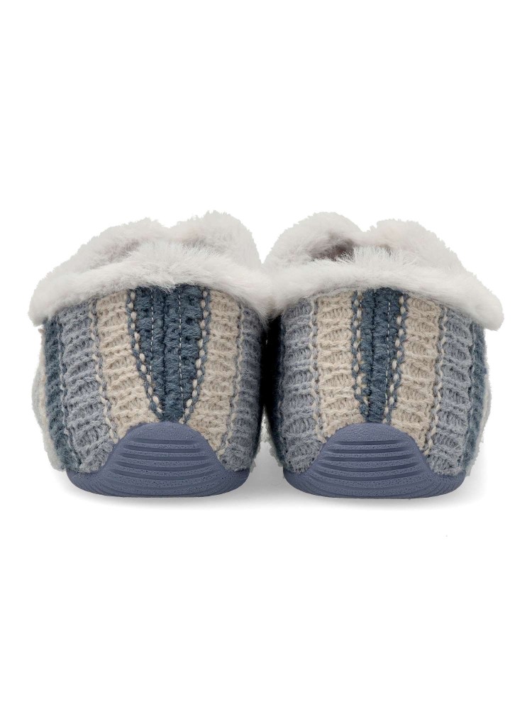Zapatilla de casa para mujer. Modelo cerrado, disponible en color indigo-gris perla. Piso de goma flexible y antideslizante. Plantilla acolchada. Modelo cómodo y abrigado para los días más fríos. LANA NORDICA (CDO. CHAPA - SIN BANDA). Hecho en España.