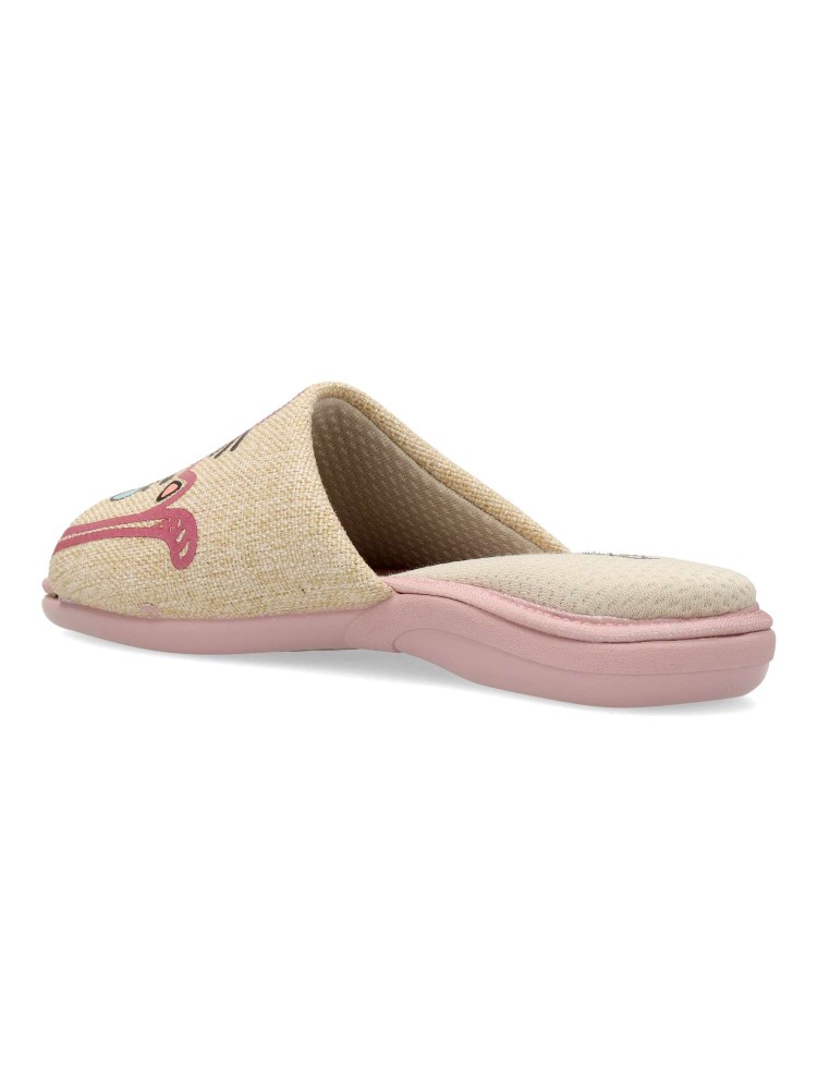 Zapatilla de casa pinki cómoda para mujer. Piso de caucho natural y antideslizantes. Disponible en color beige. Plantilla y forro de fibra de bambú transpirable y absorbente, bactericida natural, protector anti rayos UV y biodegradable. Hecho en España.