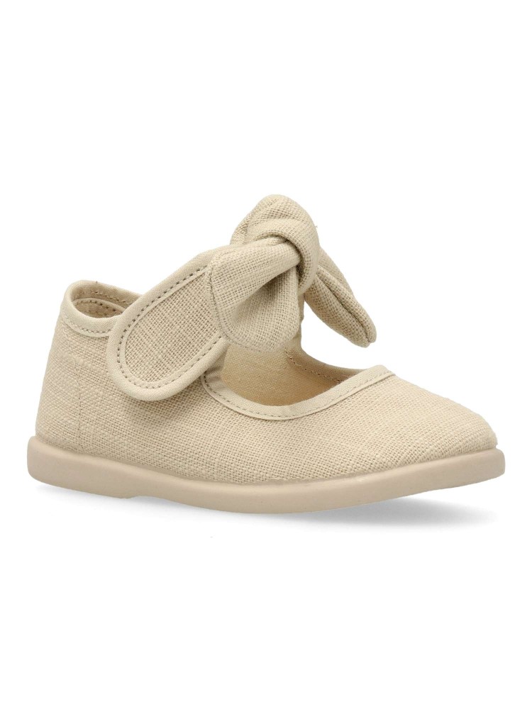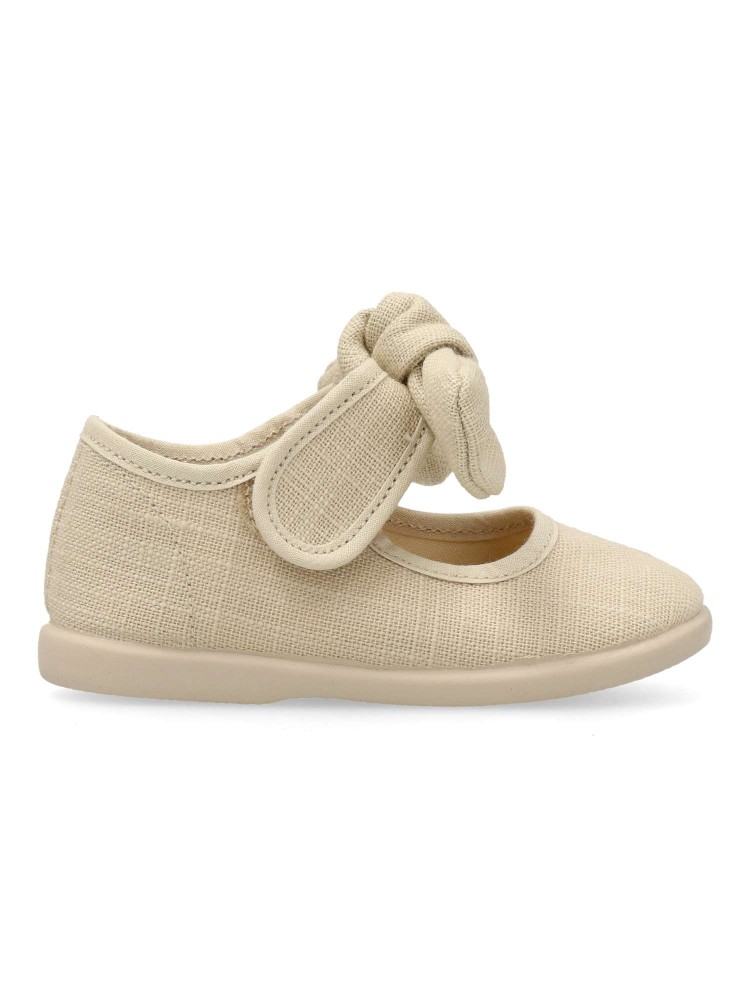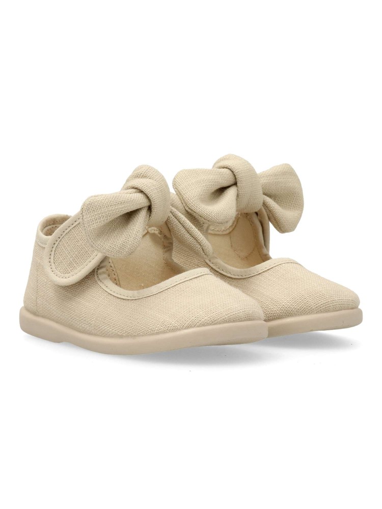 Zapato mercedita de lino para niña. Cierre de velcro. Adorno de lazo. Disponible en color piedra. Fabricado en material textil con suela de caucho natural antideslizante. Lonita arreglada para vestir. Hecho en España. PEKE´S by Vanessa.