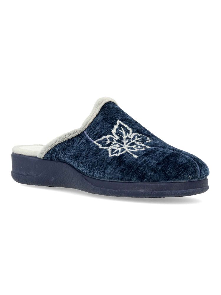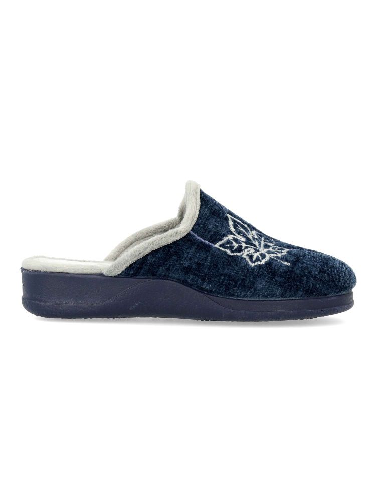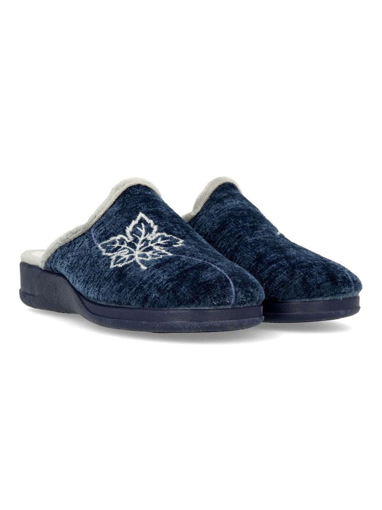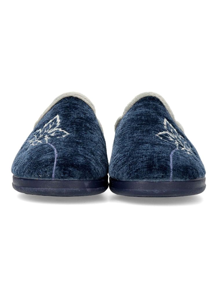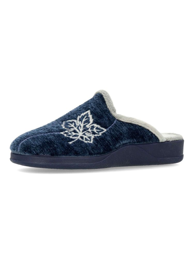 Zapatilla de casa para mujer. Fabricada en textil suave, con suela de caucho antideslizante, flexible y ligera. Plantilla acolchada. Detalle de hoja bordada. Altura 3 cm. Zapatilla que te ofrece confort y te abriga en los días más fríos. Hecho en España.