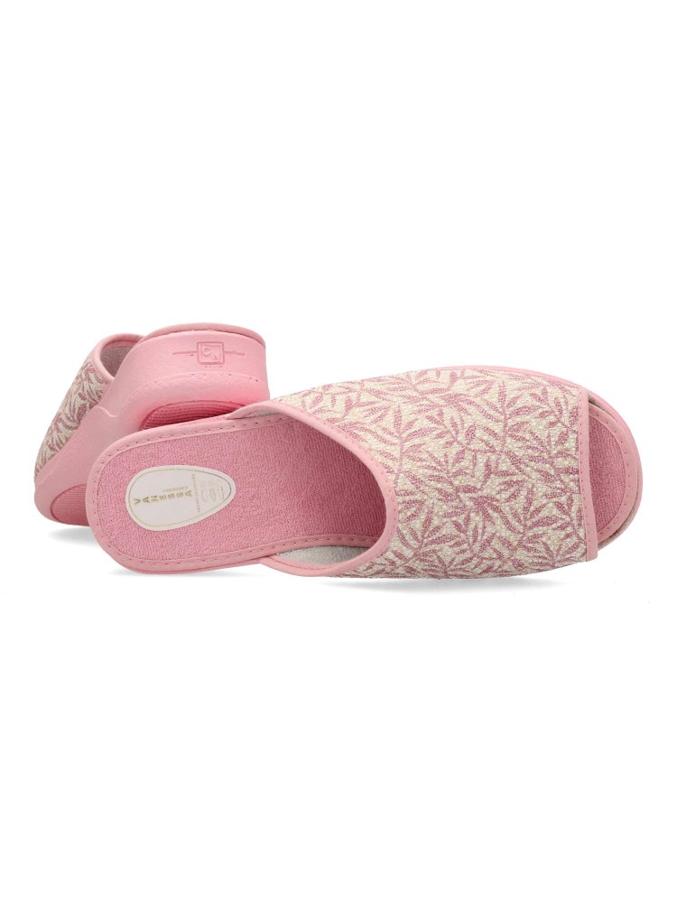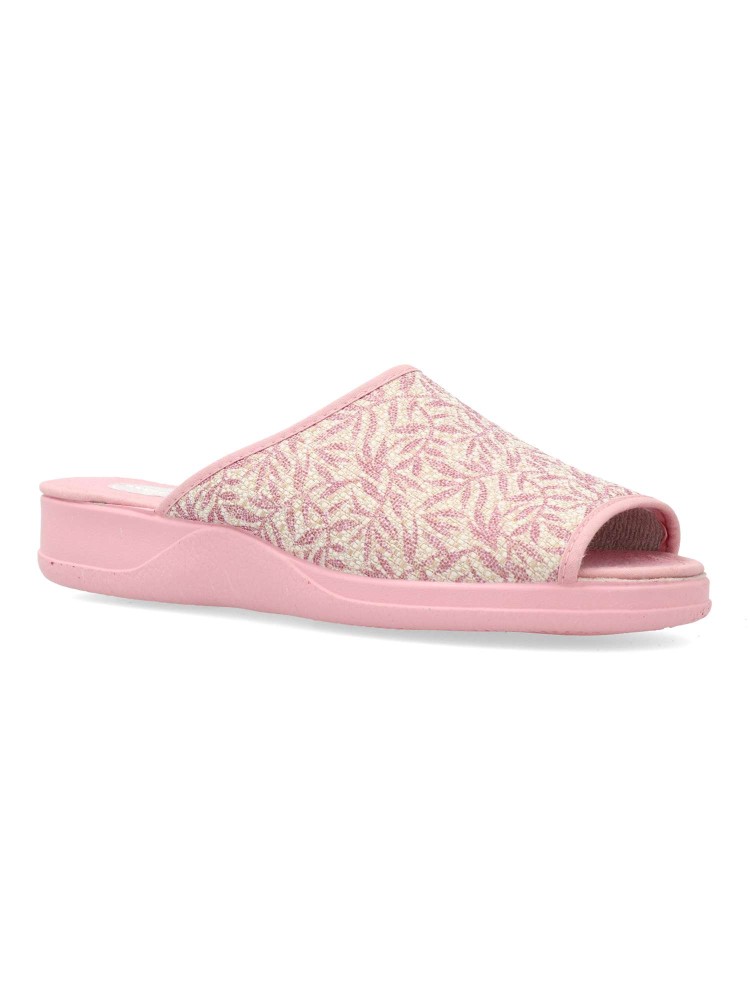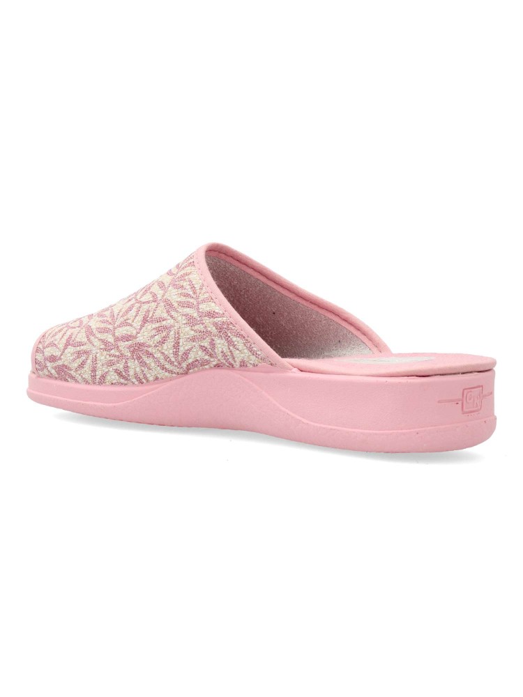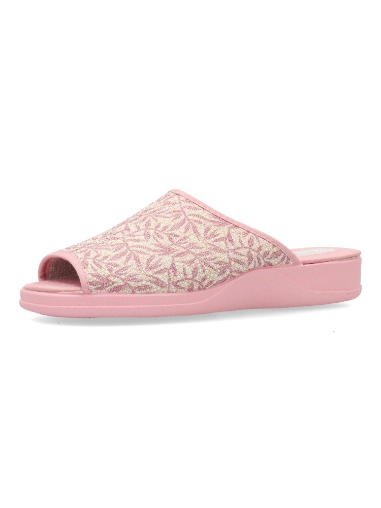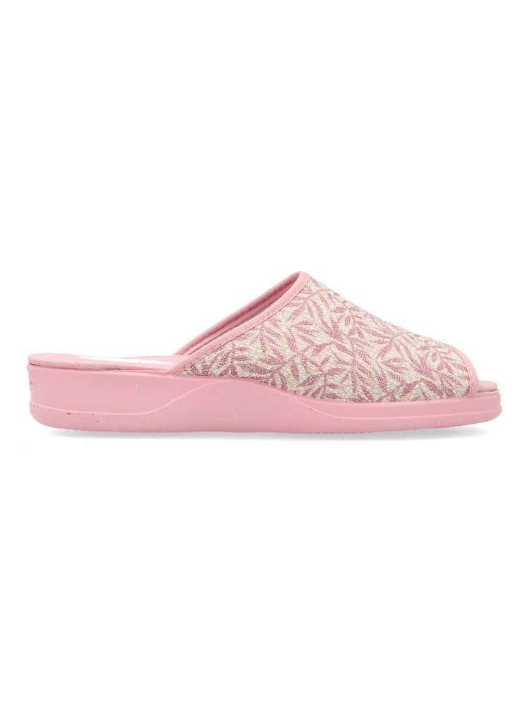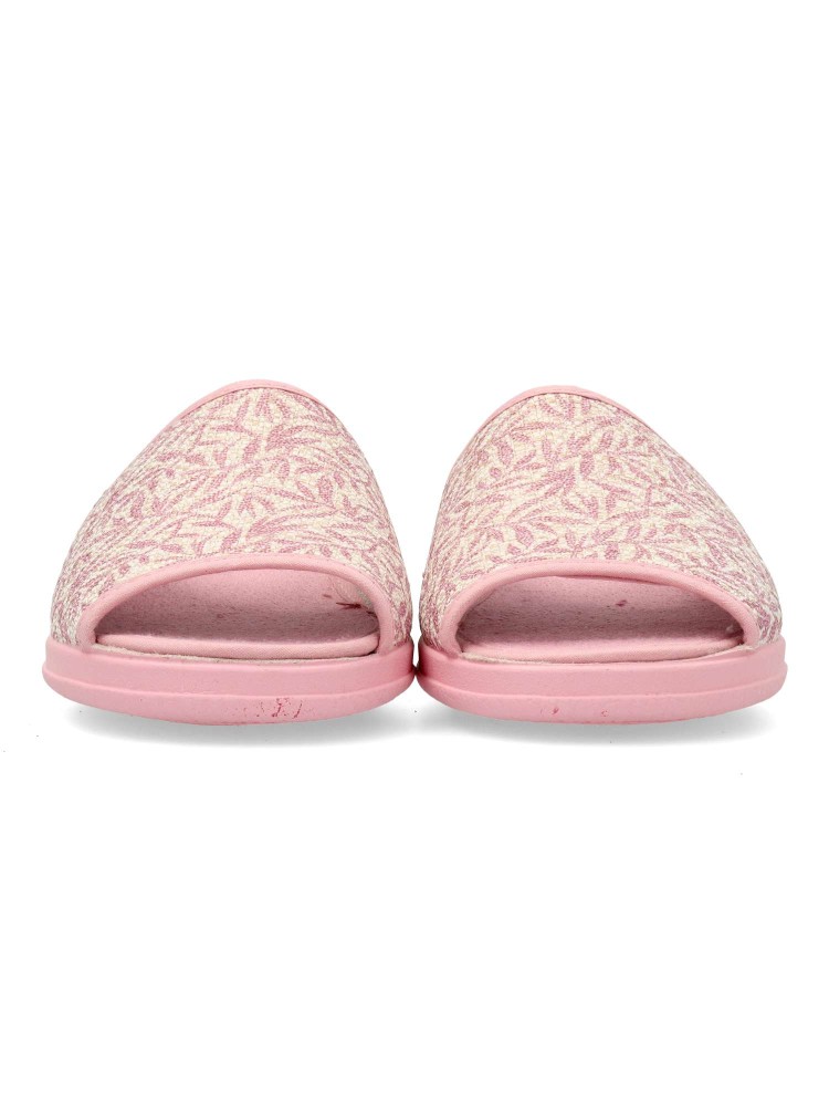 Zapatilla de casa para mujer. Disponible en color rosa. Suela de caucho ligera y flexible. Modelo cómodo fabricado en textil acolchado y suave. Detalle estampado de hojas. Planta acolchada. Puntera descubierta pinki. Hecho en España.