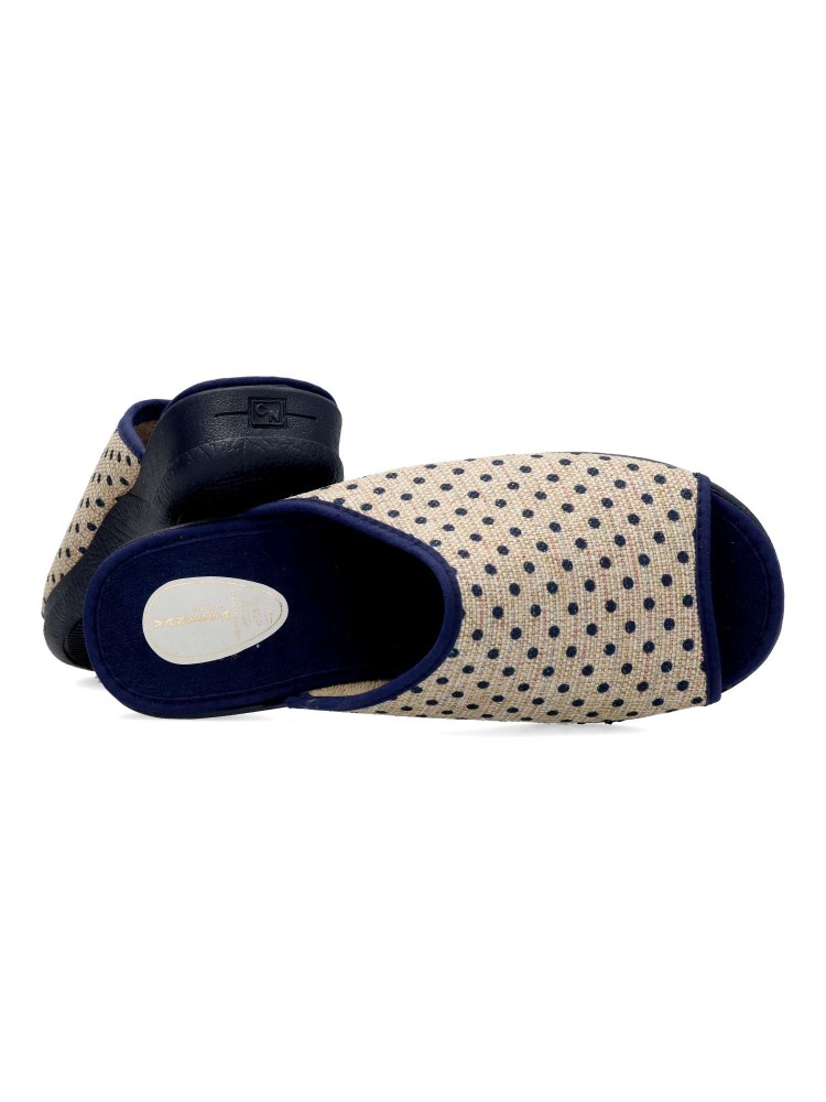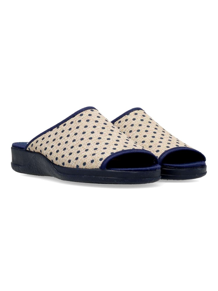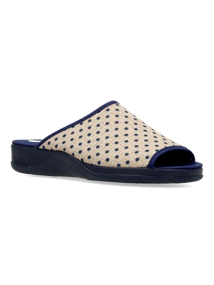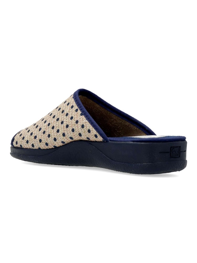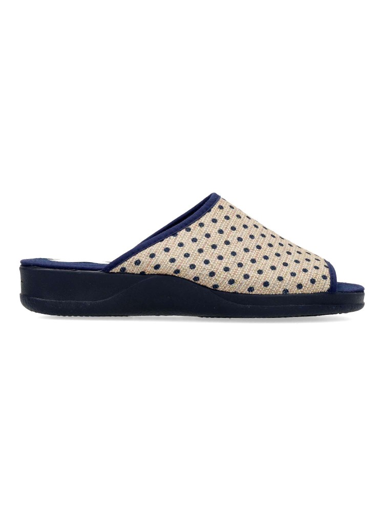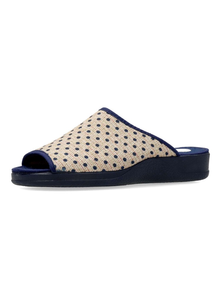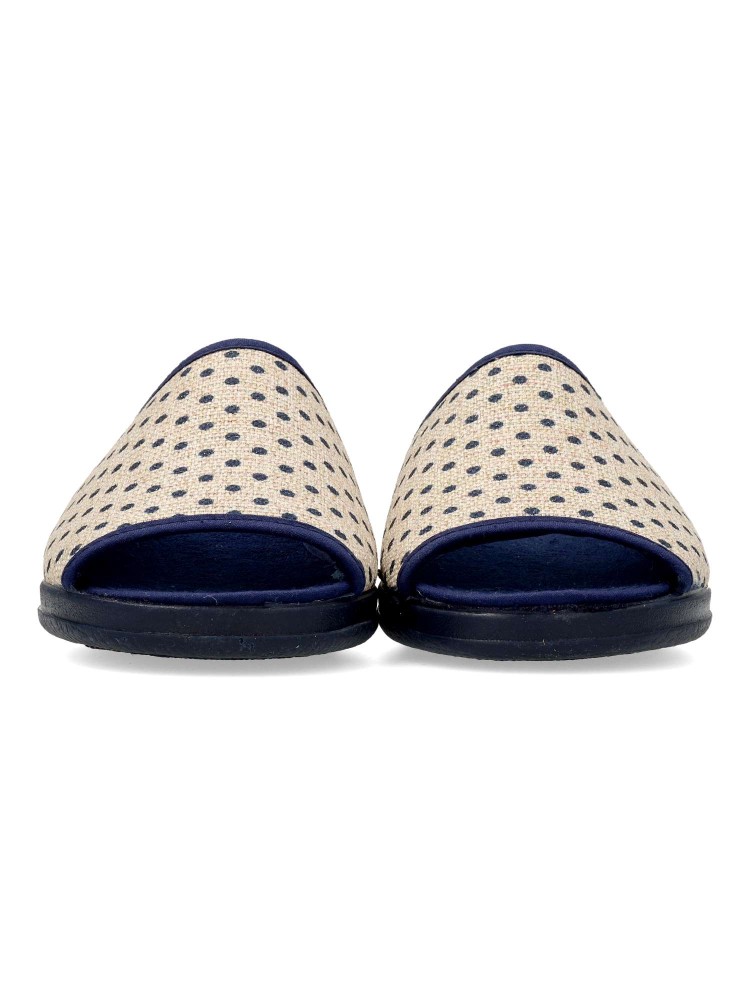 Zapatilla de casa para mujer. Disponible en color marino-beige. Suela de caucho ligera y flexible. Modelo cómodo fabricado en textil acolchado y suave. Detalle estampado puntos. Planta acolchada. Puntera descubierta pinky. Hecho en España.