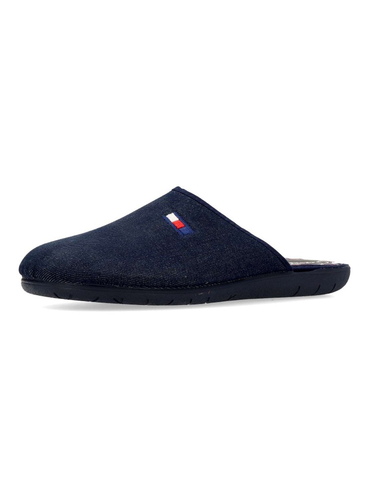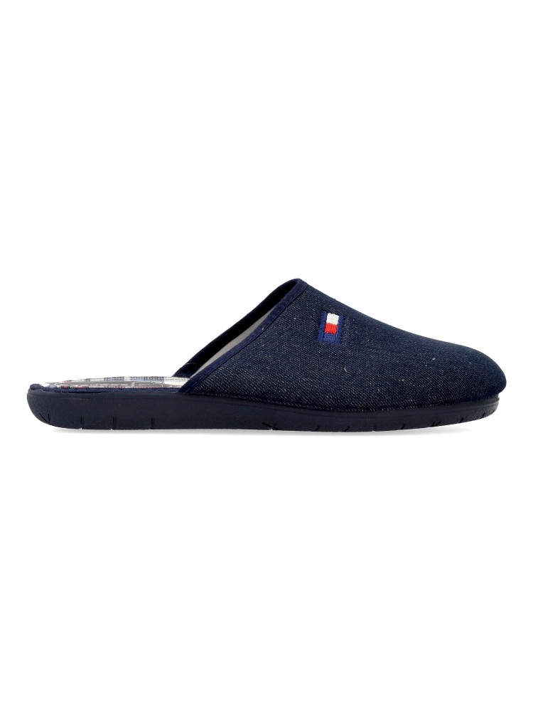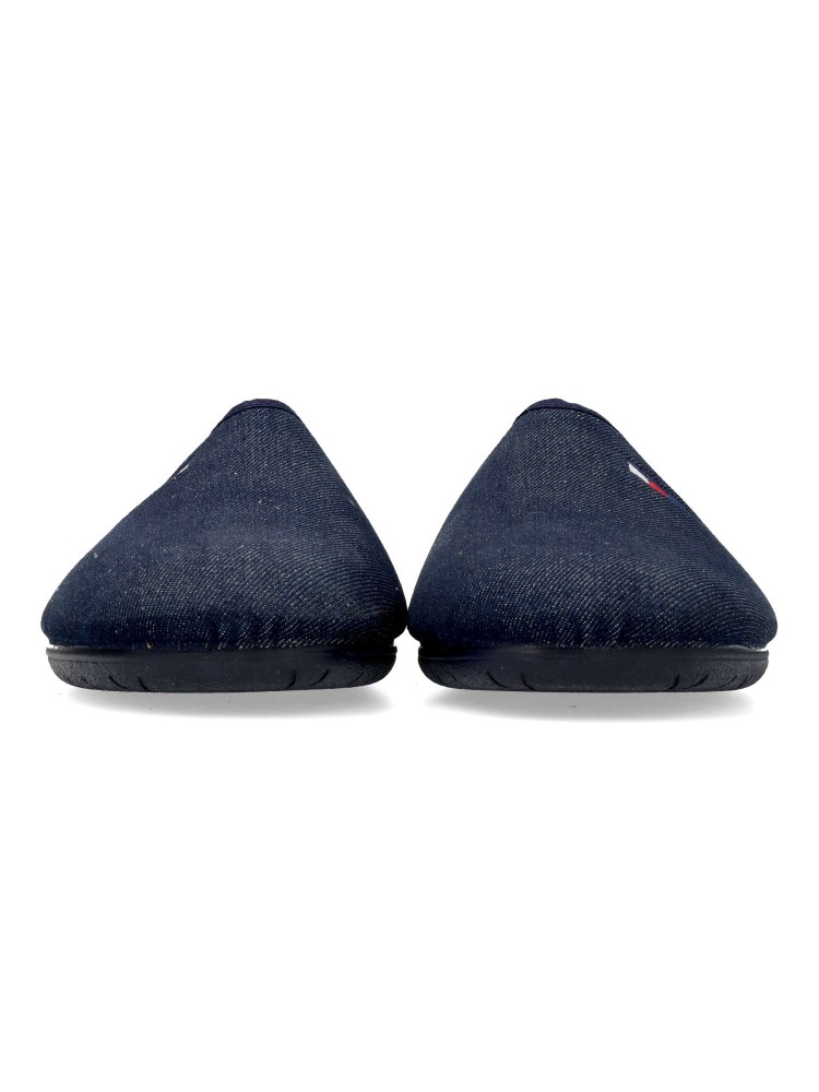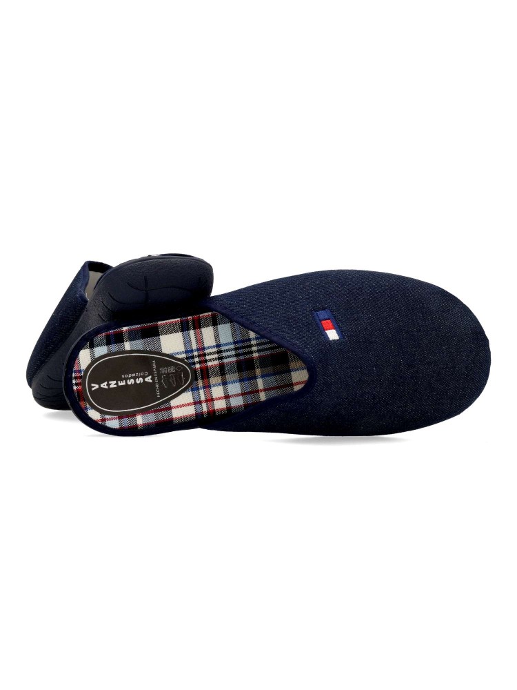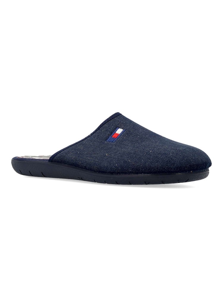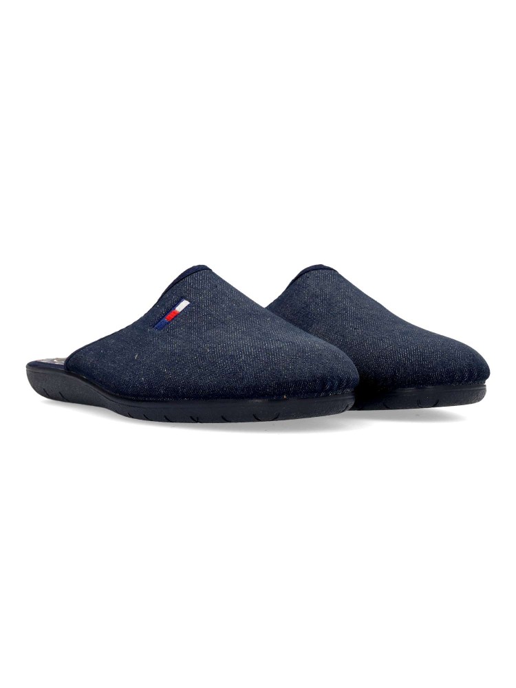 Zapatilla de casa para hombre. Disponible en color tejano. Suela de goma flexible. Planta acolchada. Modelo cómodo fabricado en textil acolchado suave. Detalle bandera bordada. Máximo confort en tu descanso diario. Hecho en España. Vanessa Calzados.