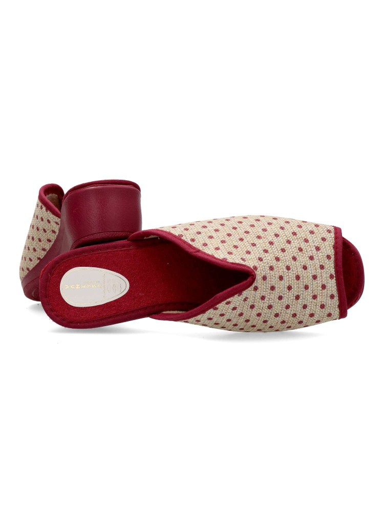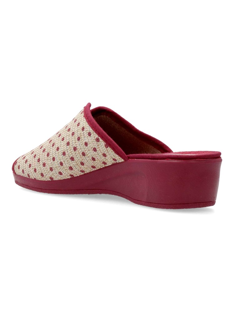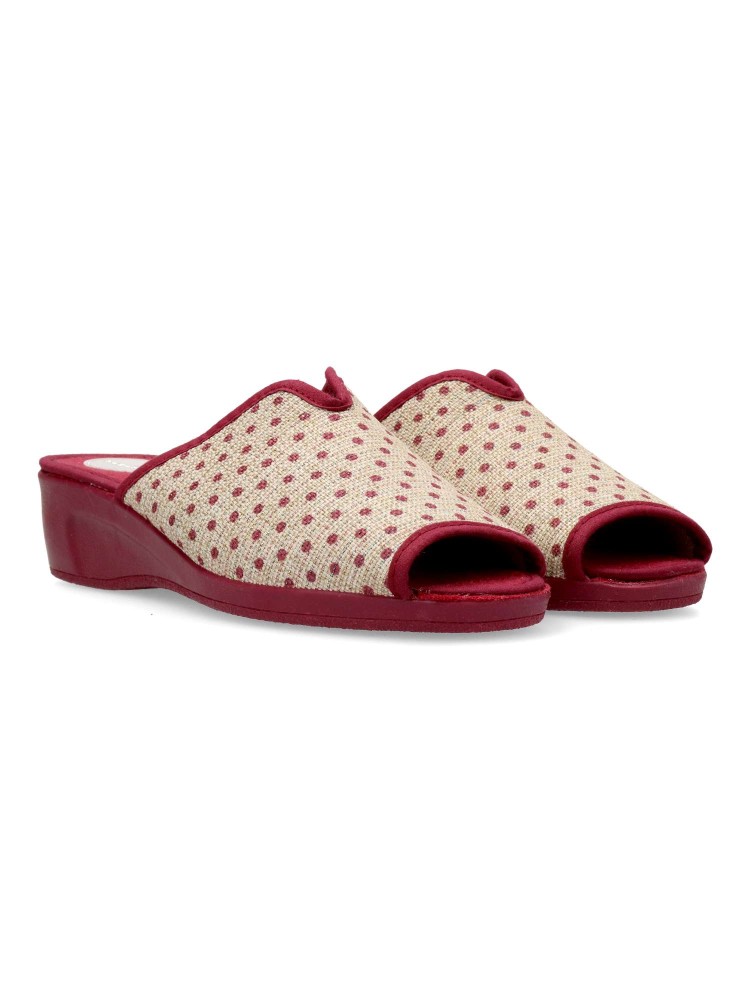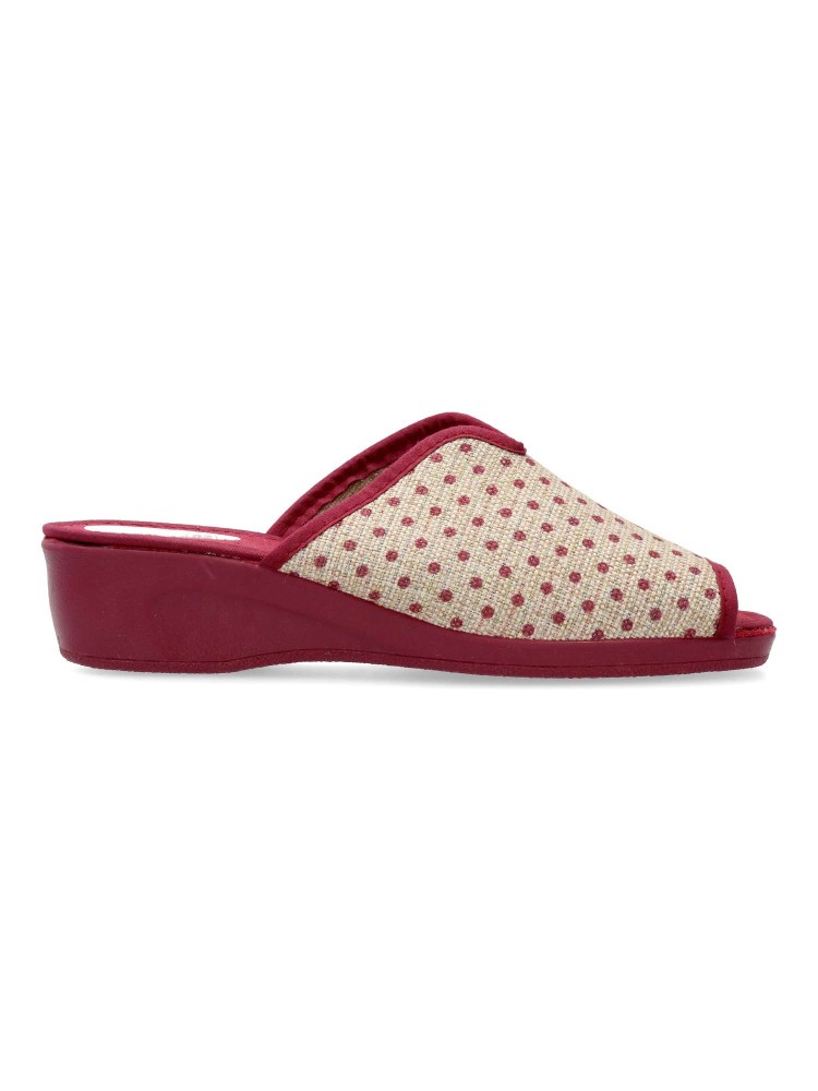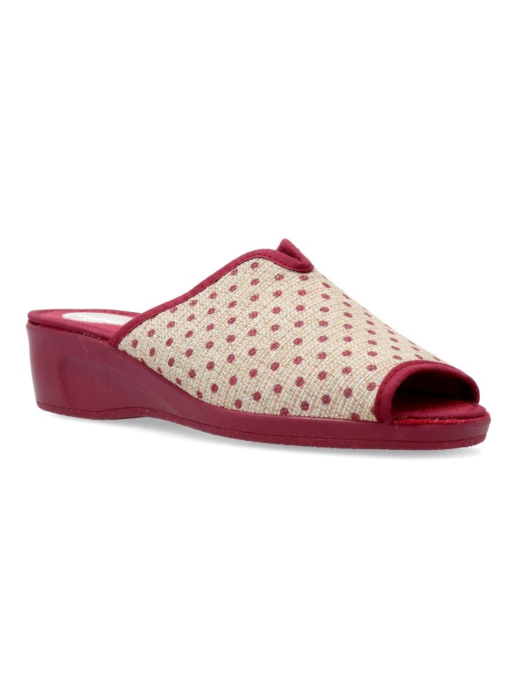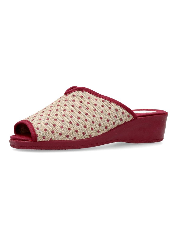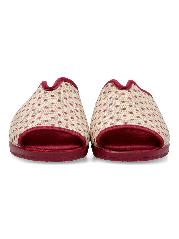 Zapatilla de casa para mujer. Disponible en color burdeos-beige. Suela de caucho ligera y flexible. Modelo cómodo fabricado en textil acolchado y suave. Detalle estampado puntos y brillo. Planta acolchada. Puntera descubierta pinky. Hecho en España.