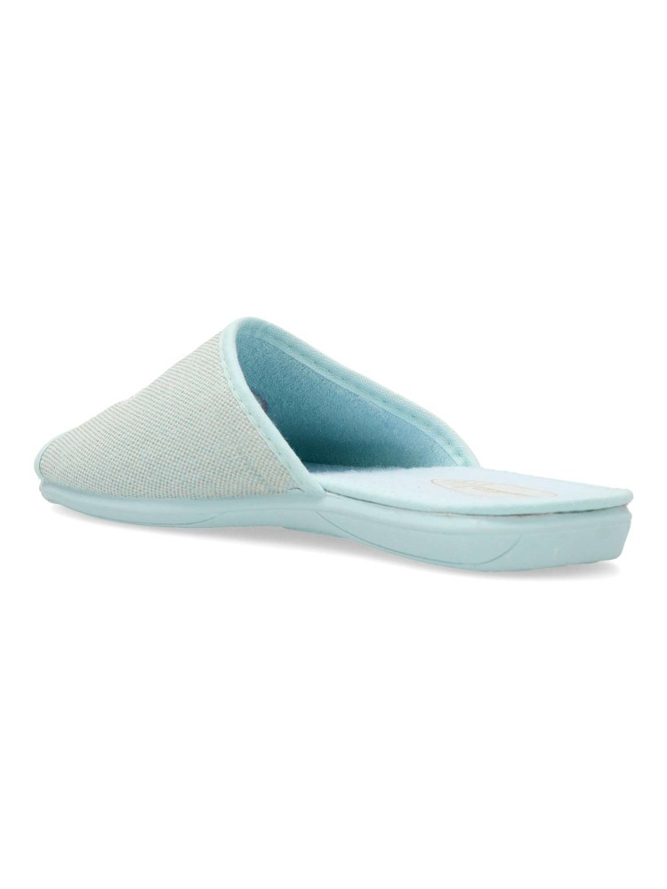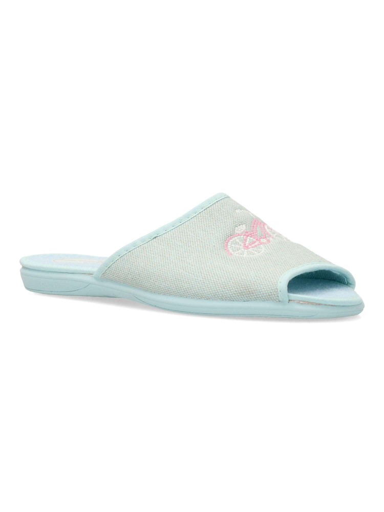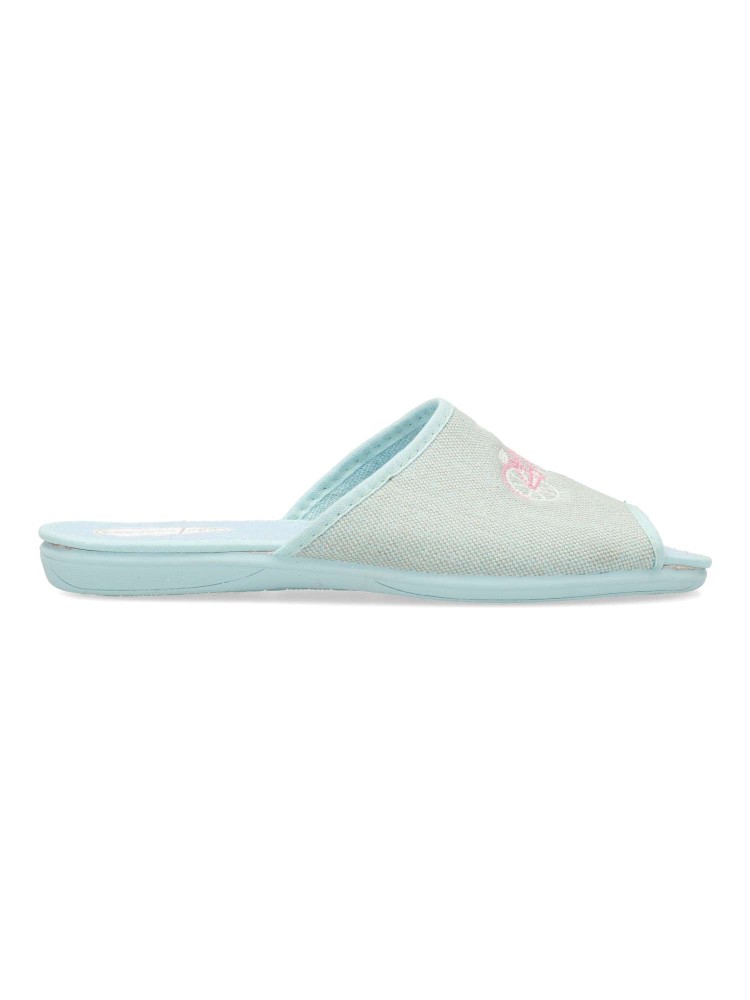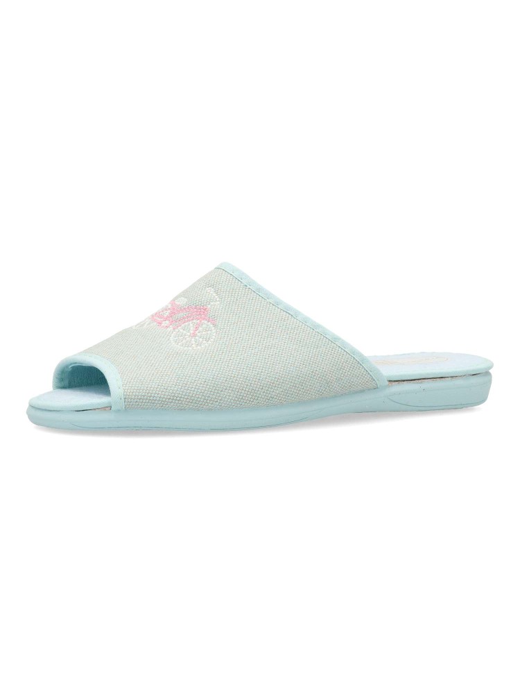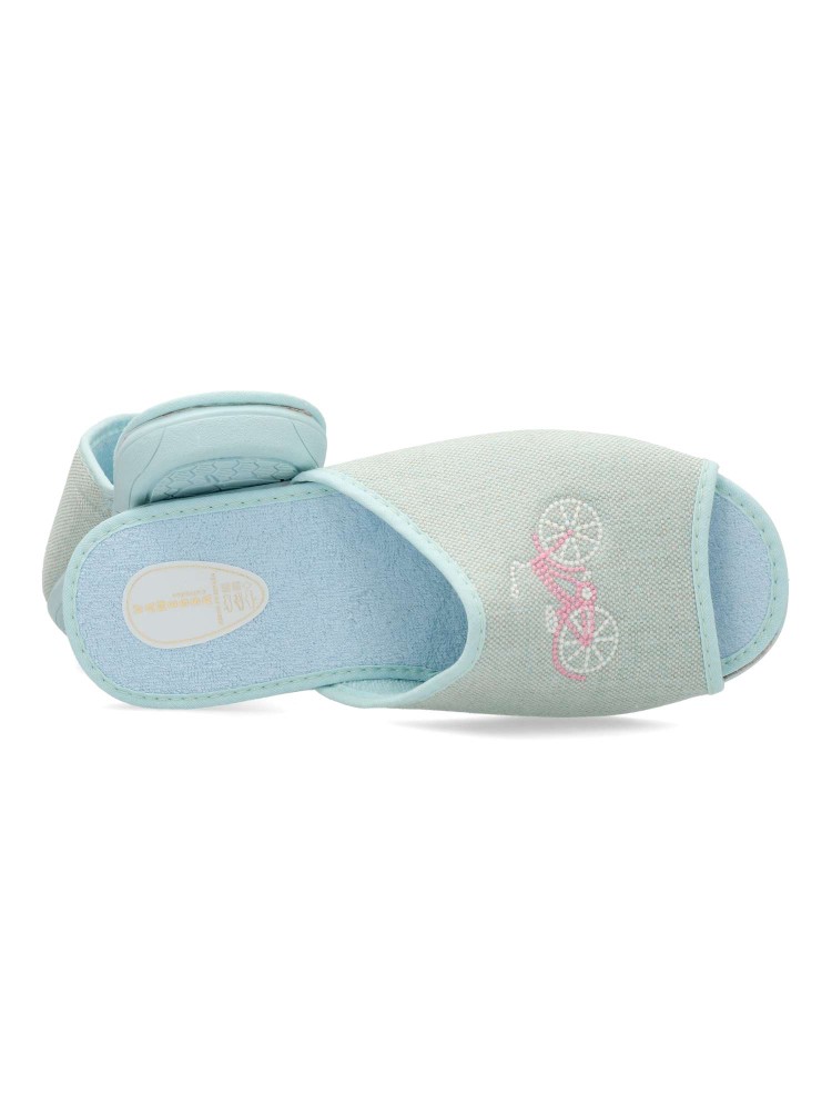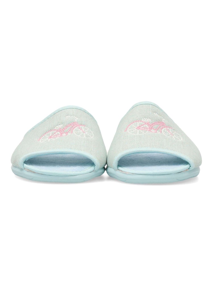 Zapatilla de casa para mujer. Disponible en color verde. Suela de caucho ligera y flexible. Modelo cómodo fabricado en textil acolchado y suave. Detalle bicicleta bordada. Planta acolchada. Puntera descubierta pinky. Hecho en España.
