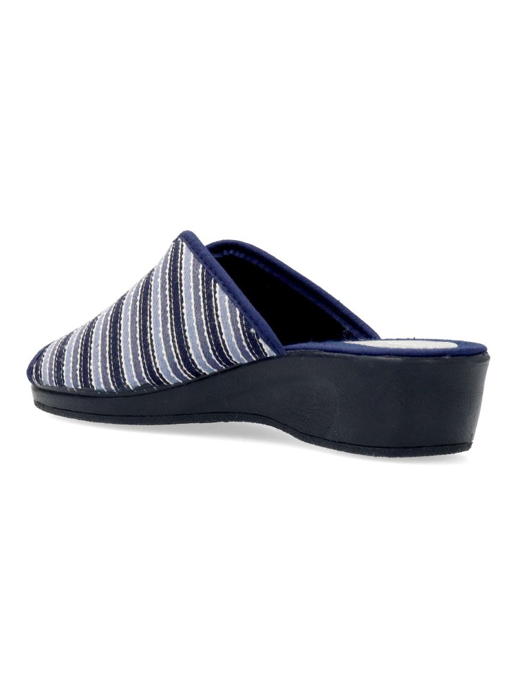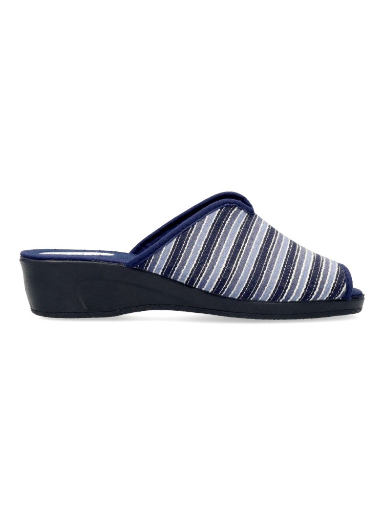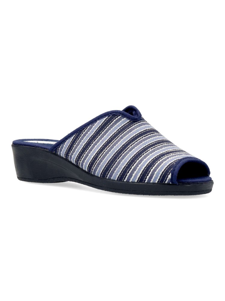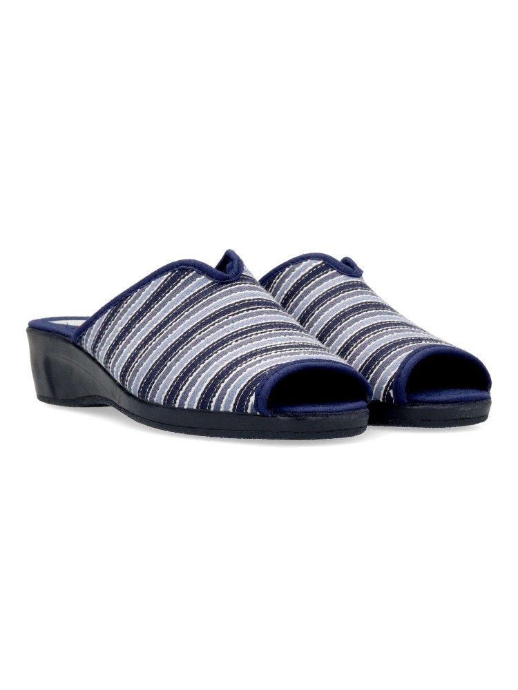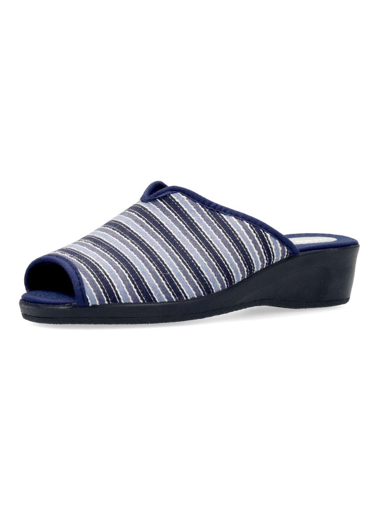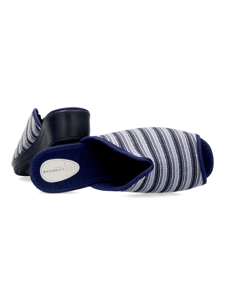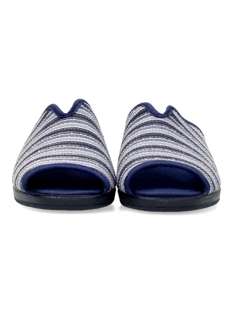 Zapatilla de casa para mujer. Disponible en color marino rayas. Suela de caucho ligera y flexible. Modelo cómodo fabricado en textil acolchado y suave. Planta acolchada. Puntera descubierta pinky. Hecho en España.
