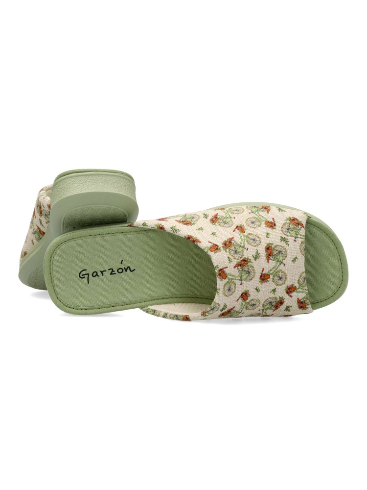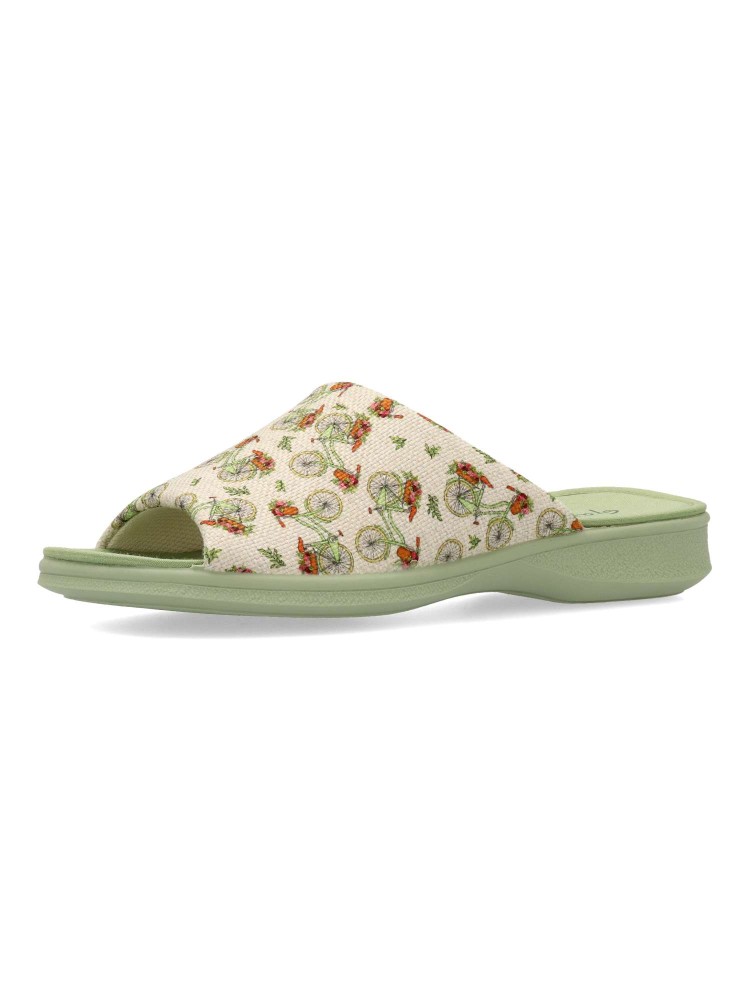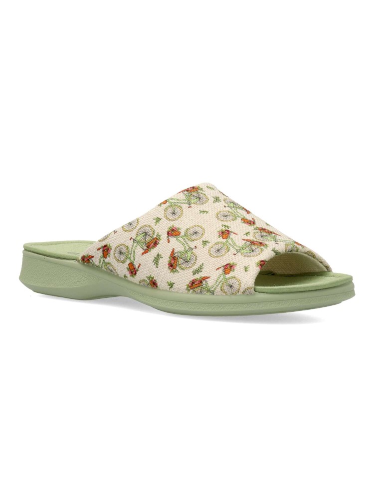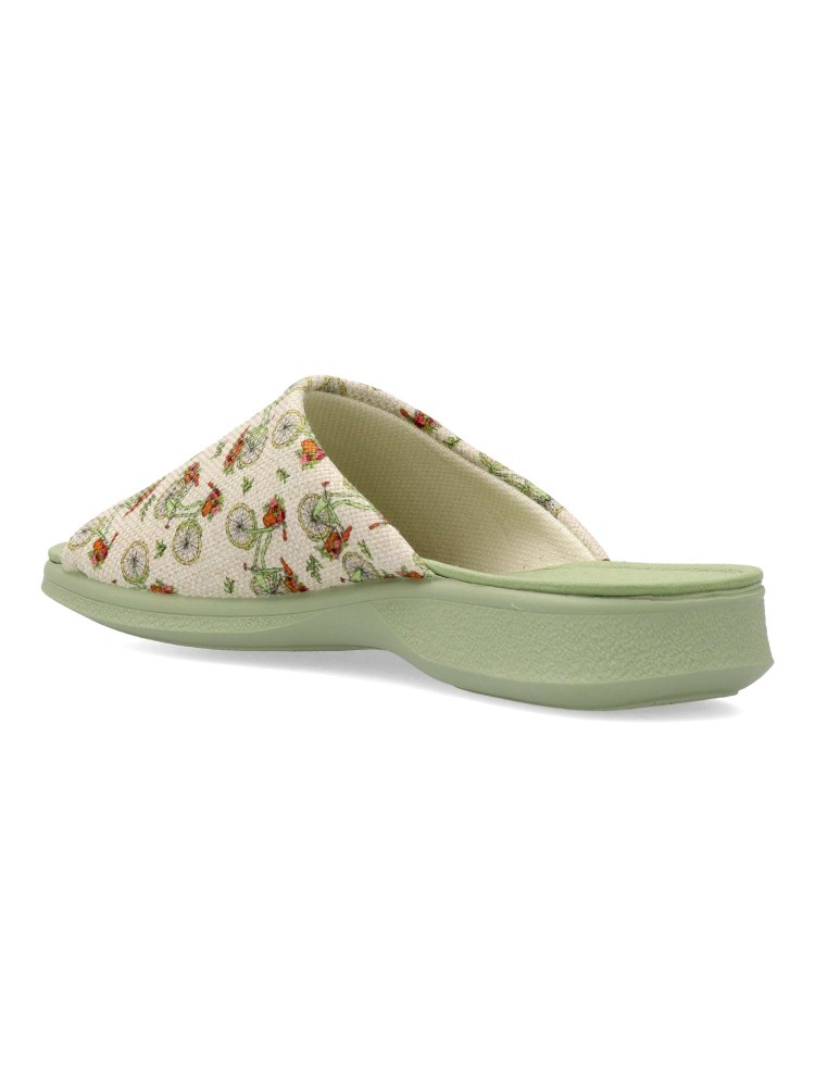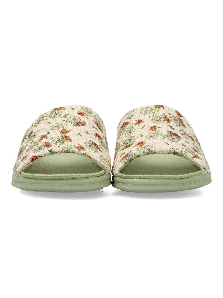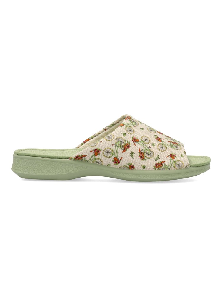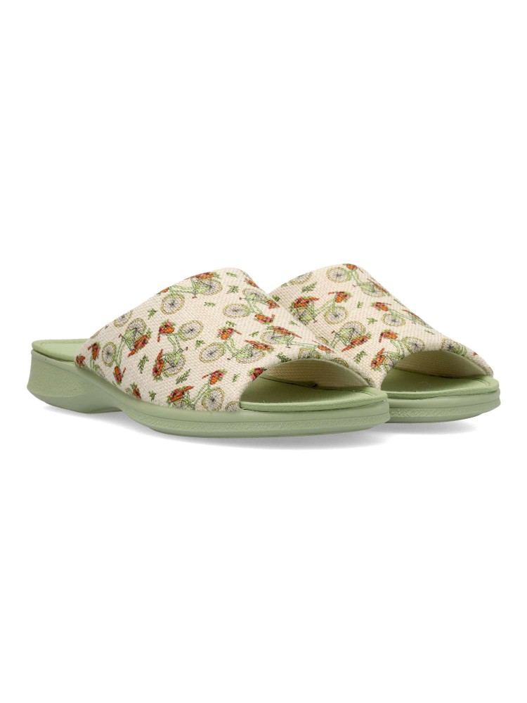 Zapatilla de casa confort para mujer. Disponible en color verde-beige. Estampado bicicletas (Chinela invertida). Puntera descubierta. Modelo cómodo fabricado en textil, con piso de goma antideslizante. Planta acolchada. Hecho en España.