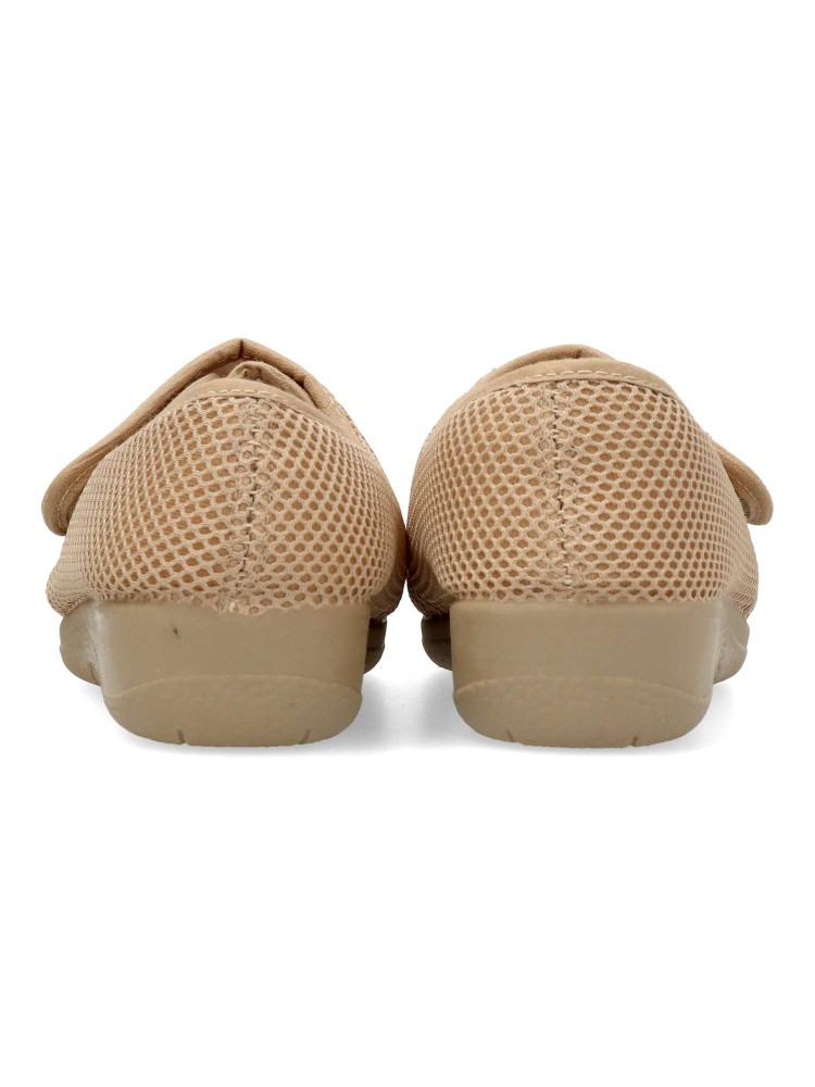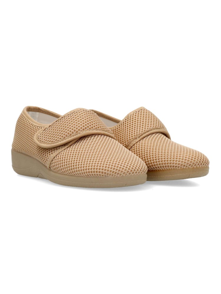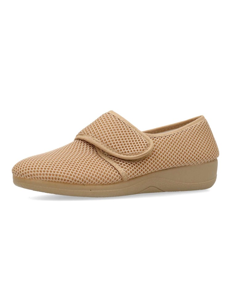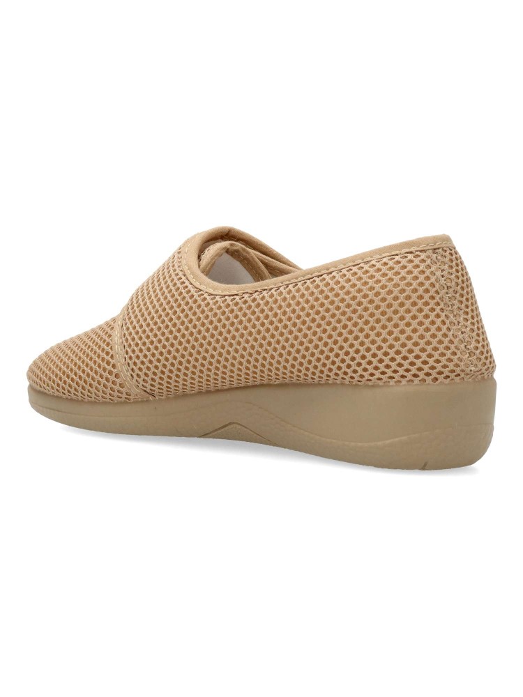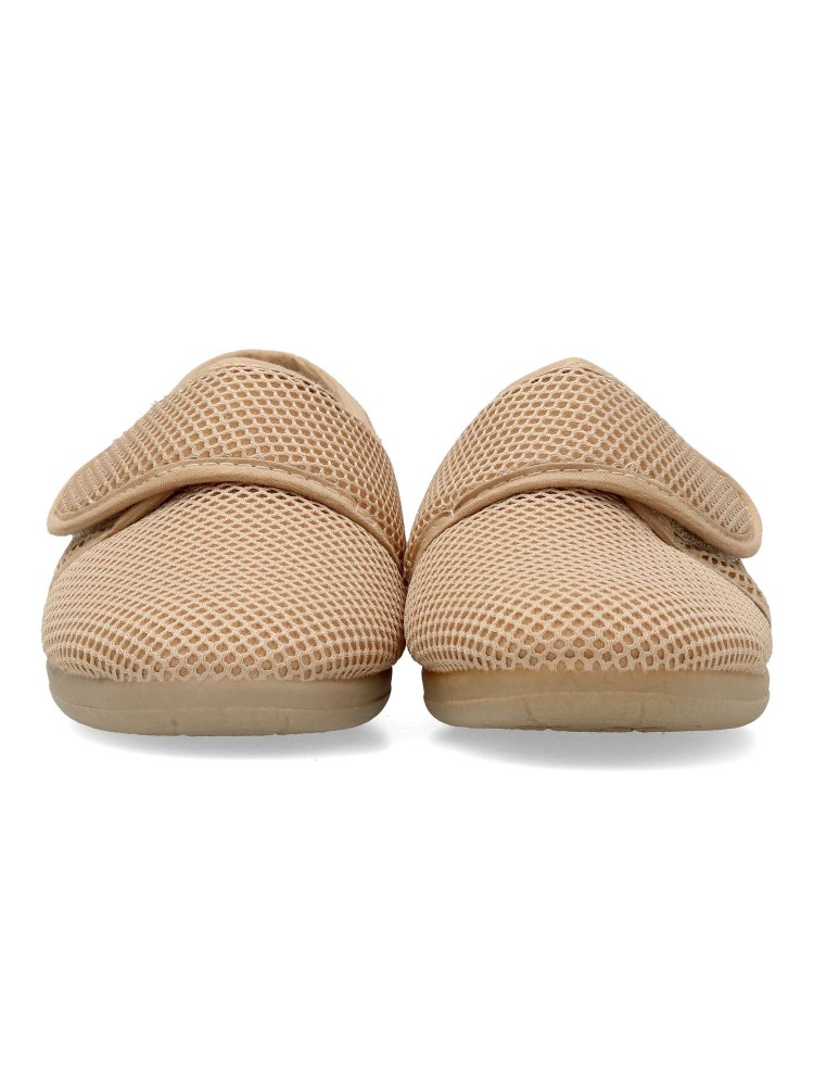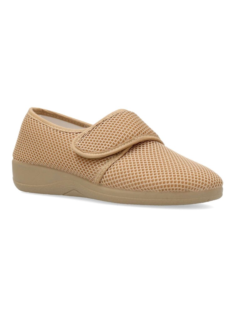 Zapatilla cerrada confort, con tira adherente ajustable. Suela de goma flexible. Plantilla acolchada. Fabricada en textil rejilla suave y transpirable. Disponible en color beige. Pequeña cuña de 3 cm. Máximo confort en tu descanso diario. Hecho en España.