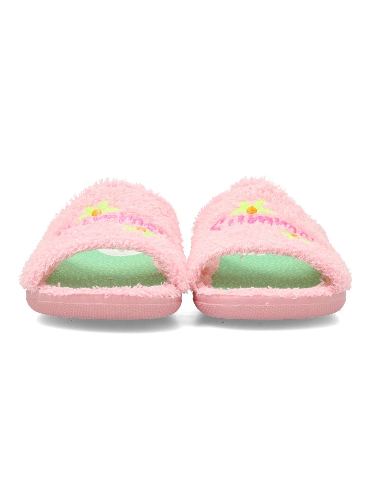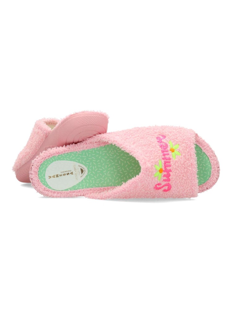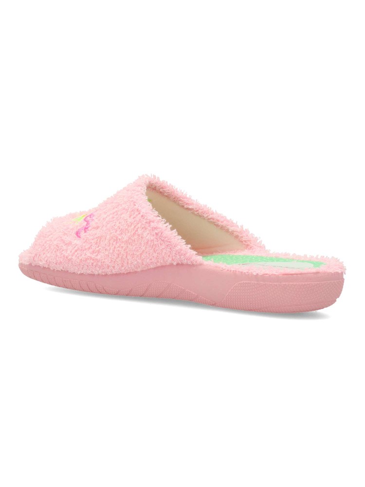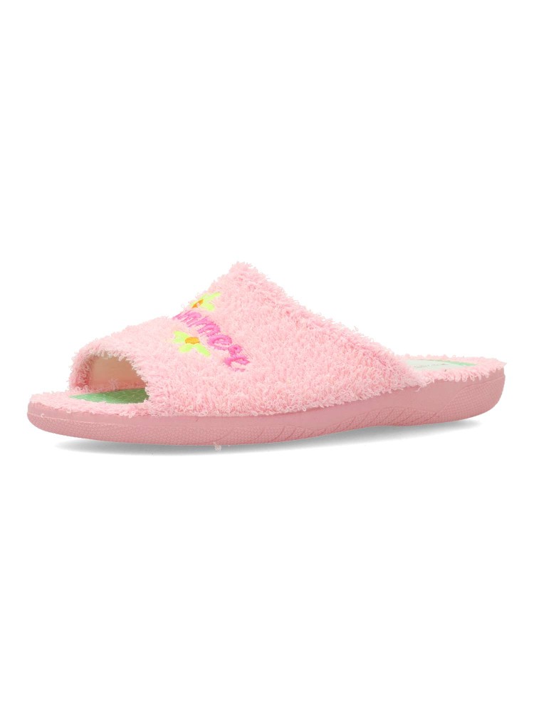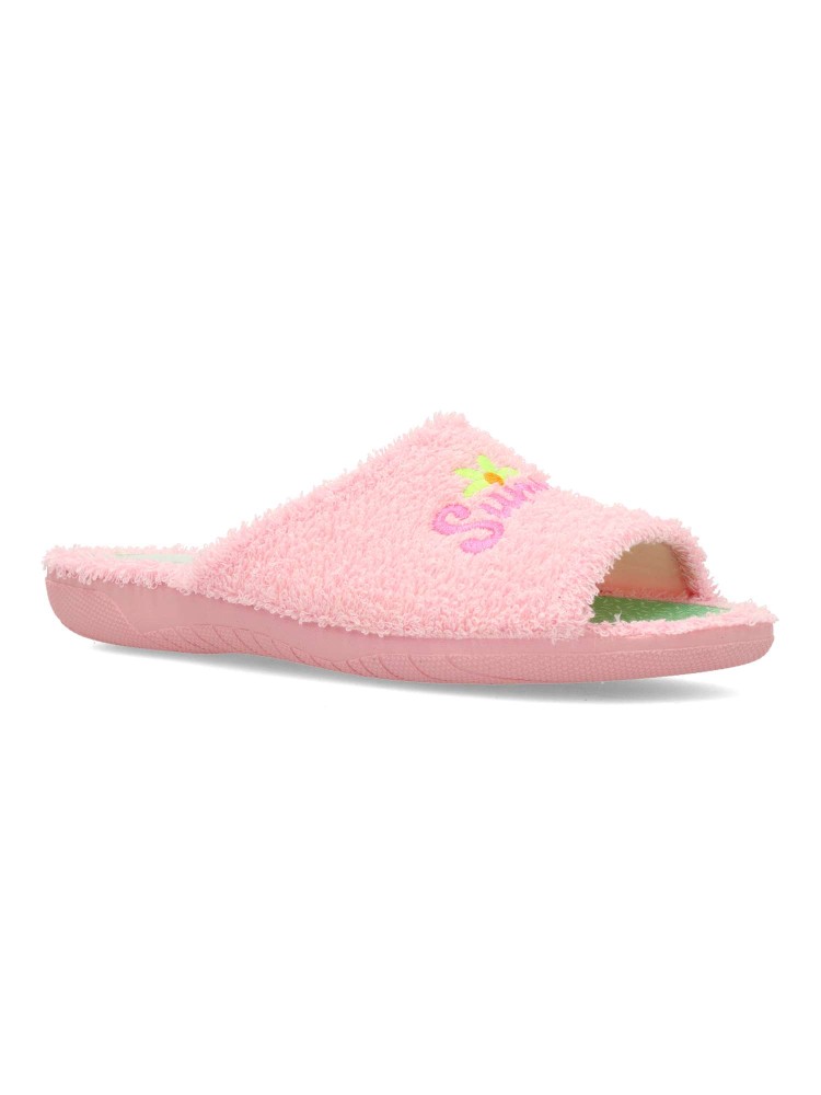 Zapatilla de casa para mujer. Disponible en color rosa con original bordado. Suela de goma flexible. Modelo cómodo fabricado en textil rizo toalla. Plantilla acolchada. Puntera descubierta. Máximo confort en tu descanso diario. Hecho en España.