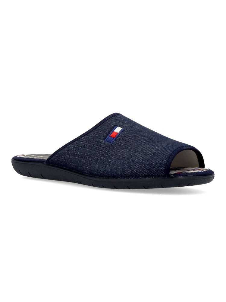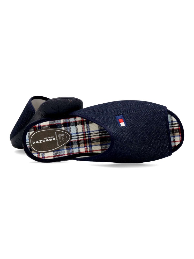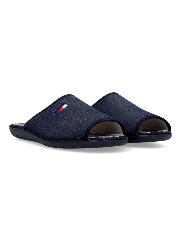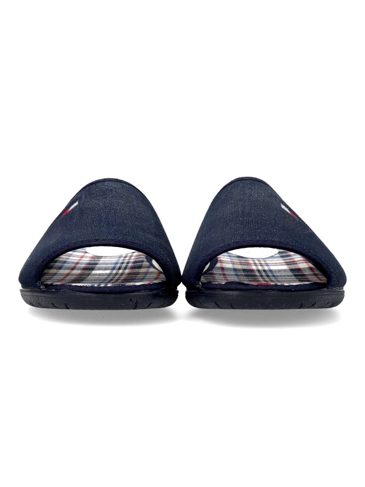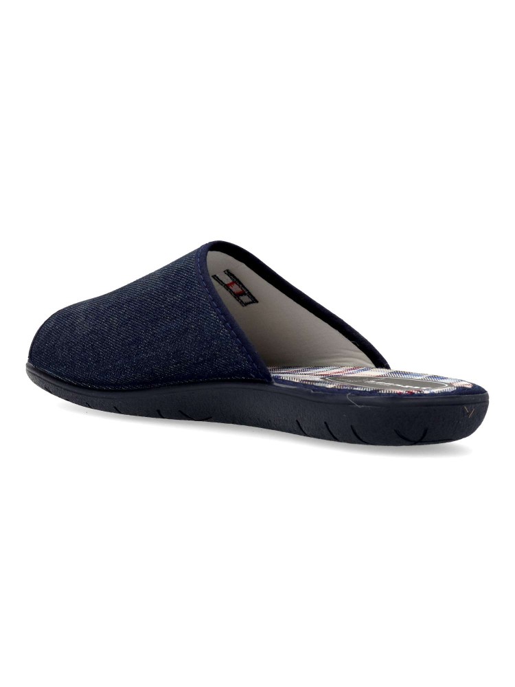 Zapatilla de casa para hombre. Disponible en color tejano. Suela de goma flexible. Planta acolchada. Modelo cómodo fabricado en textil. Puntera descubierta pinki. Detalle bandera bordada. Máximo confort en tu descanso diario. Hecho en España.