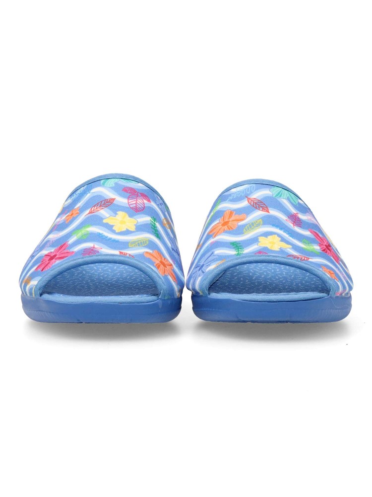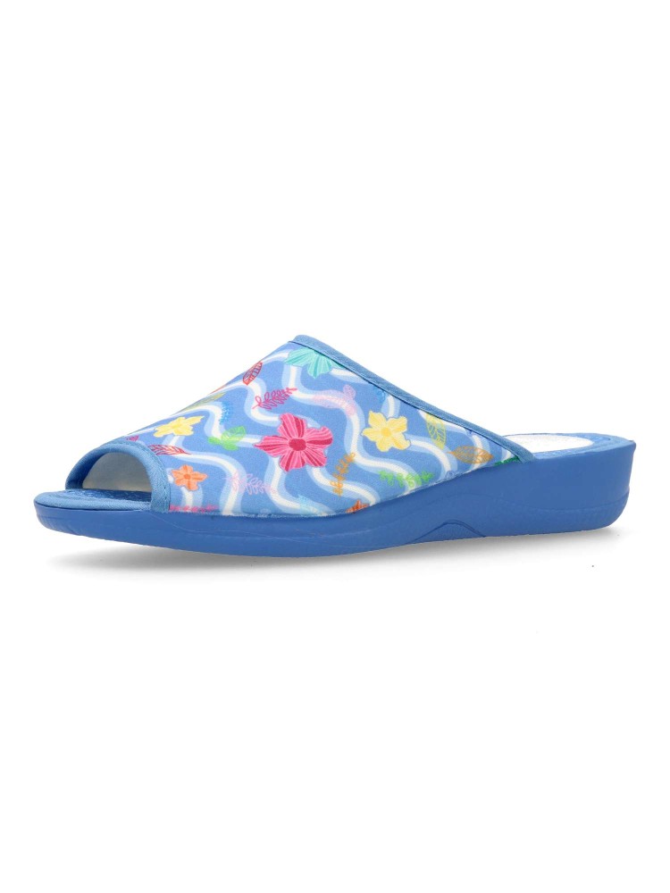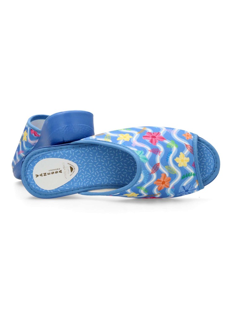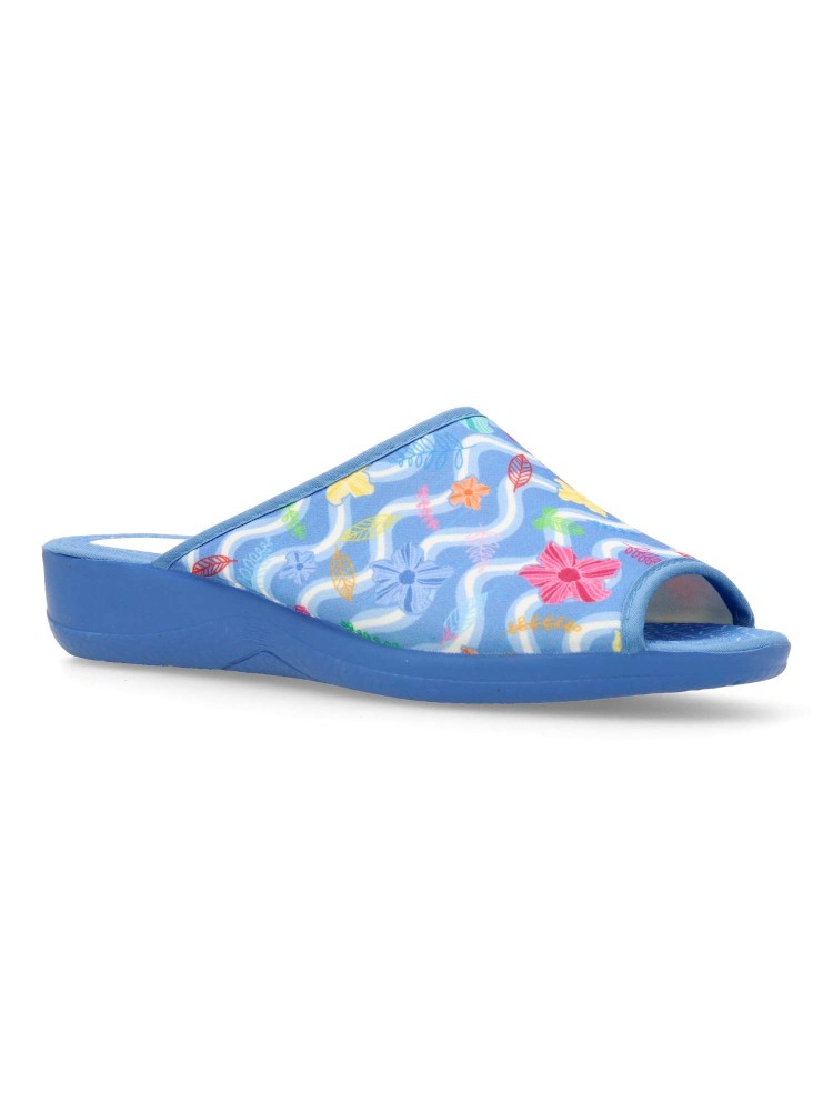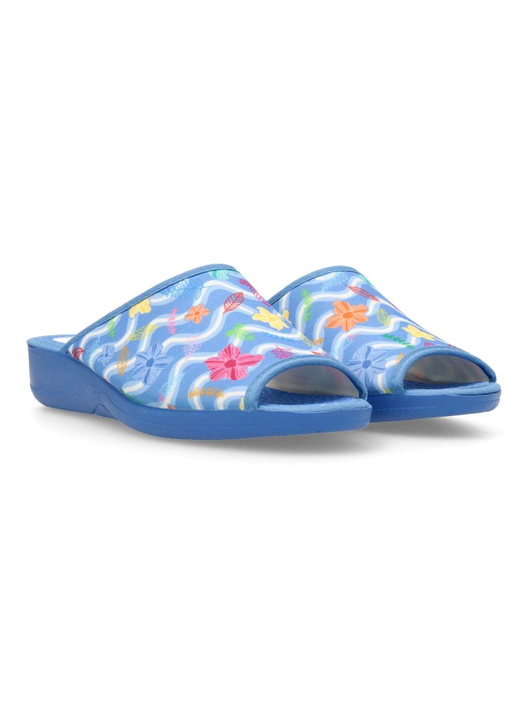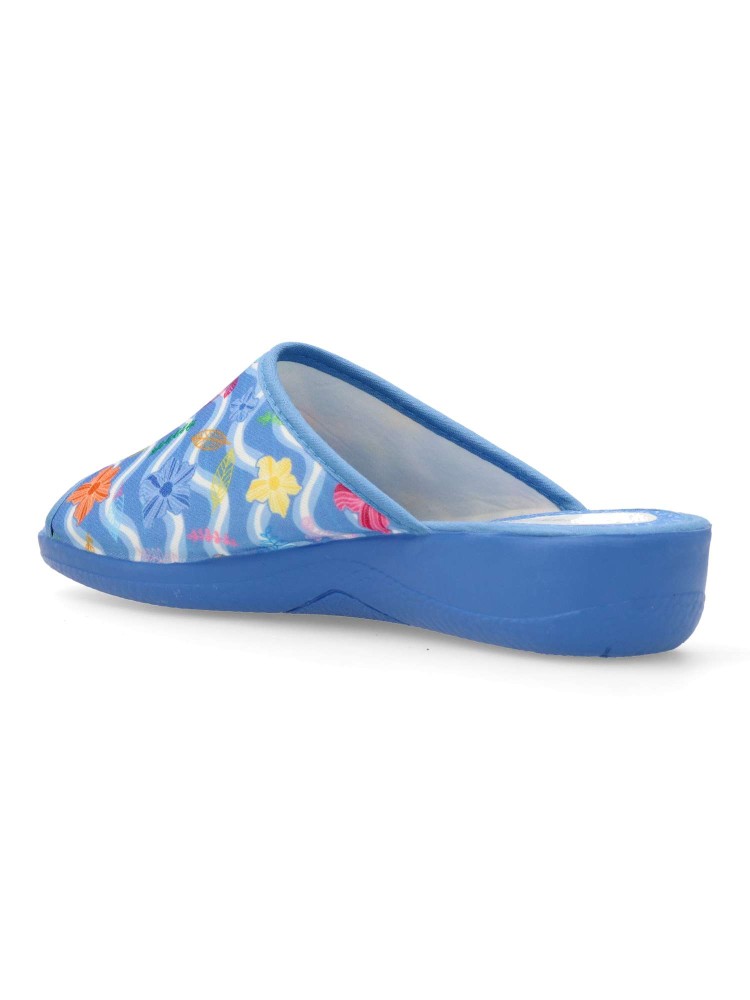 Zapatilla de casa para mujer. Color azulón. Suela de goma ligera y flexible. Modelo cómodo fabricado en textil acolchado. Plantilla acolchada. Estampado de flores decorativo. Puntera descubierta pinki. Altura cuña 3 cm. Hecho en España.
