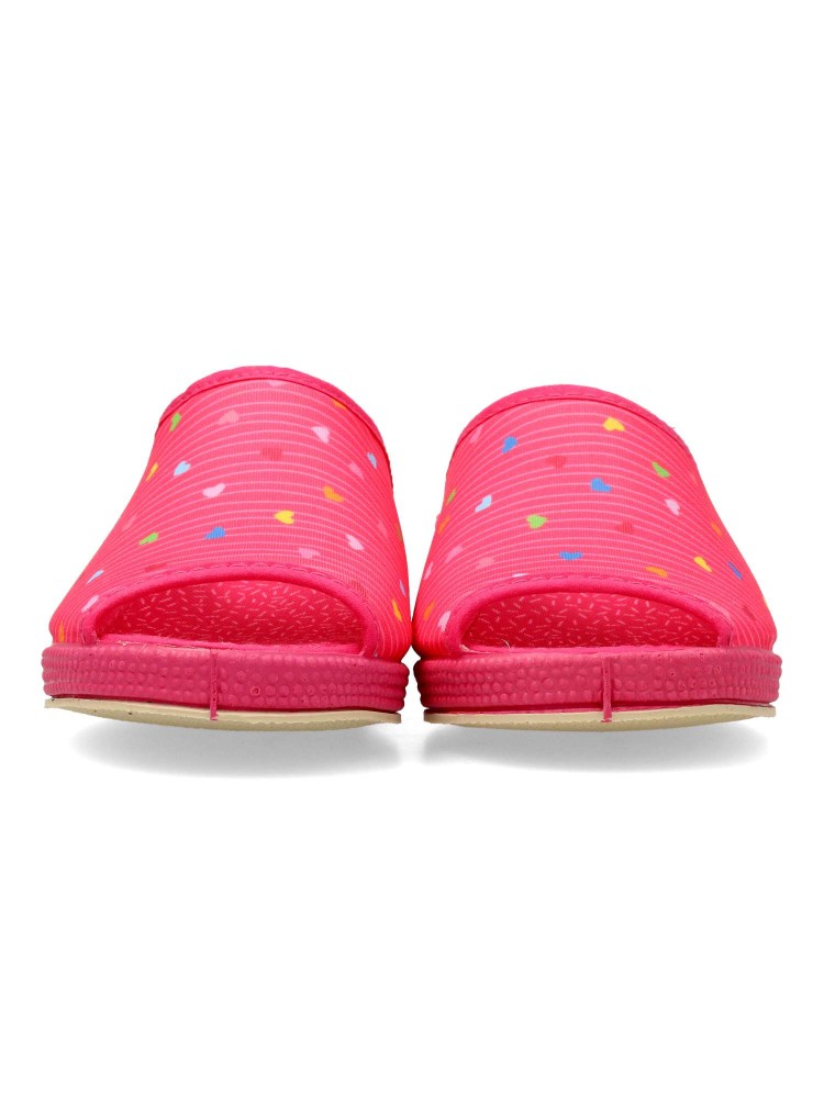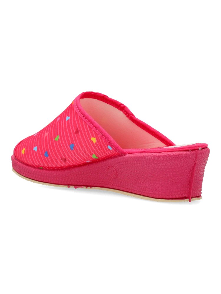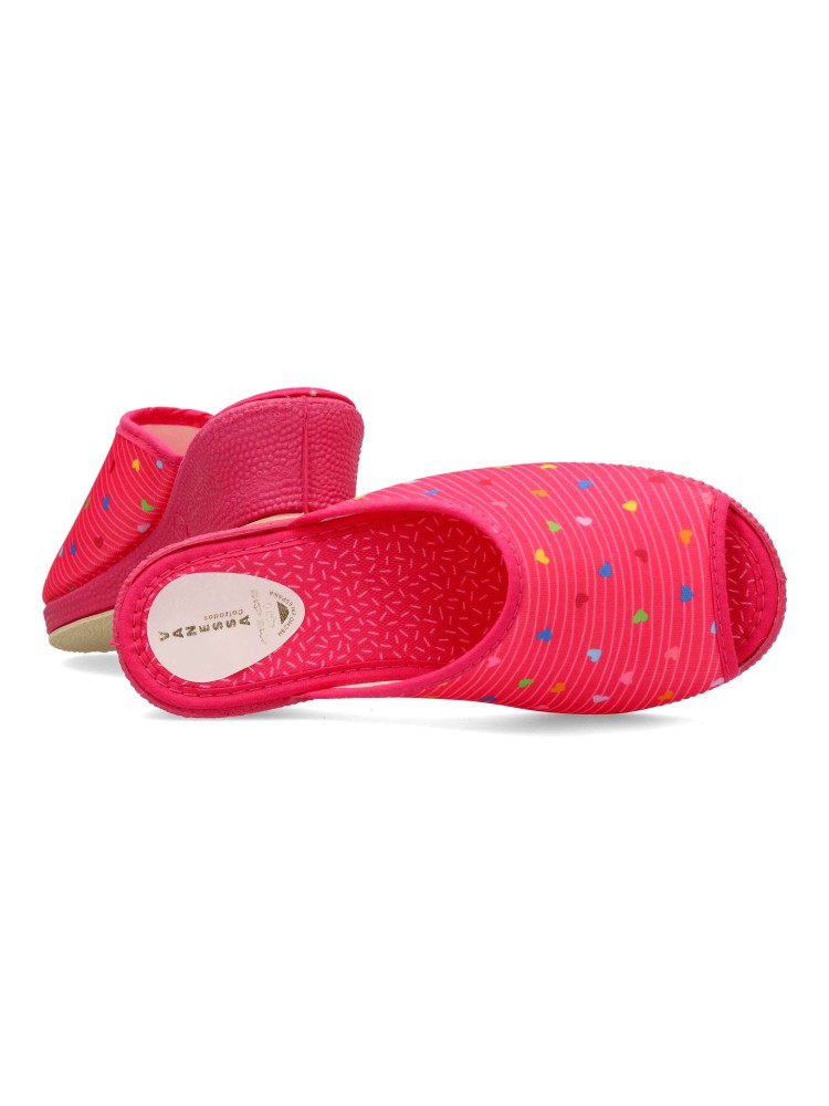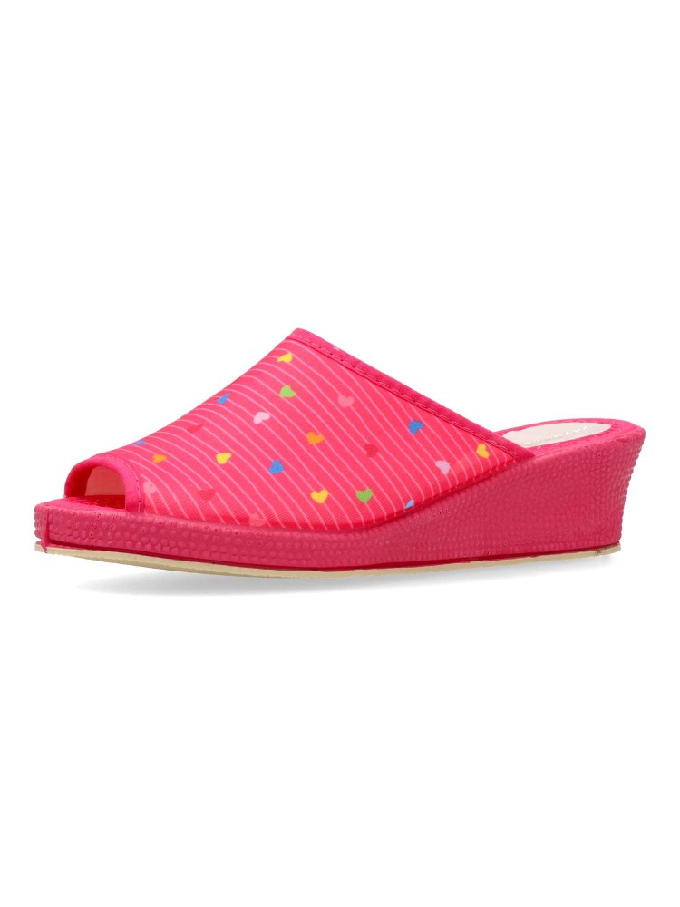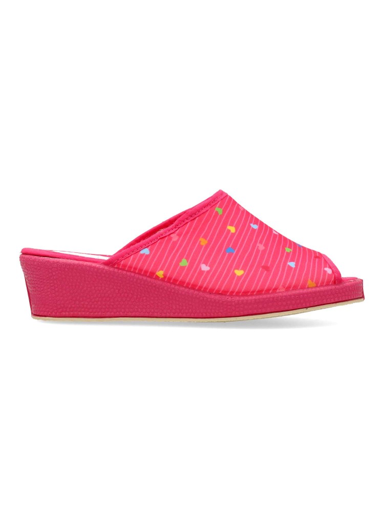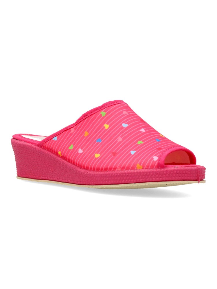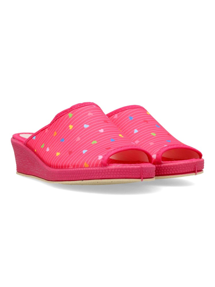 Zapatilla de casa para mujer. Disponible en color fucsia. Suela de goma flexible. Modelo cómodo fabricado en material textil acolchado, con estampado de corazones multicolor. Puntera descubierta pinki. Altura cuña 4 cm. Hecho en España.