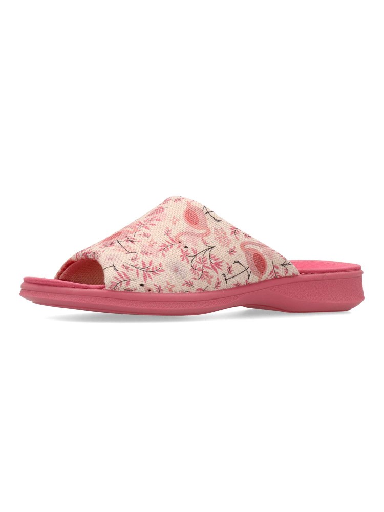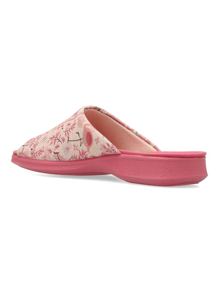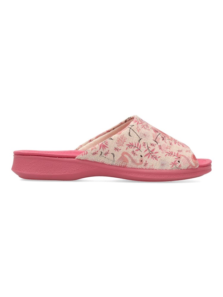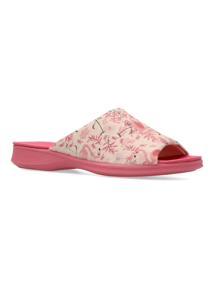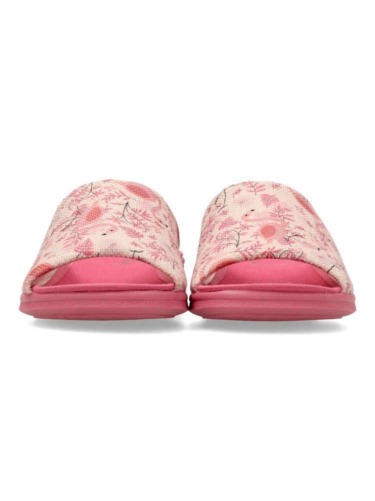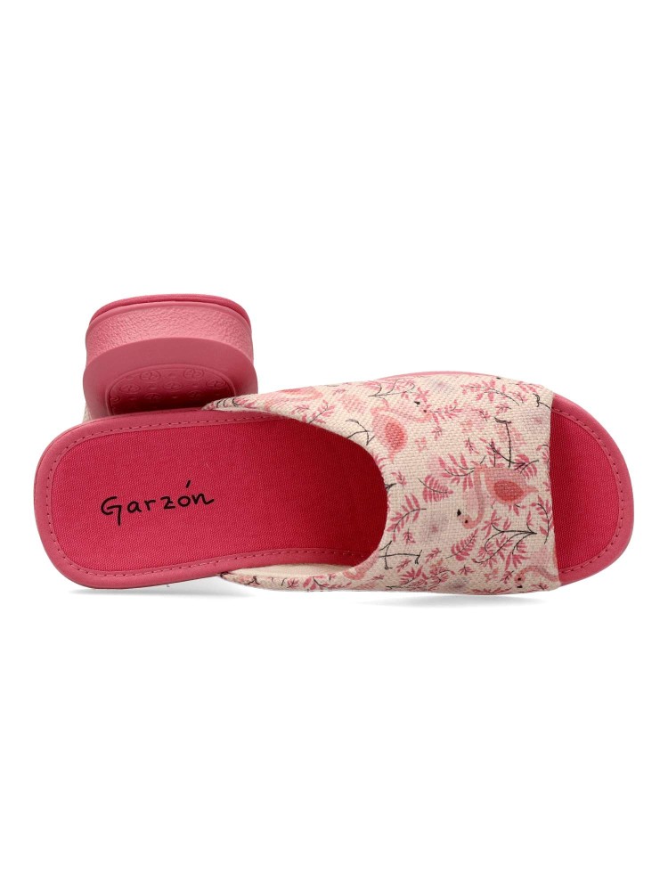 Zapatilla de casa confort para mujer. Color mora con estampado floral. Flamencos (Chinela invertida). Puntera descubierta. Modelo cómodo fabricado en textil suave, con piso de goma antideslizante. Planta acolchada. Hecho en España.