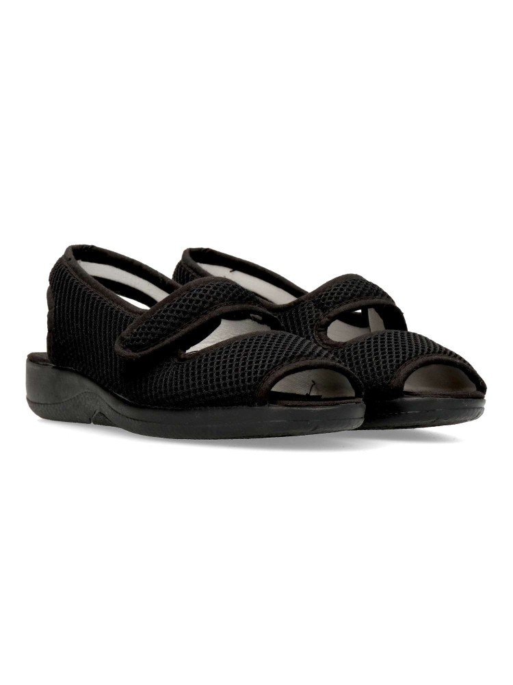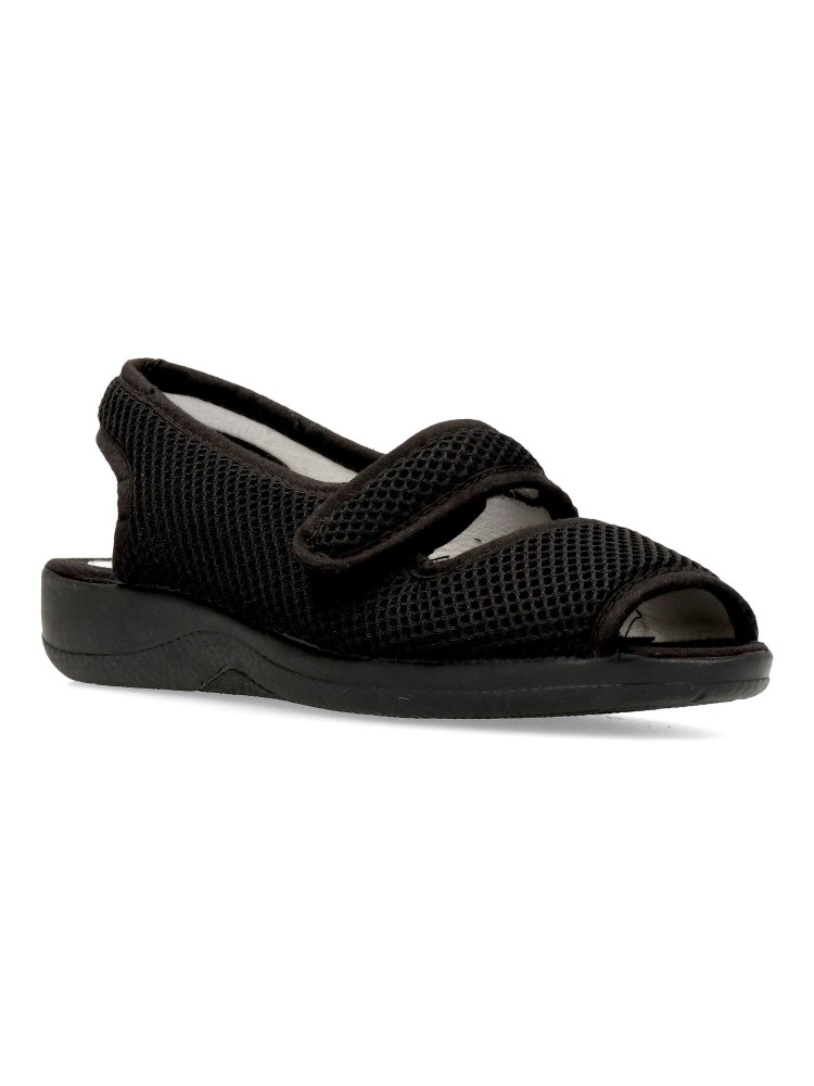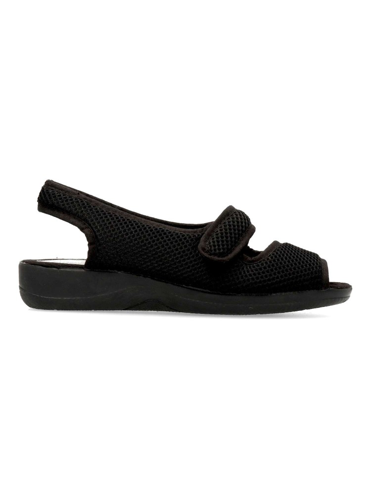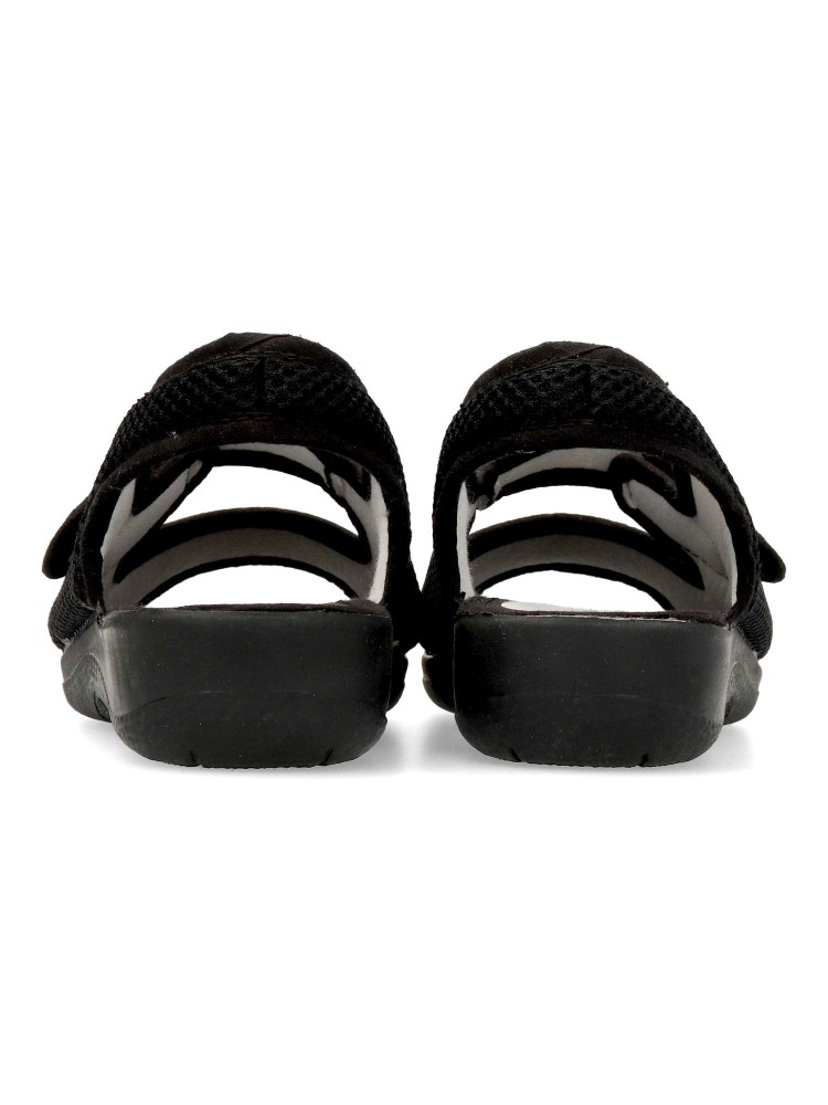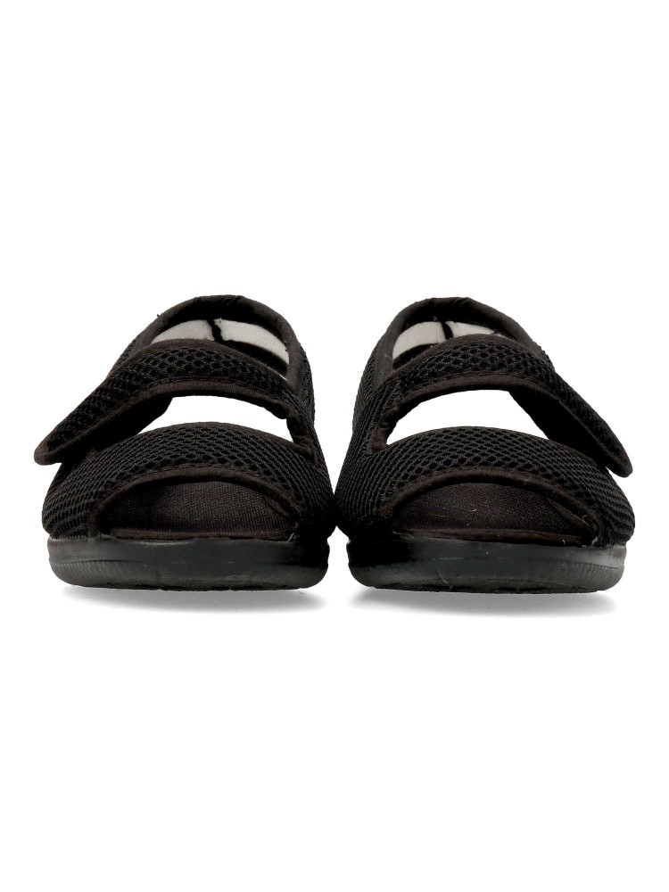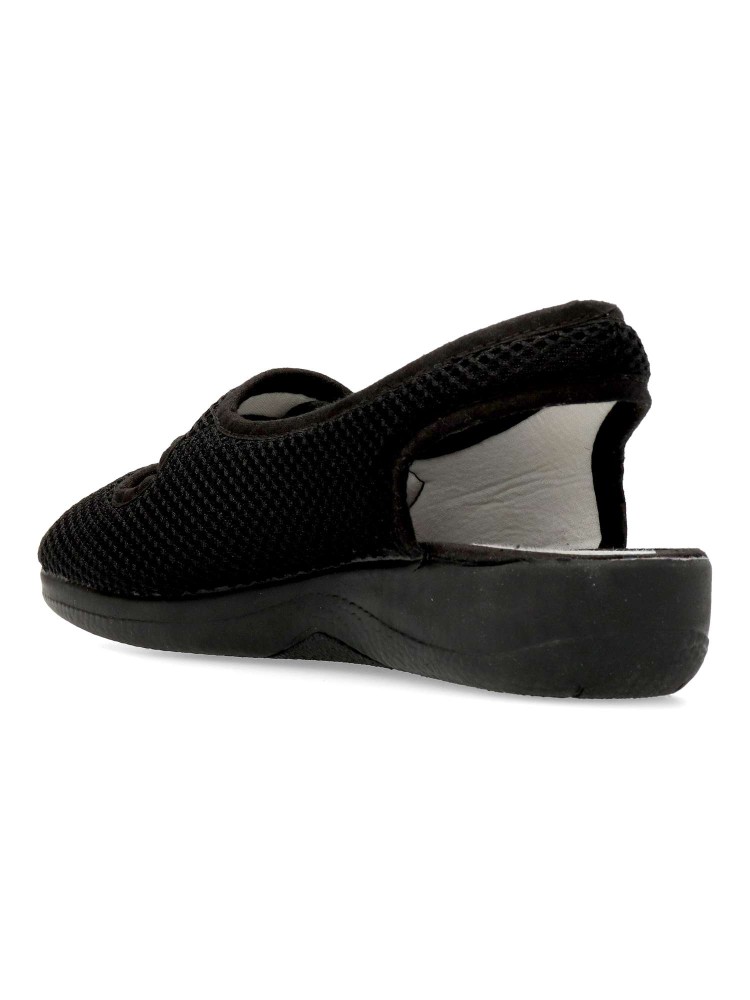 Zapatilla de casa confort, con tira adherente ajustable. Suela de goma flexible. Plantilla acolchada. Fabricada en textil rejilla suave y transpirable. Disponible en color negro. Pequeña cuña de 3 cm. Máximo confort en tu descanso diario. Hecho en España.