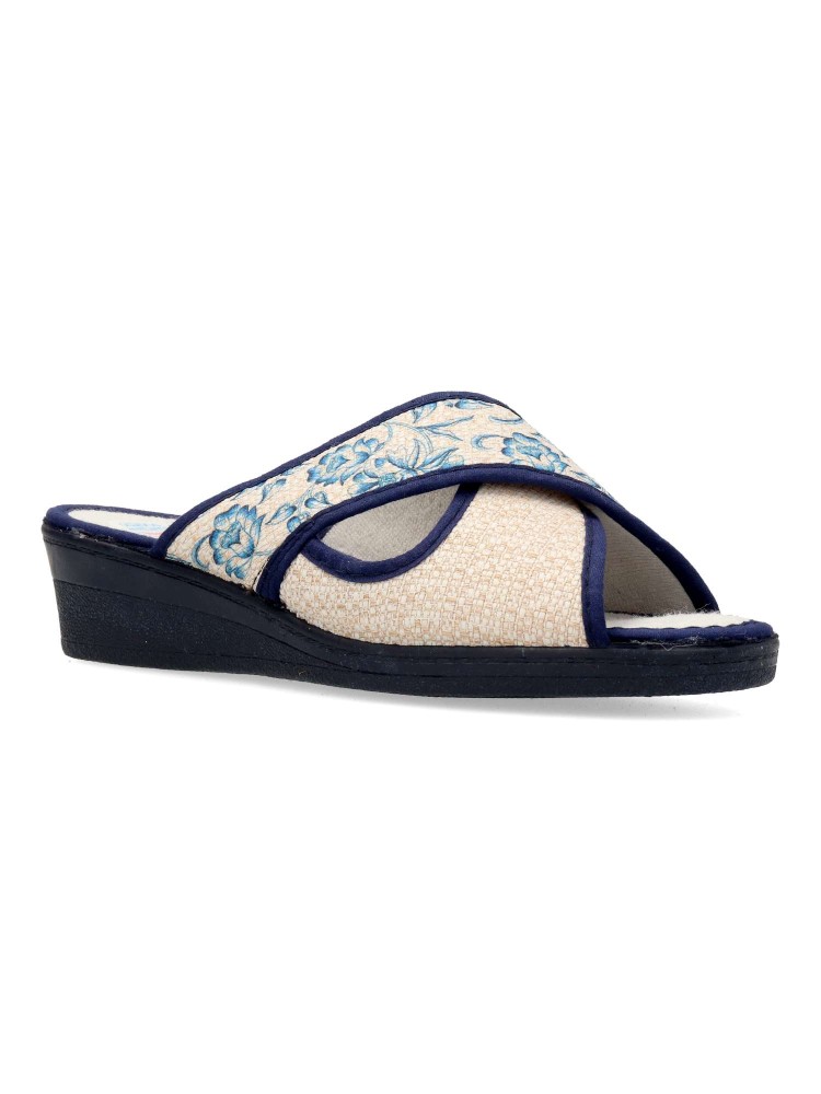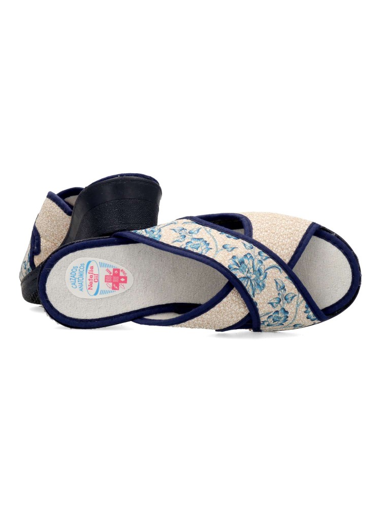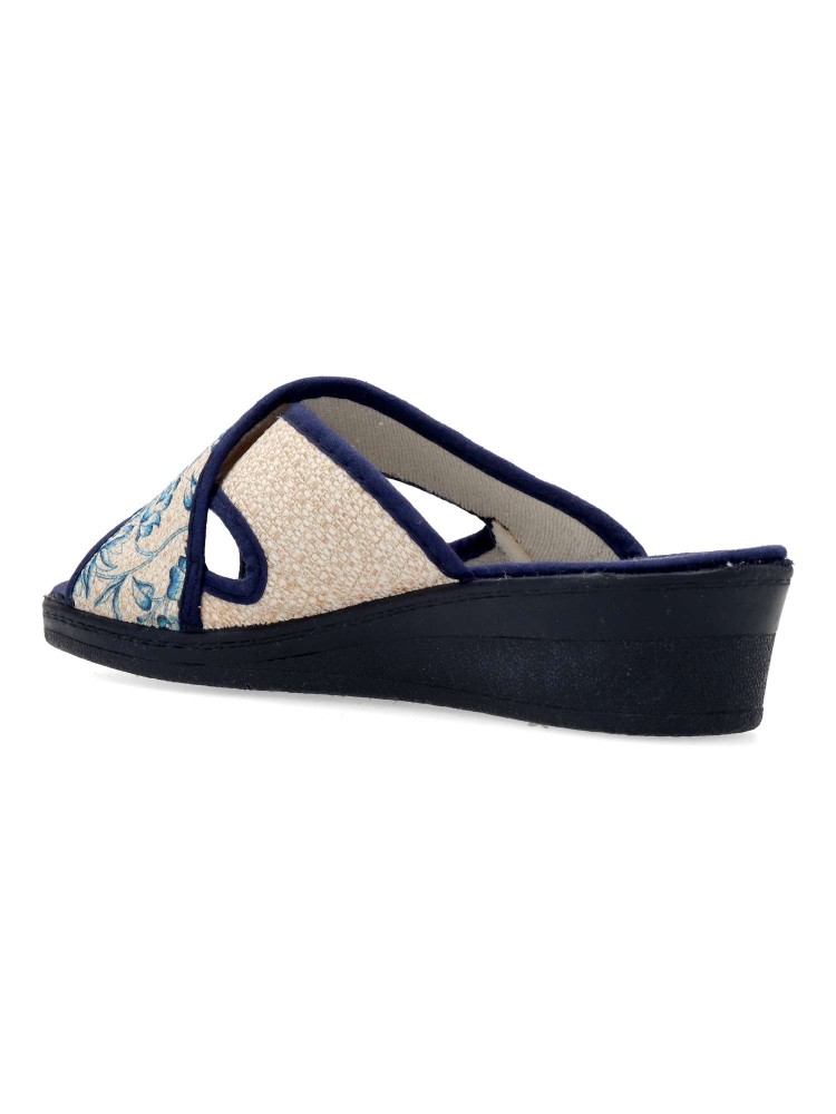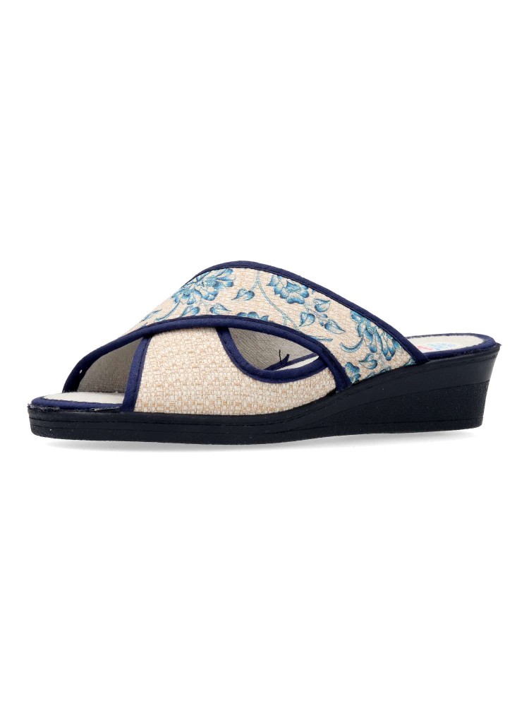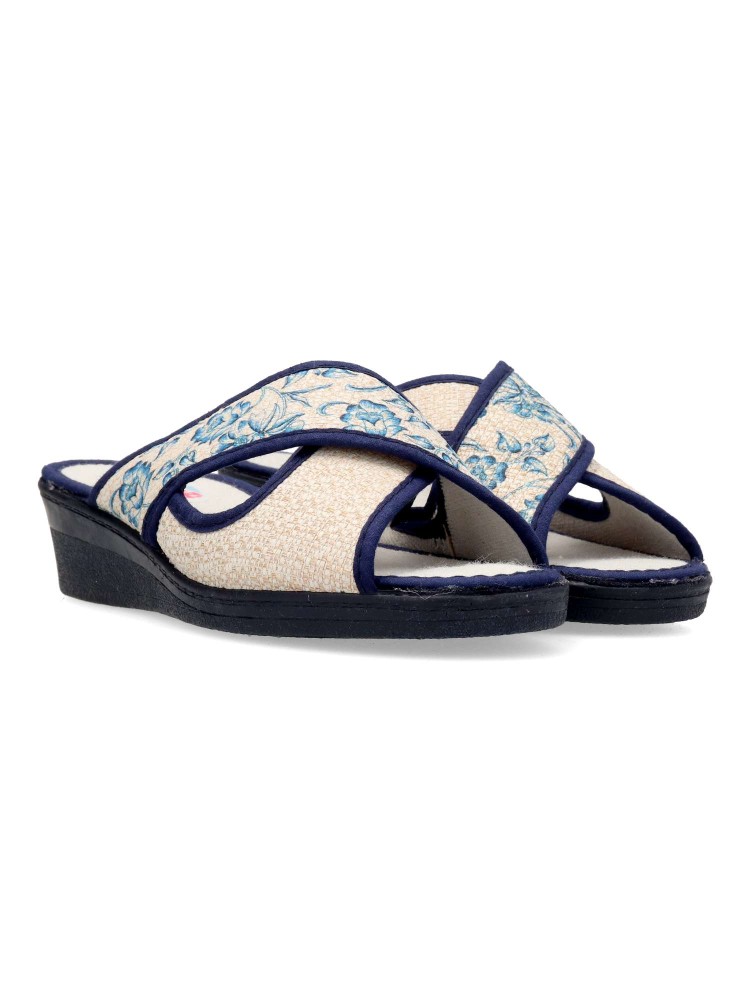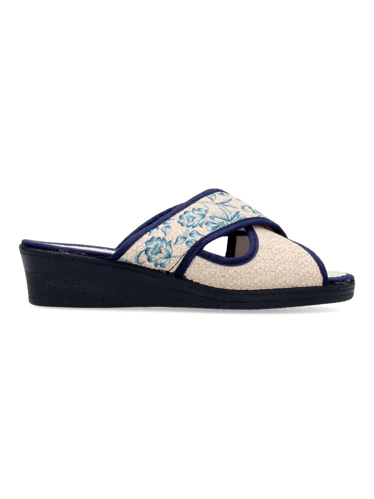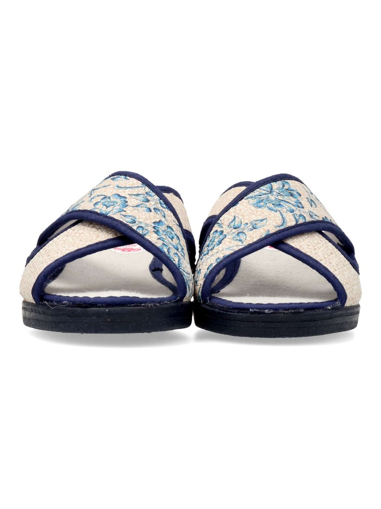 Zapatilla de casa para mujer color marino. Suela de caucho flexible. Modelo cómodo fabricado en textil acolchado y suave. Pala de tiras cruzadas. Detalle estampado floral. Planta acolchada. Puntera descubierta pinky. Hecho en España.