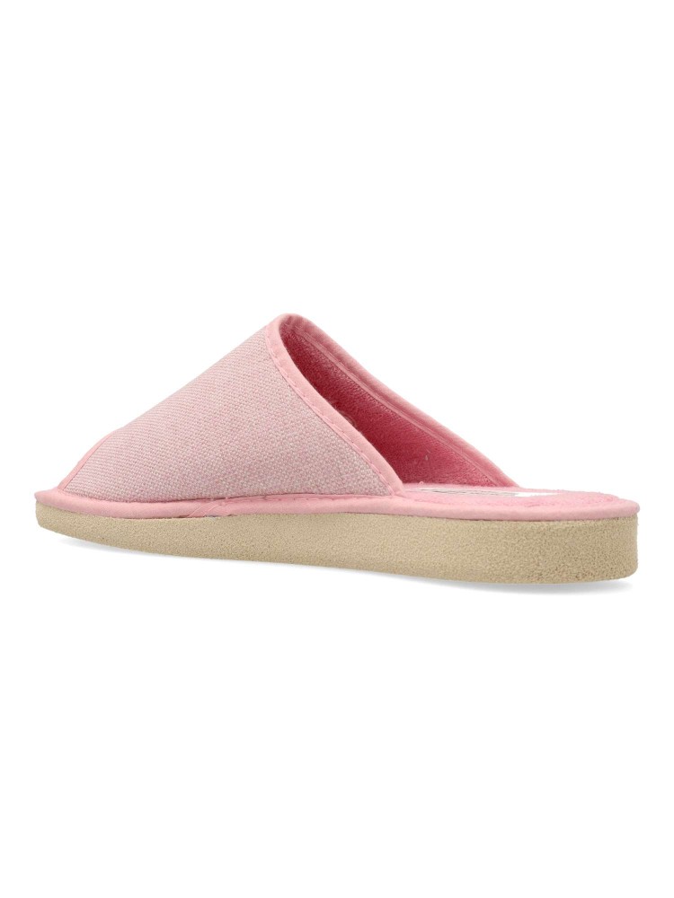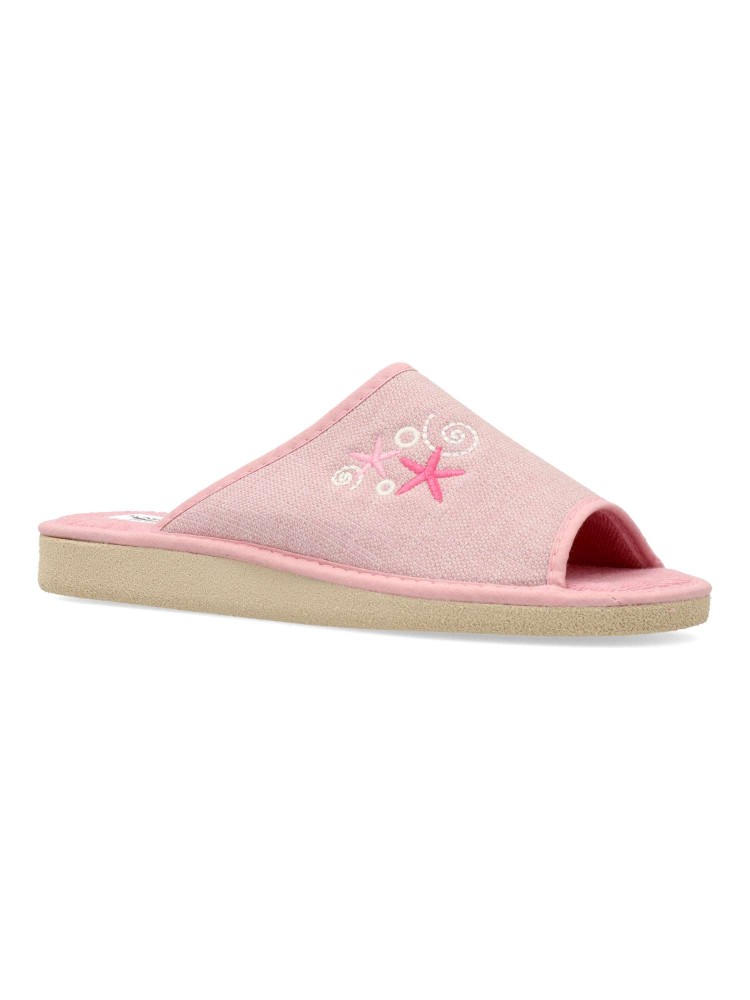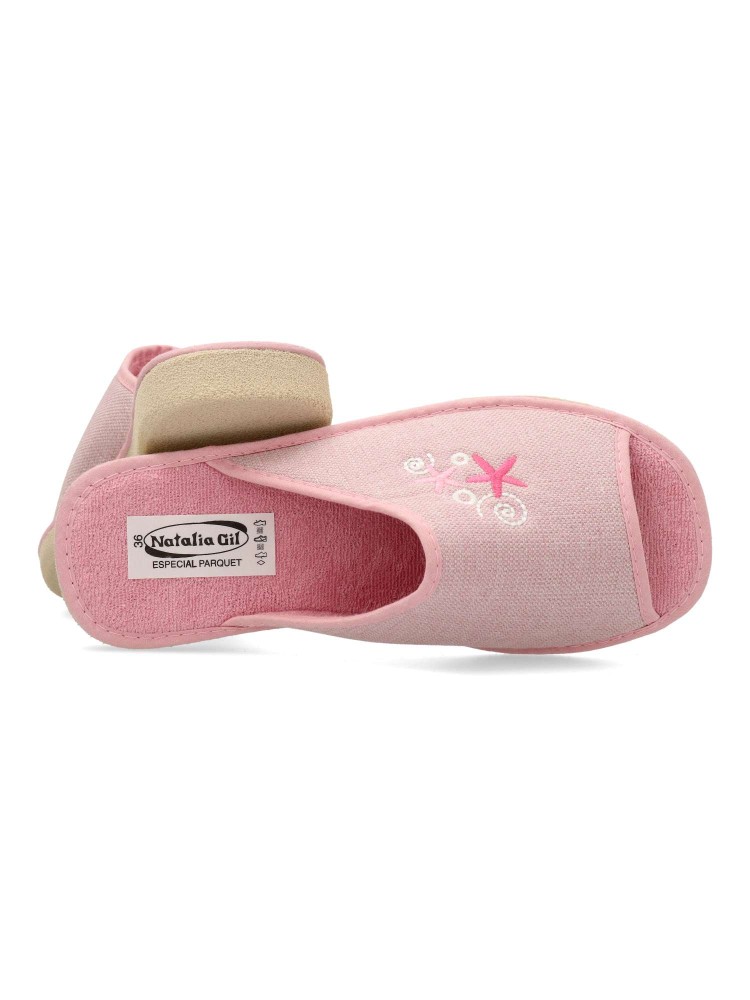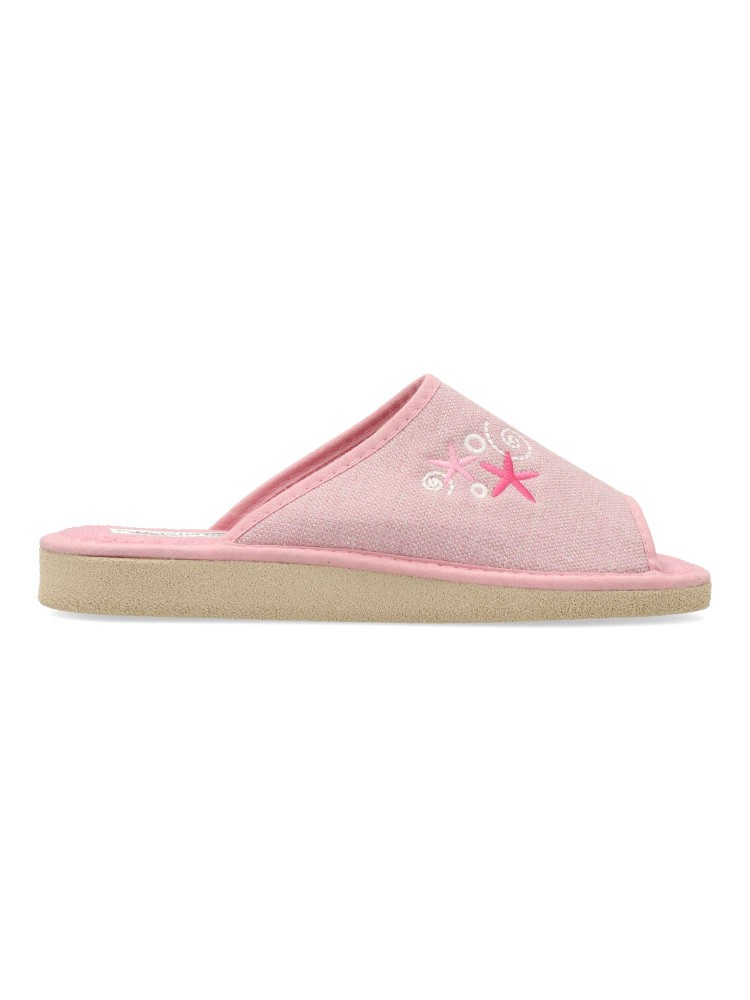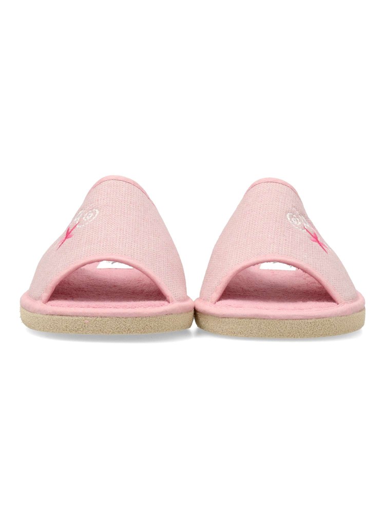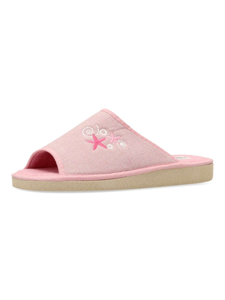 Zapatilla de casa para mujer con detalle bordado. Modelo cómodo y ligero, fabricado en textil acolchado y suave, con suela de goma EVA (especial parquet). Color rosa nude. Puntera descubierta pinky. Confort máximo para estar en casa. Hecho en España.