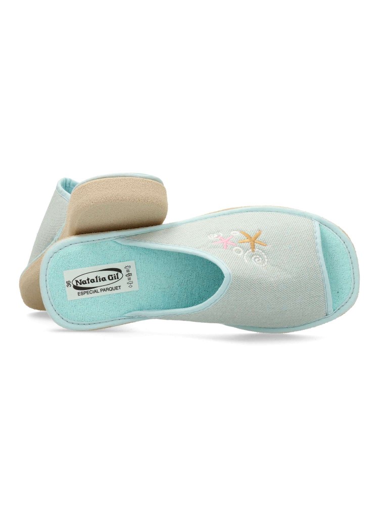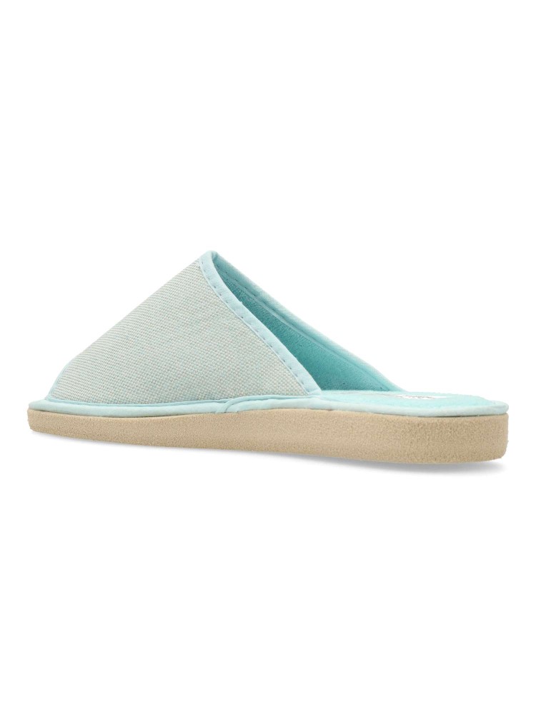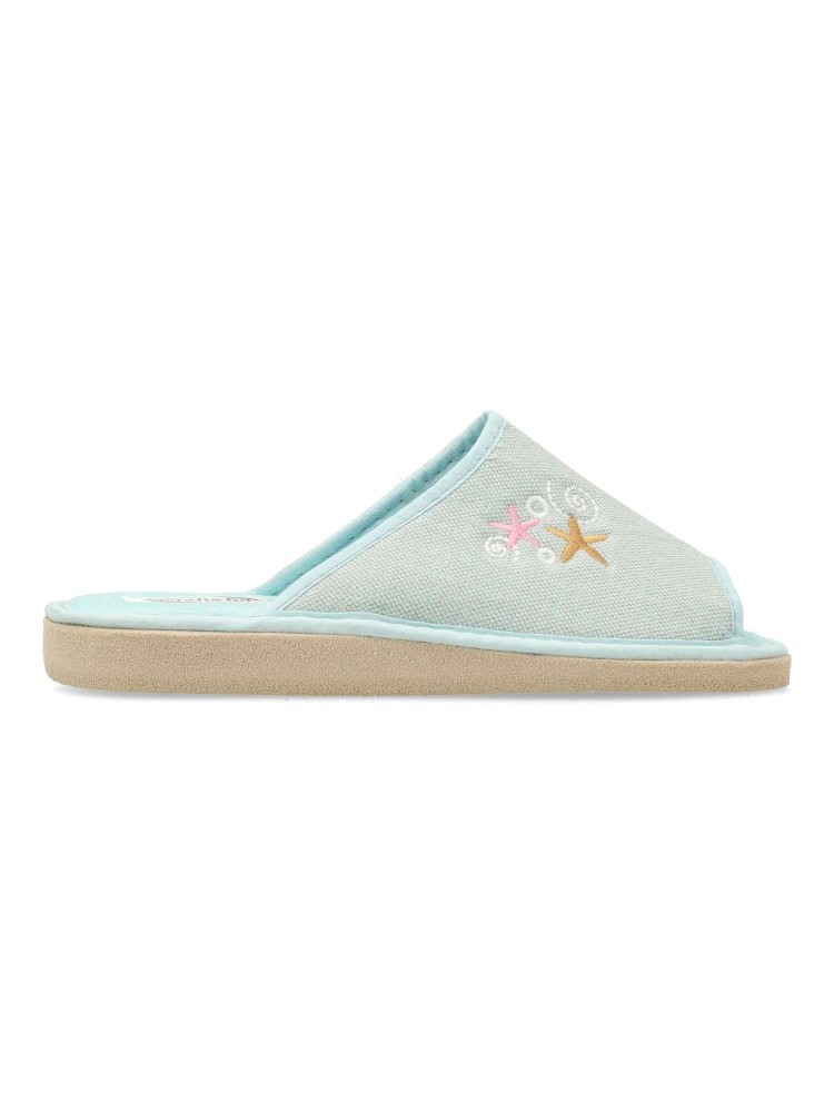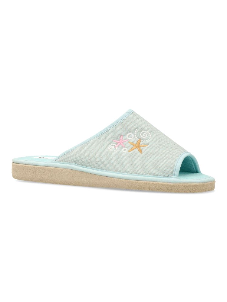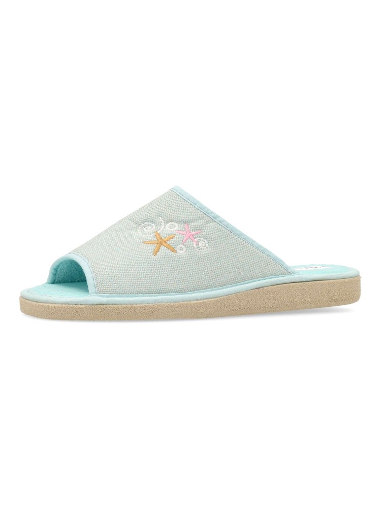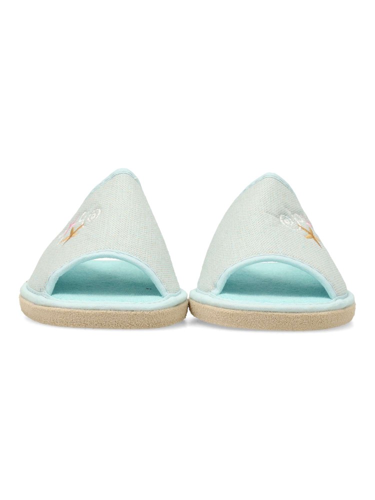 Zapatilla de casa para mujer con detalle bordado. Modelo cómodo y ligero, fabricado en textil acolchado y suave, con suela de goma EVA (especial parquet). Color verde agua. Puntera descubierta pinky. Confort máximo para estar en casa. Hecho en España.