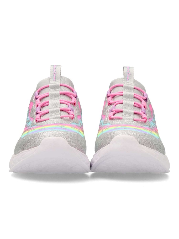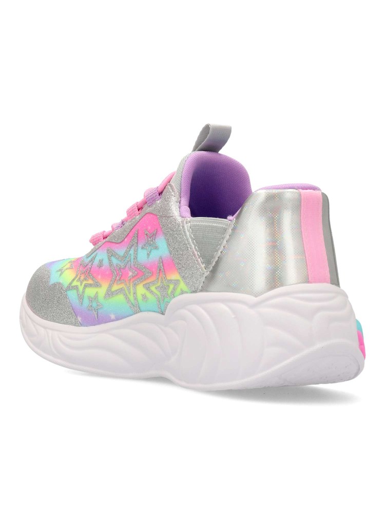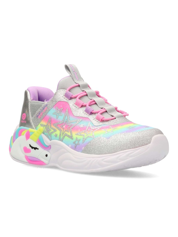 Diseñadas con exclusiva Heel Pillow™, estas zapatillas con luz presentan una parte superior sintética brillante con estampado de estrellas, cordón elástico, cierre adaptable, plantilla Skechers Air-Cooled Memory Foam® y entresuela con un unicornio.
