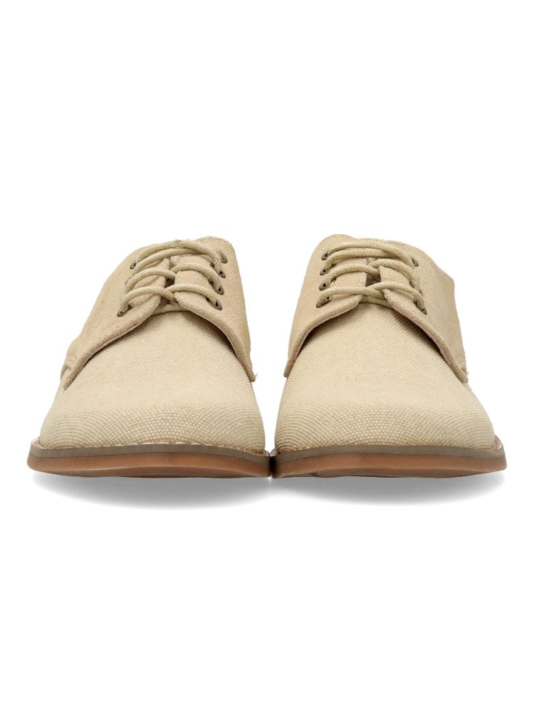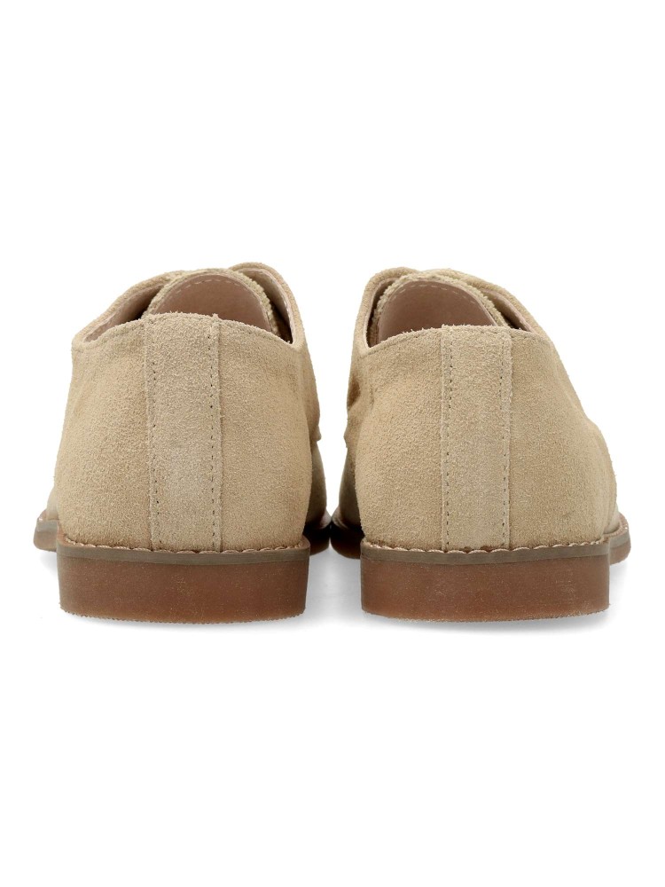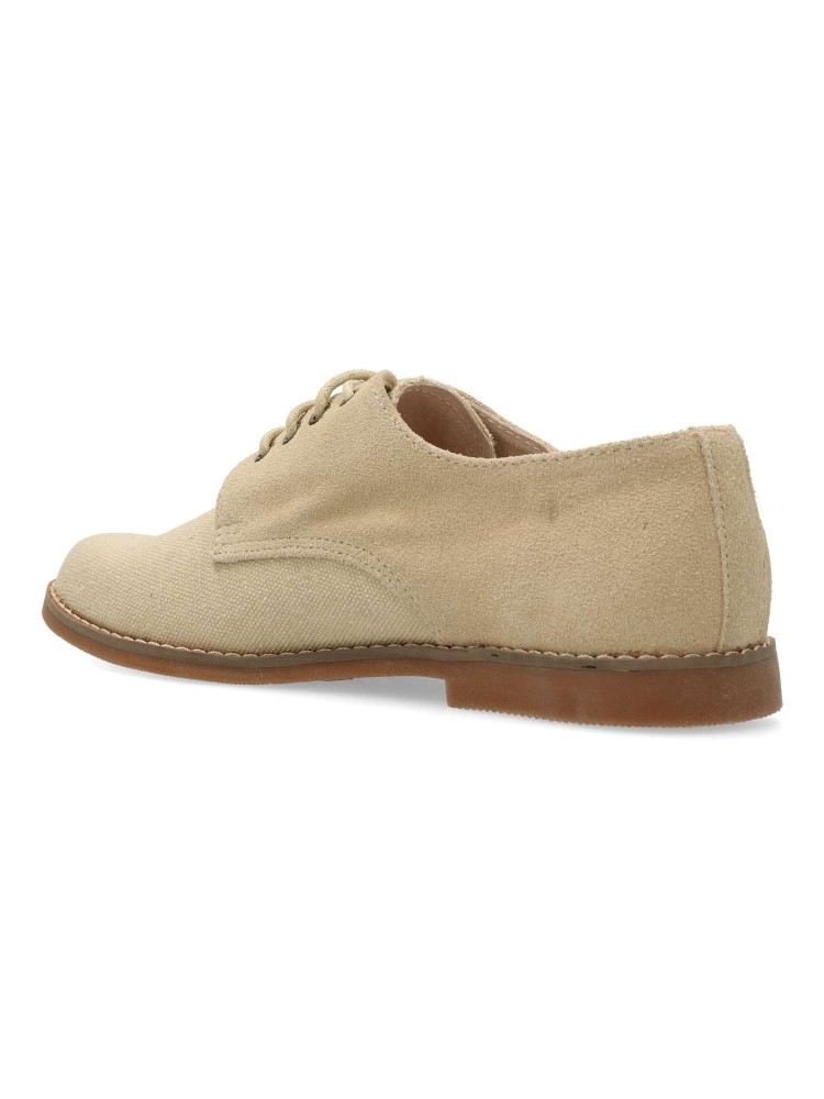 Zapato comunión de niño, con cierre de cordones. Modelo cómodo fabricado en piel y textil, con suela de goma. Forro interior y plantilla de piel. Color beige. Zapato de vestir cómodo, ligero y transpirable, ideal para comuniones y celebraciones.
