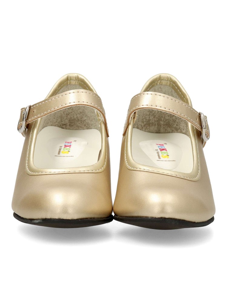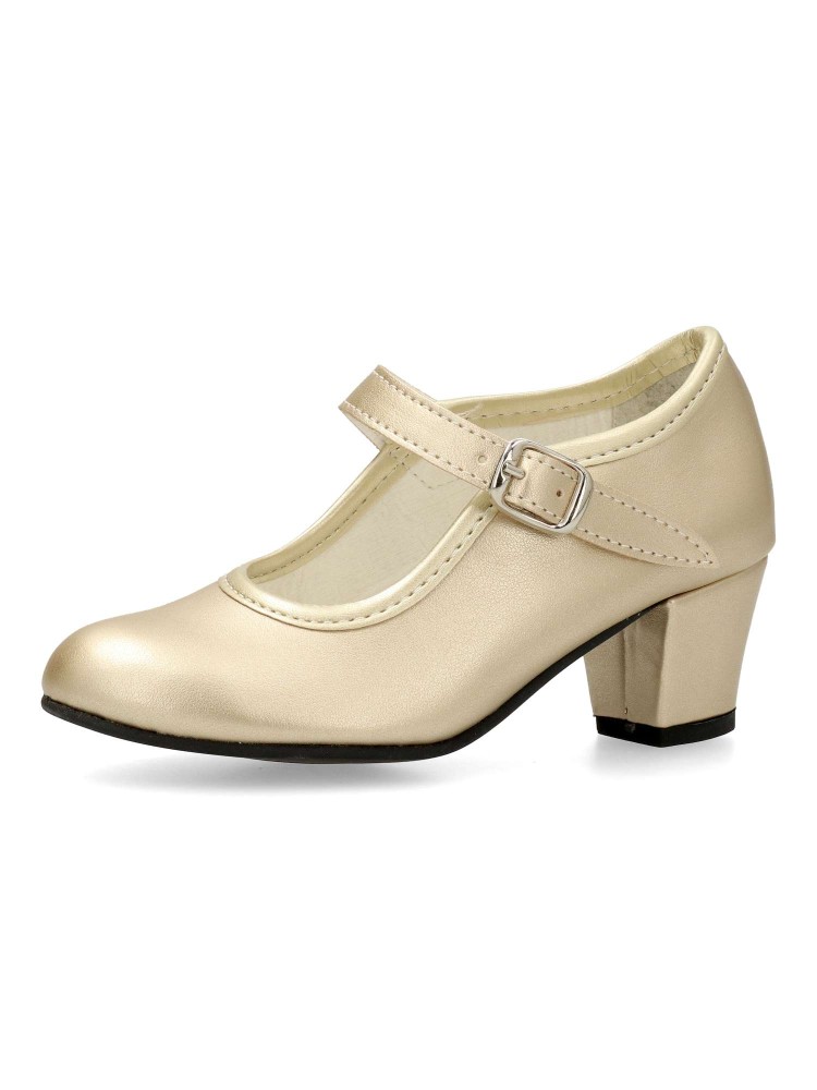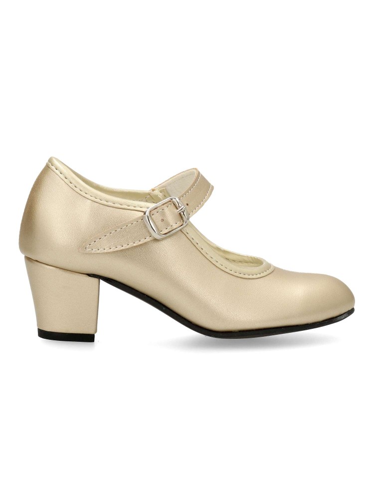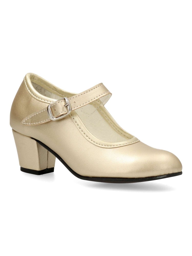Sintético con hebilla y sin clavos. La altura del tacón va en función del número, los más pequeños miden 3,5 cm y las tallas más grandes 5 cm. Color oro. Estos zapato de gitana son los mas populares y usados, tanto en las ferias como romerías.
