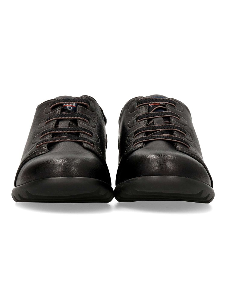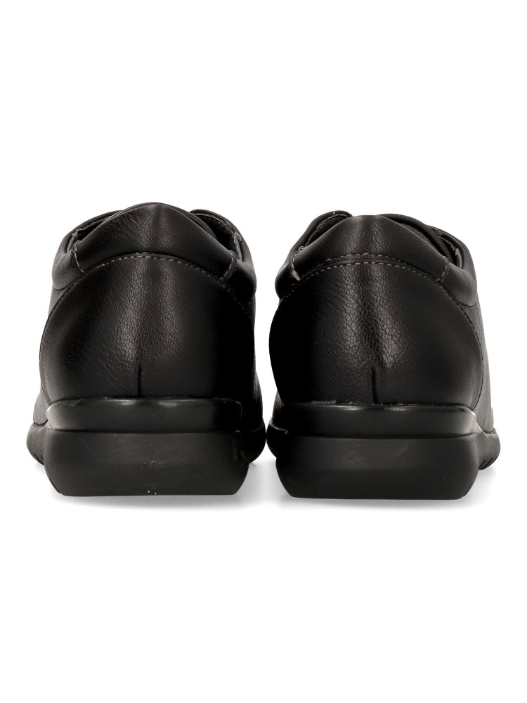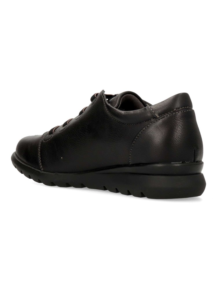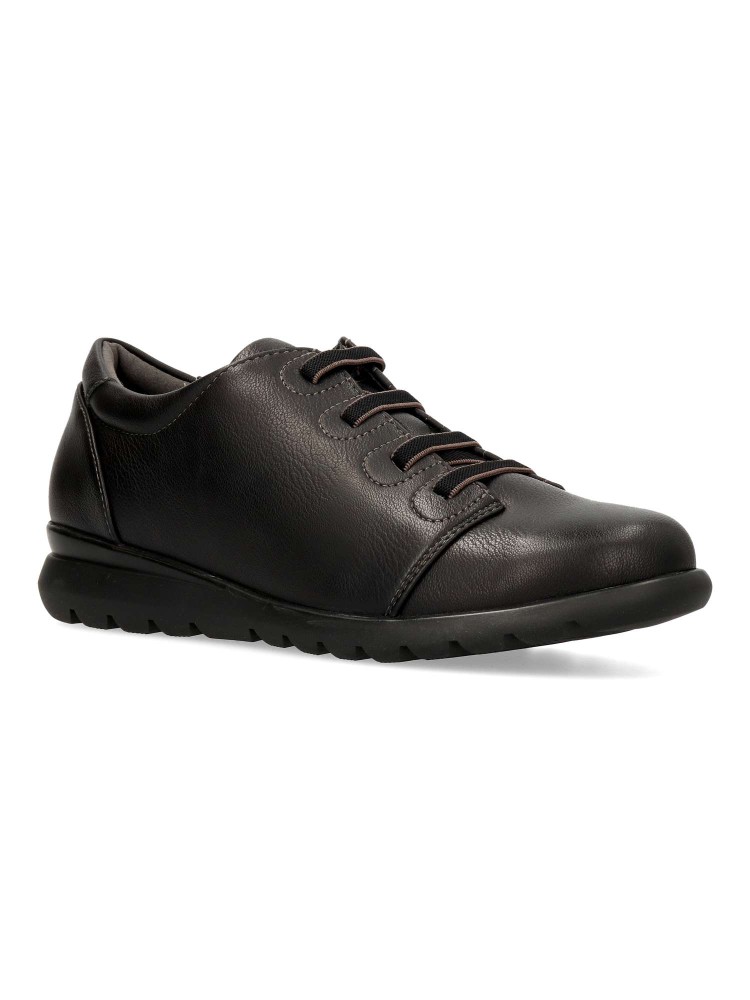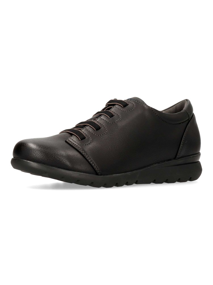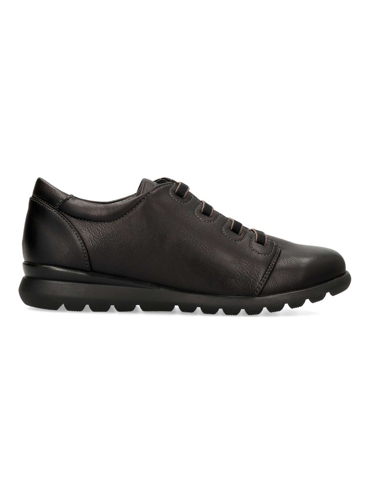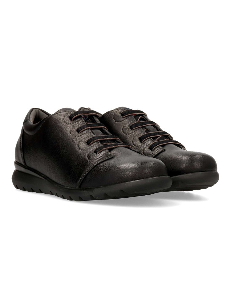 Zapato cómodo de mujer, estilo blucher. Cierre de cordones elásticos. Fabricado en piel sintética, con suela de goma flexible. Color negro. Diseño clásico, versátil y cómodo, fácil de combinar con todos tus outfits. Máximo confort en tu día a día.