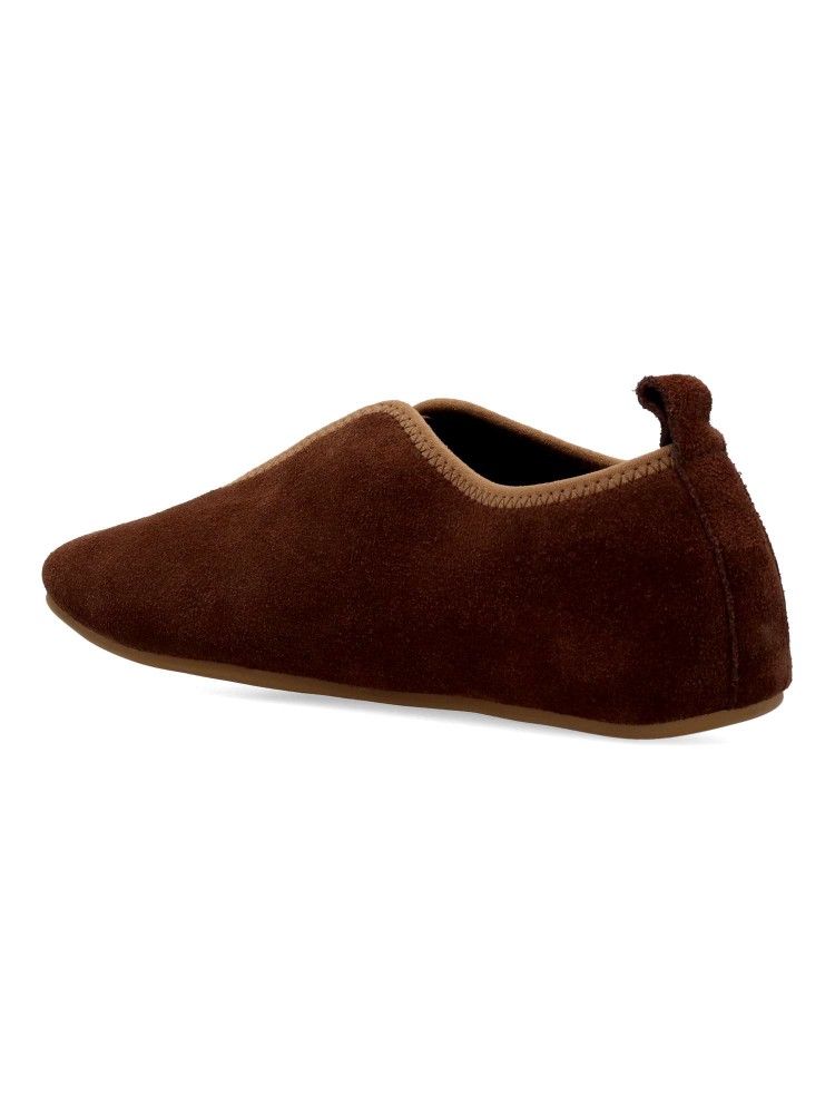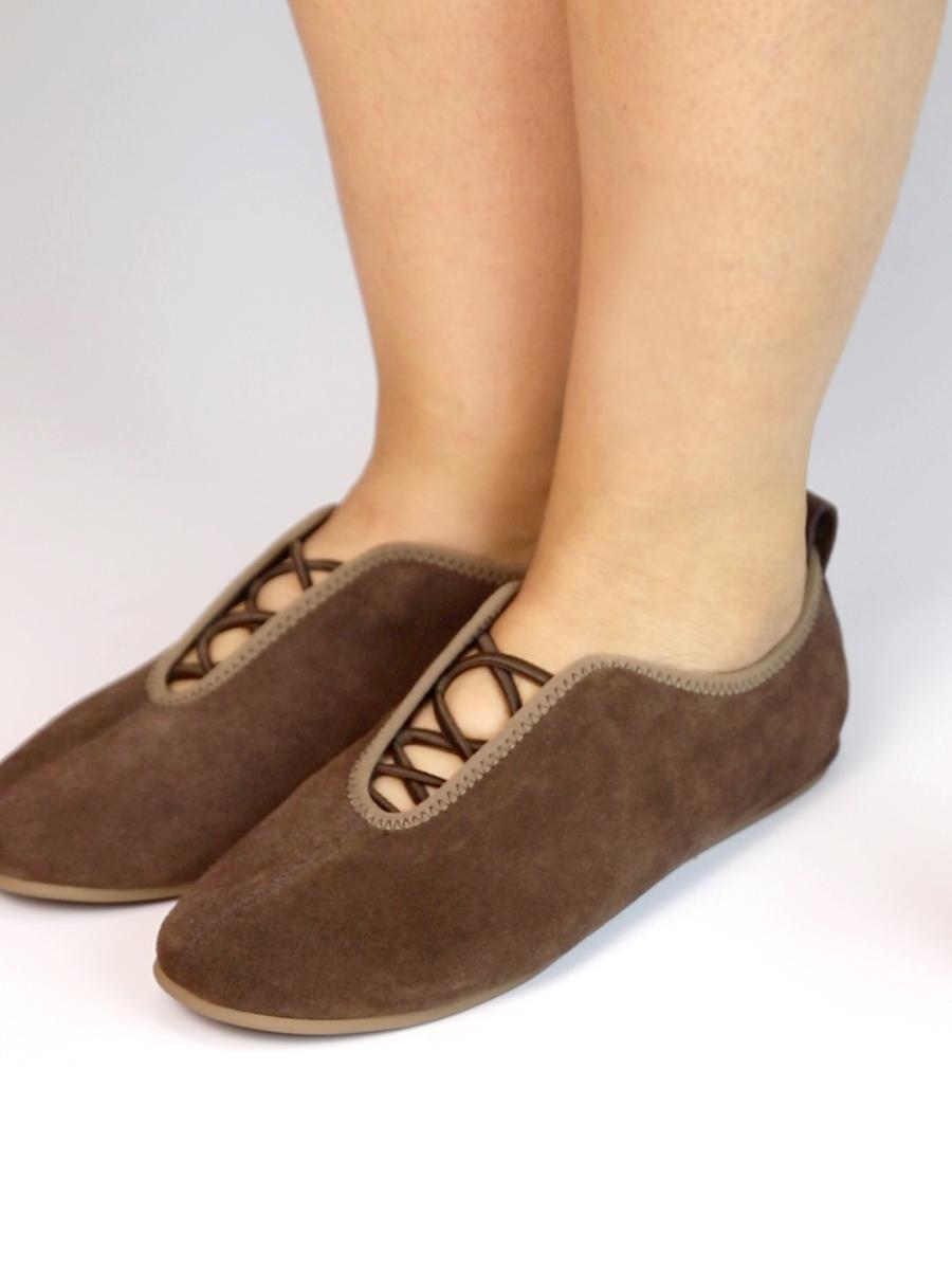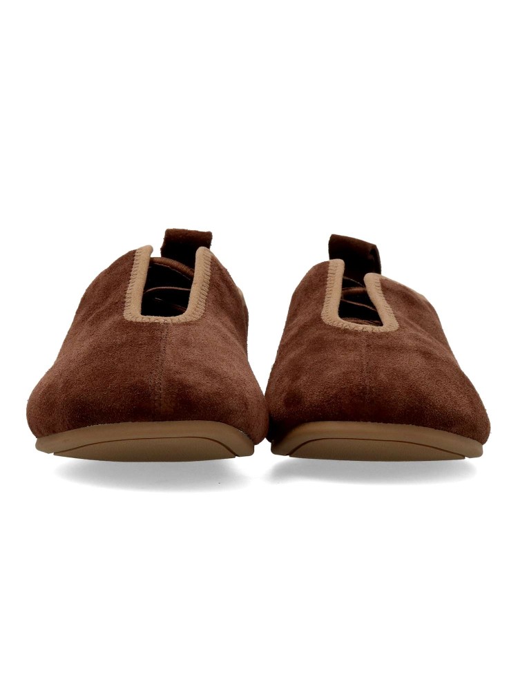 Zapato mocasín plano de mujer. Fabricado en piel serraje, con suela de goma flexible. Forro interior y plantilla acolchada de piel. Color moka. Cordón elástico al empeine. Diseño original y versátil, que ofrece el máximo confort para tu día a día.