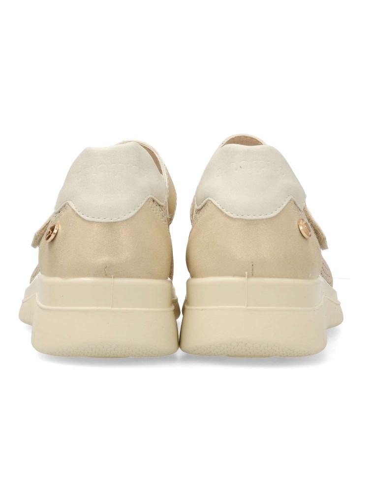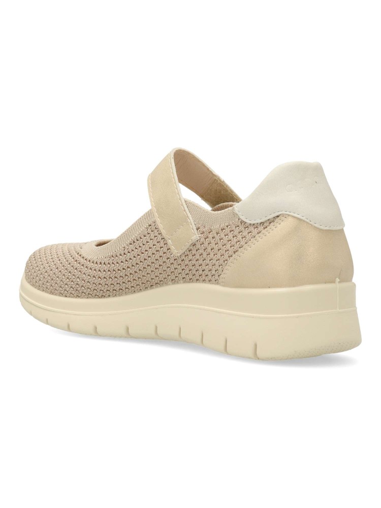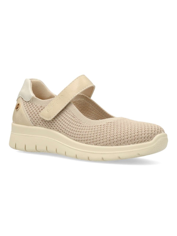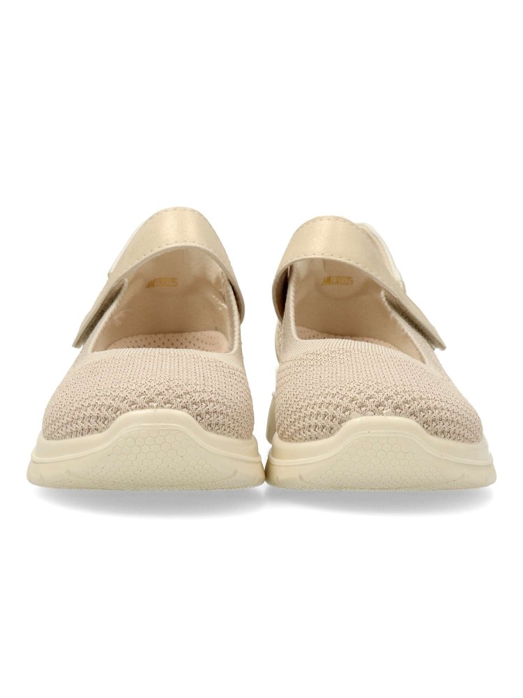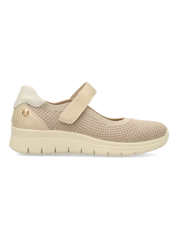 Zapato cómodo de mujer estilo casual. Tira con cierre de velcro al empeine. Bailarina fabricada en textil transpirable tipo calcetín. Suela de goma flexible y ligera. Plantilla acolchada y extraible. Color beige brillo. Máximo confort para uso diario.