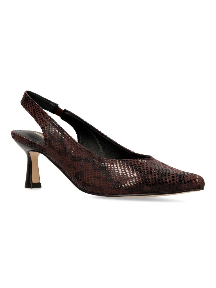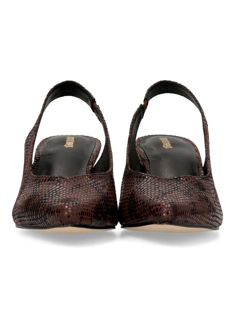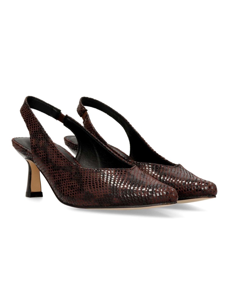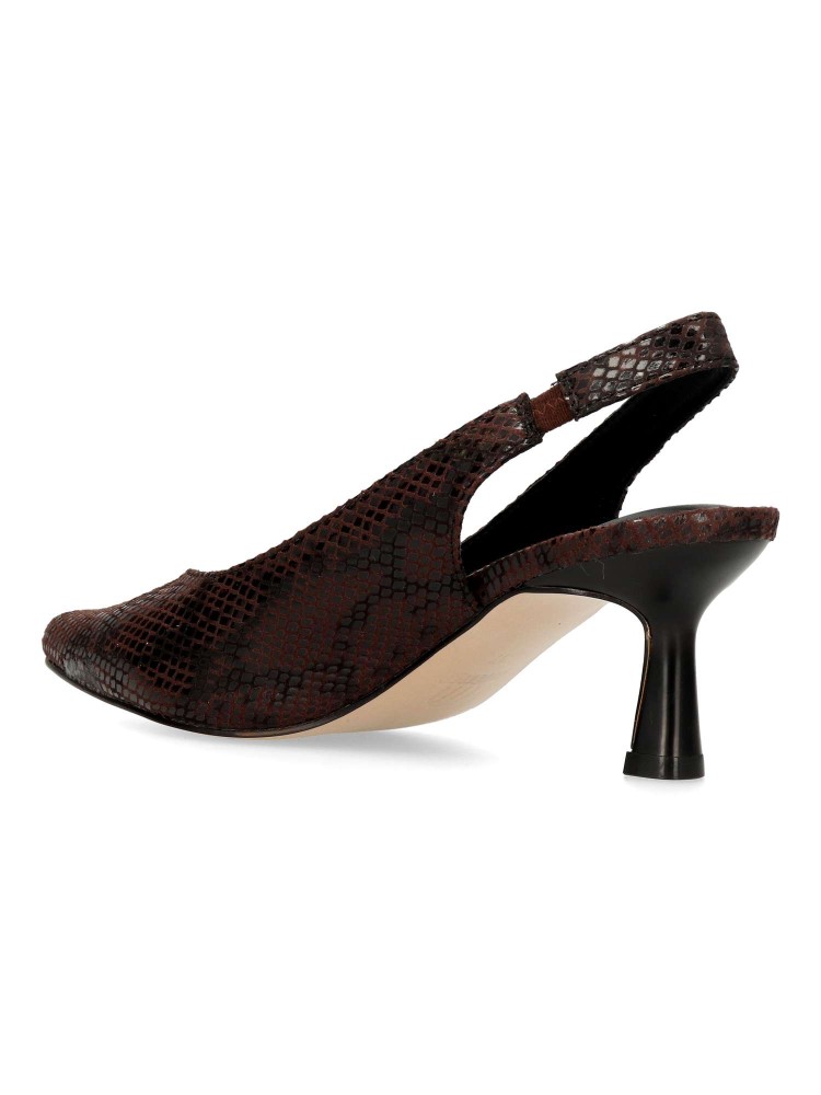 Zapatos de tacón destalonados para mujer, color moka con textura de serpiente. Altura 6 cm. Su tacón y punta fina los convierte en la opción ideal para ocasiones especiales o para añadir estilo a cualquier look casual.