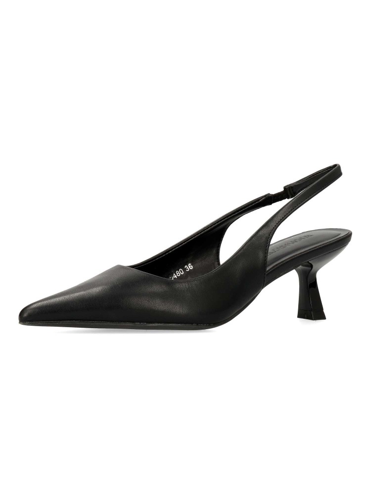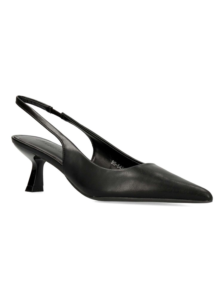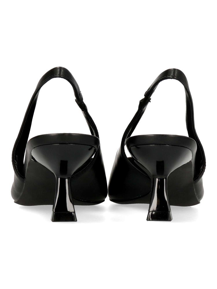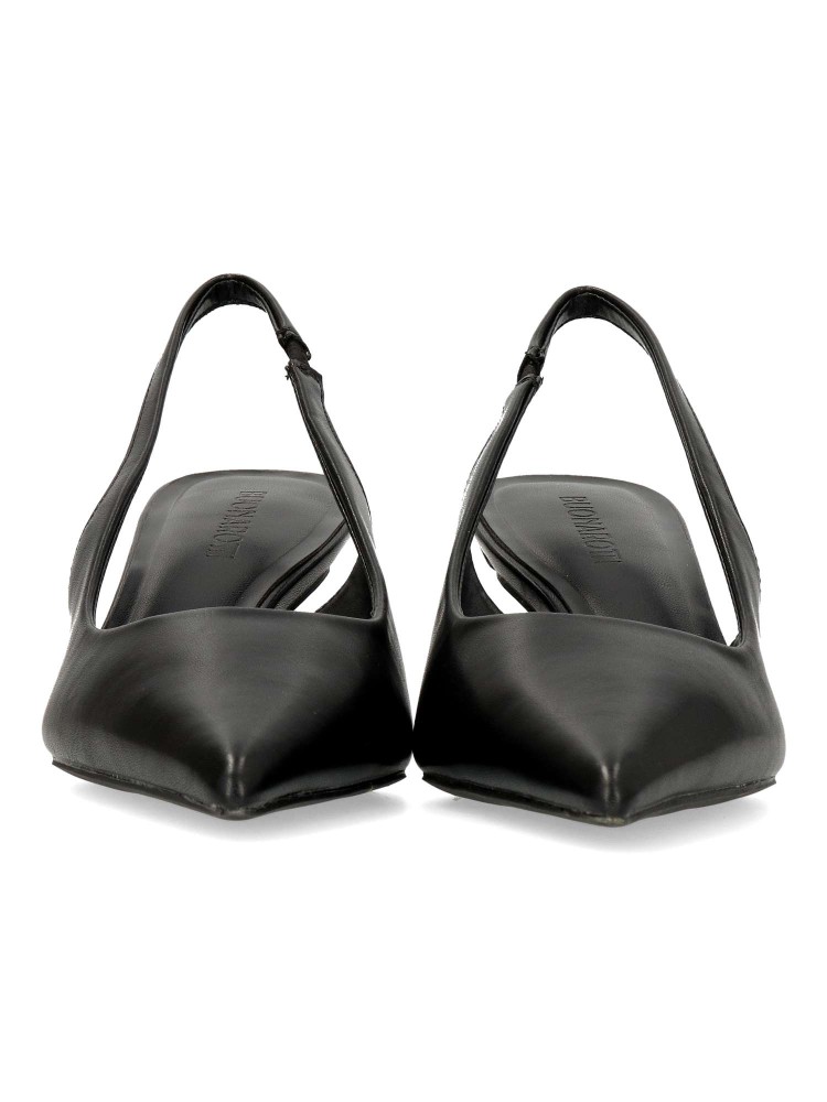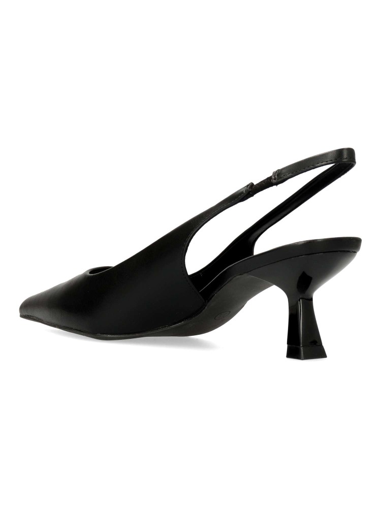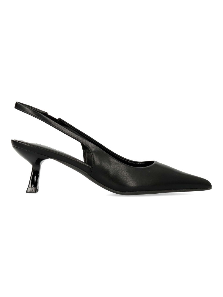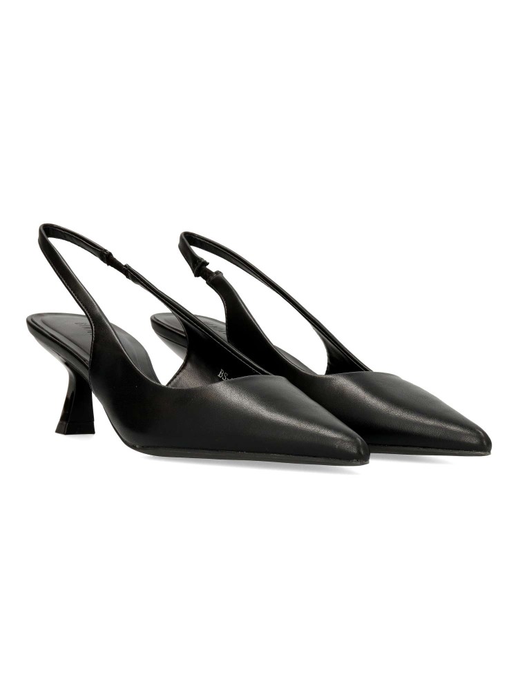 Zapato salón de mujer, con puntera fina y destalonado. Fabricado en material sintético. Planta acolchada. Color negro. Tacón fino de 5,5 cm. de altura. Modelo cómodo y elegante, ideal tanto para tu día a día, como para eventos y celebraciones.