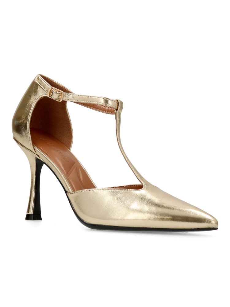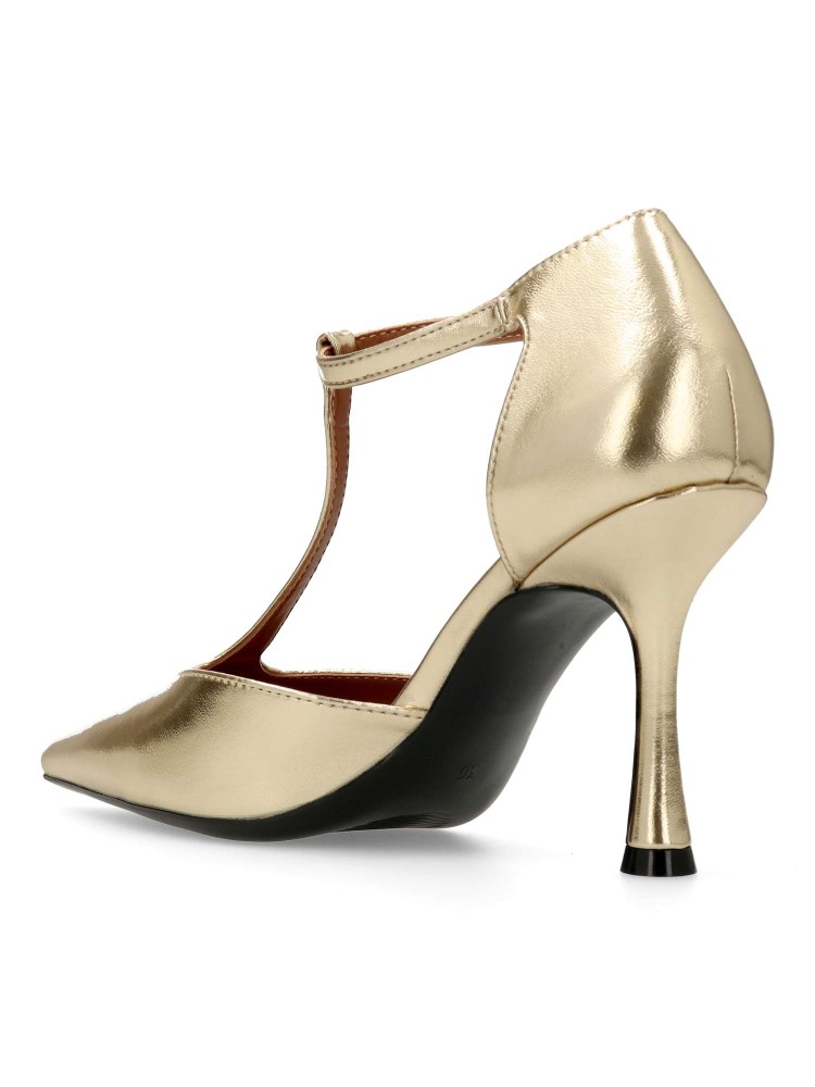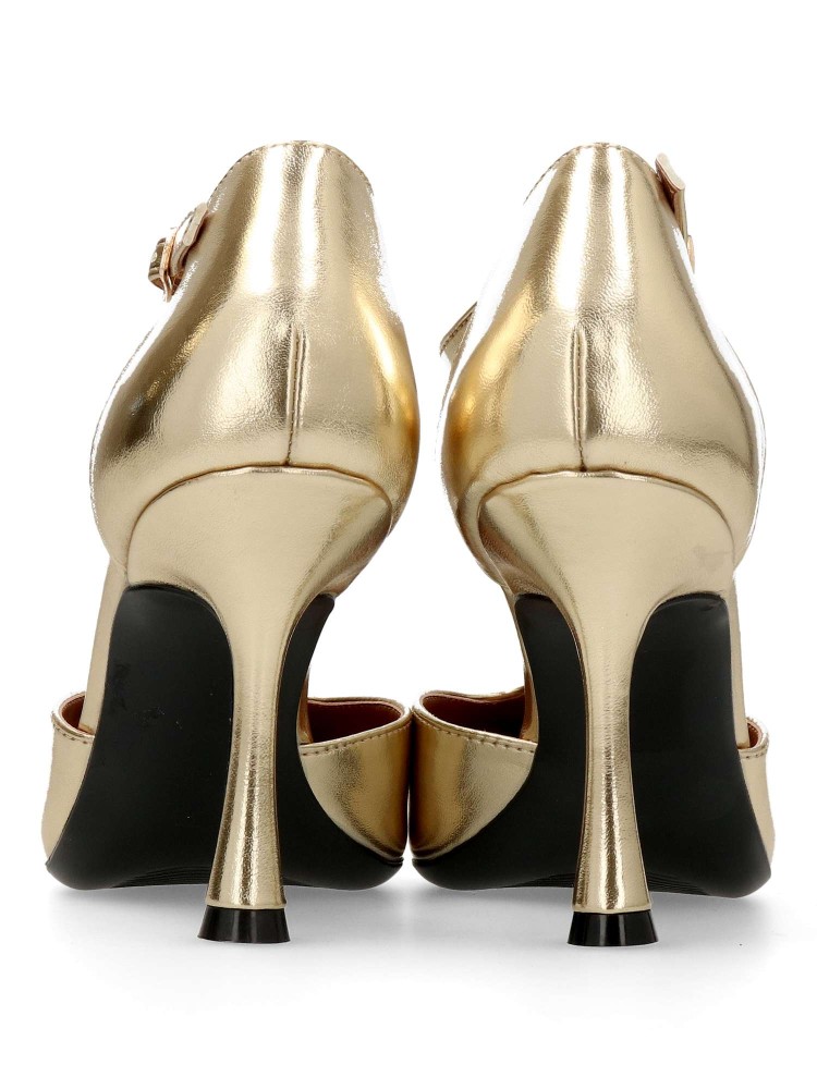 Zapato salón de mujer, con puntera y tacón fino de 8 cm. de altura. Cierre de hebilla al tobillo. Fabricado en material sintético, con suela de goma. Planta acolchada. Color oro. Ideal tanto para tu día a día, como para fiestas y celebraciones.