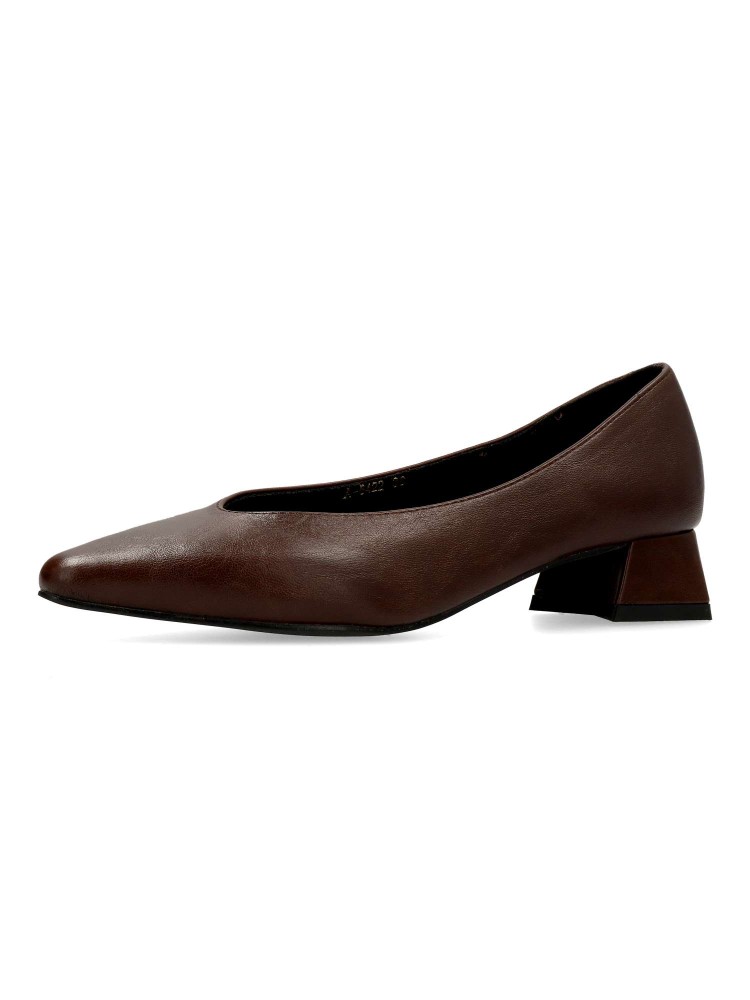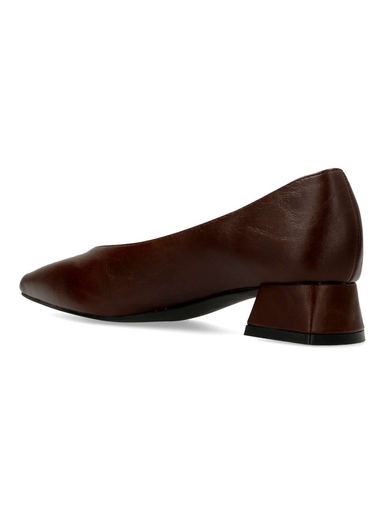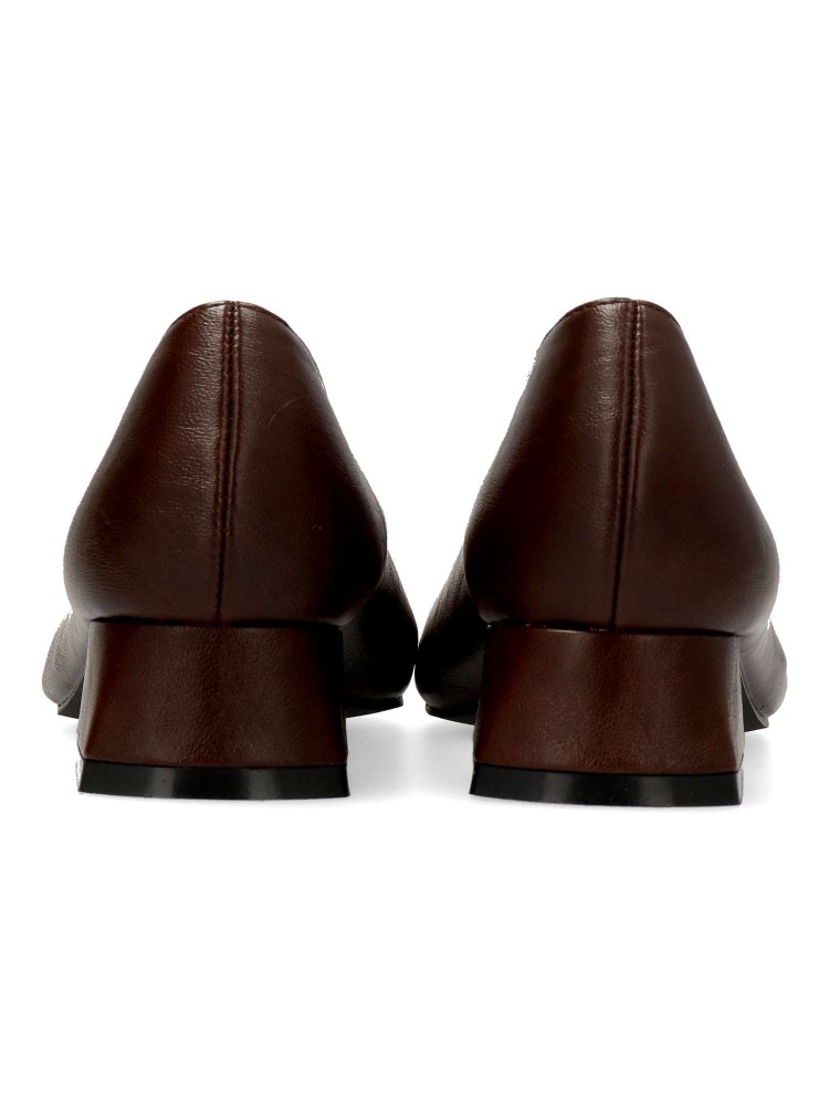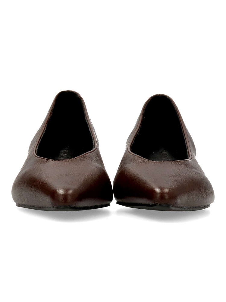 Zapato bailarina de mujer sin cierre, con puntera fina y pequeño tacón ancho de 3 cm. de altura. Salón cómodo, fabricado en piel sintética, con suela de goma. Disponible en color marrón. Ofrecen el acabado perfecto para cualquier look de temporada.