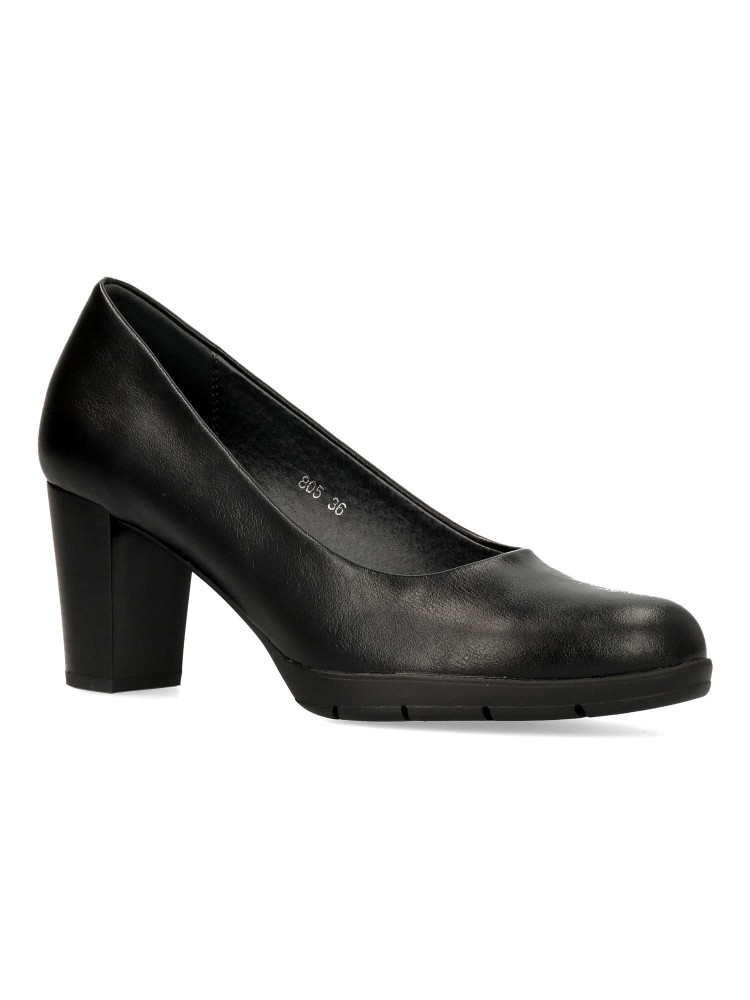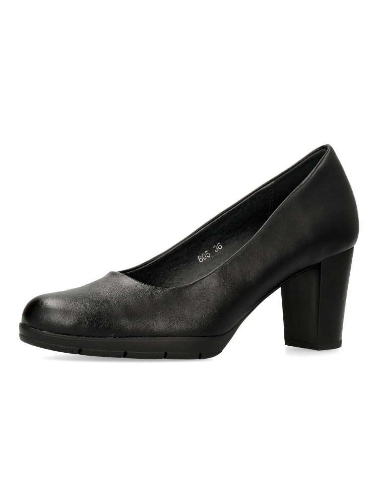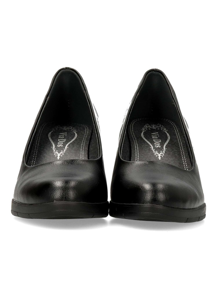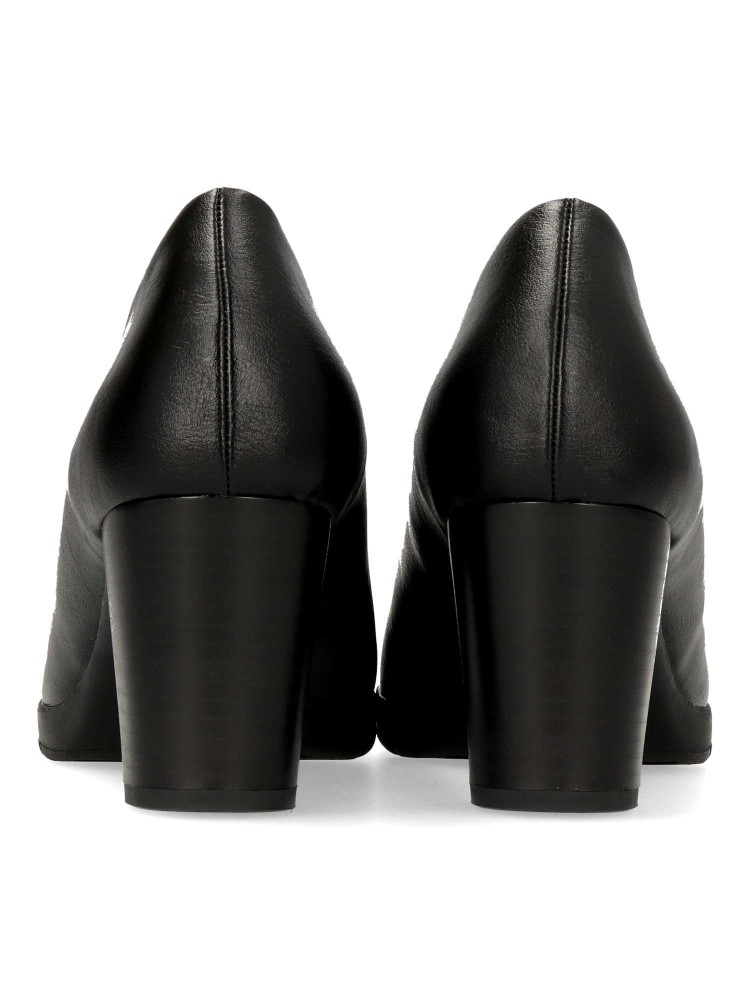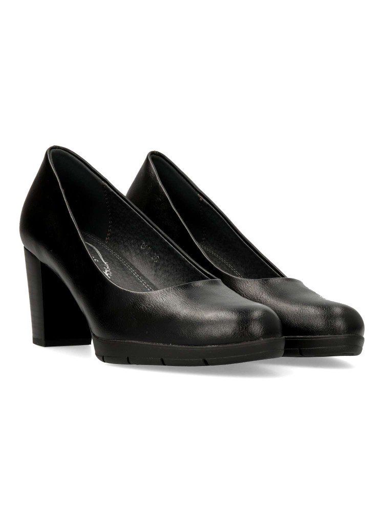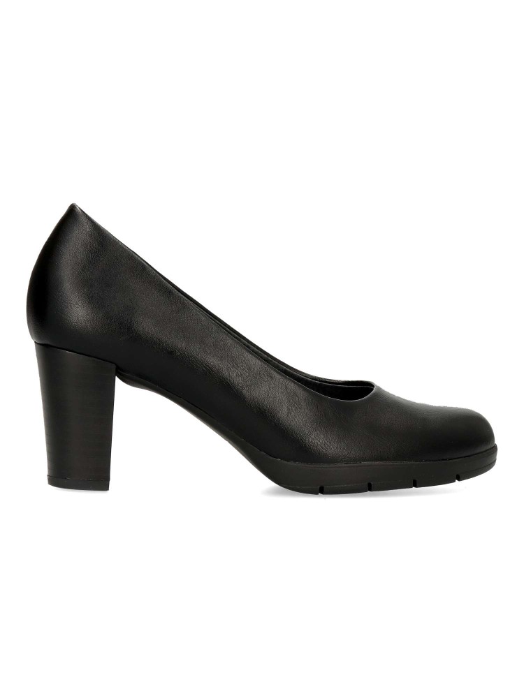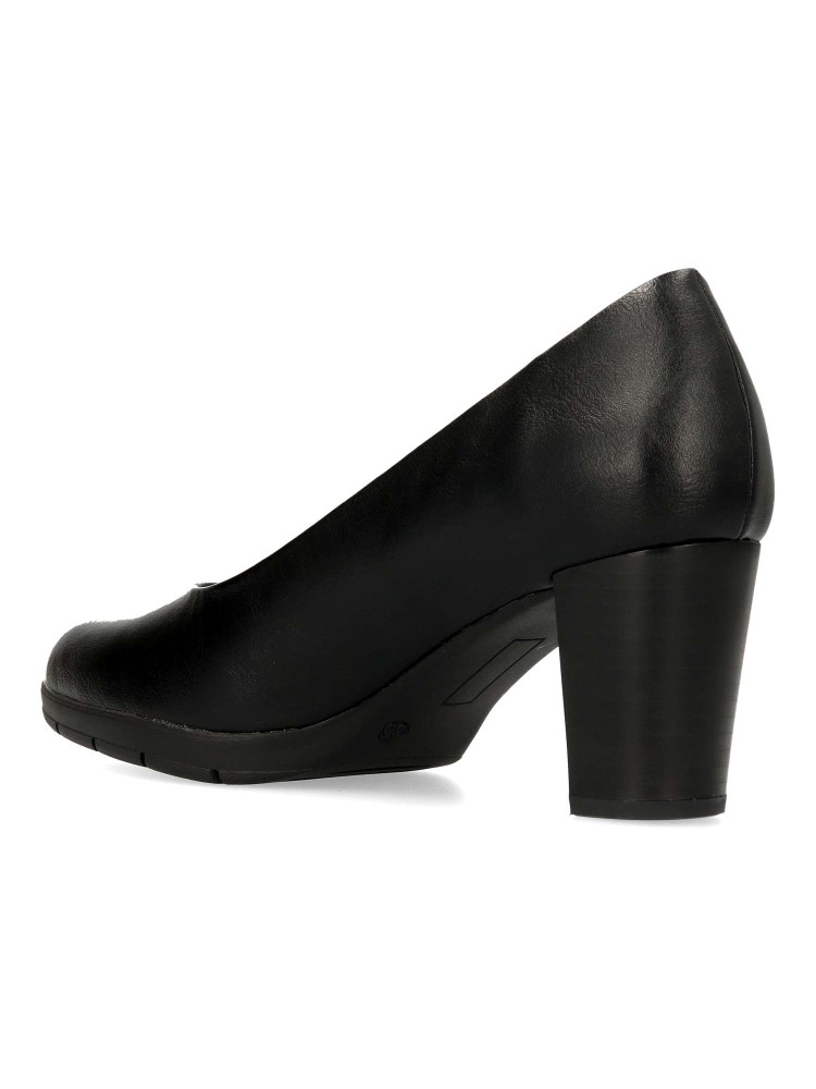 Zapato salón cómodo de mujer. Fabricado en piel sintética, con suela de goma flexible. Plantilla acolchada. Disponible en color negro. Tacón ancho de 7 cm. de altura. Un modelo muy confortable para trabajar en oficinas, o salir con amigas.