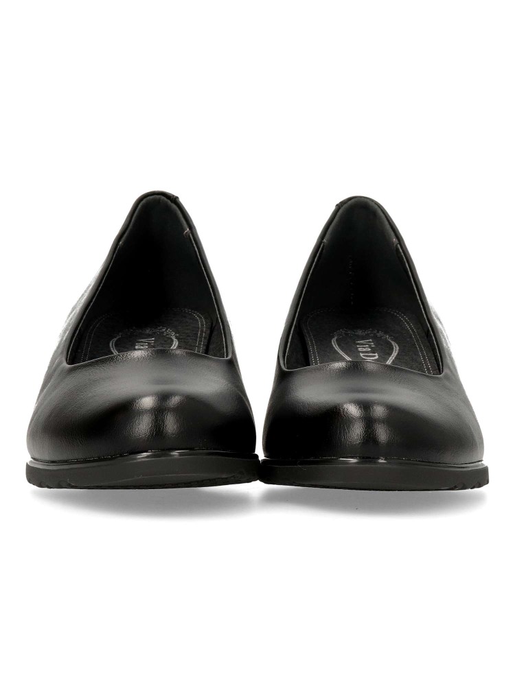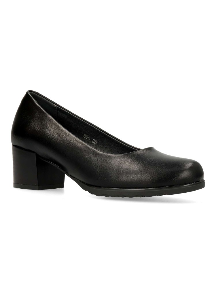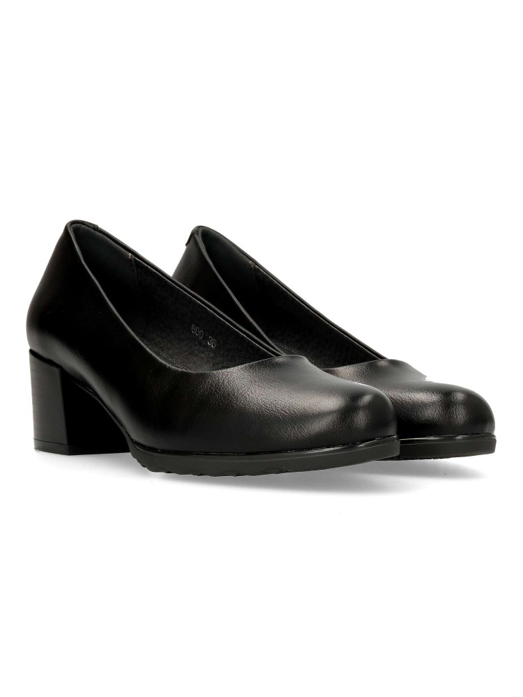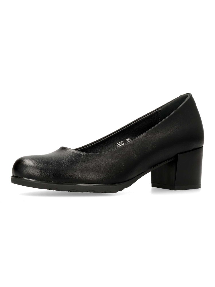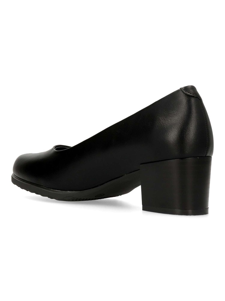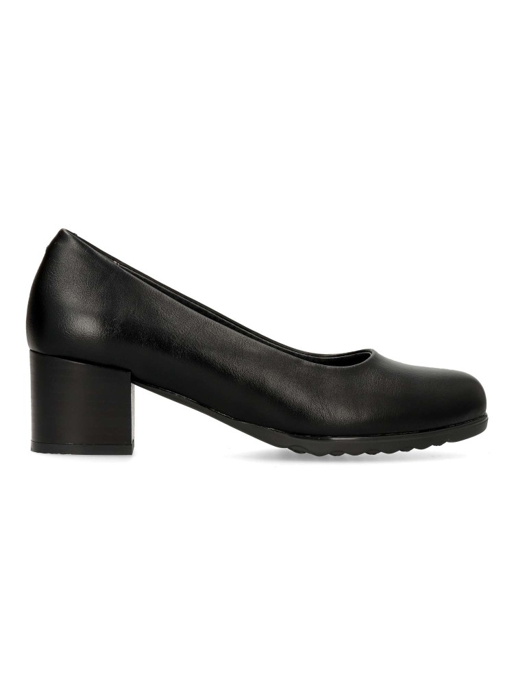 Zapato salón cómodo de mujer. Fabricado en piel sintética, con suela de goma flexible. Plantilla acolchada. Color negro. Tacón ancho de 4,5 cm. de altura. Un modelo muy confortable para trabajar en oficinas, o salir arreglada en tu día a día.