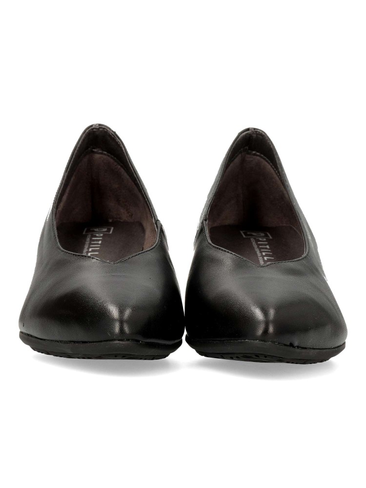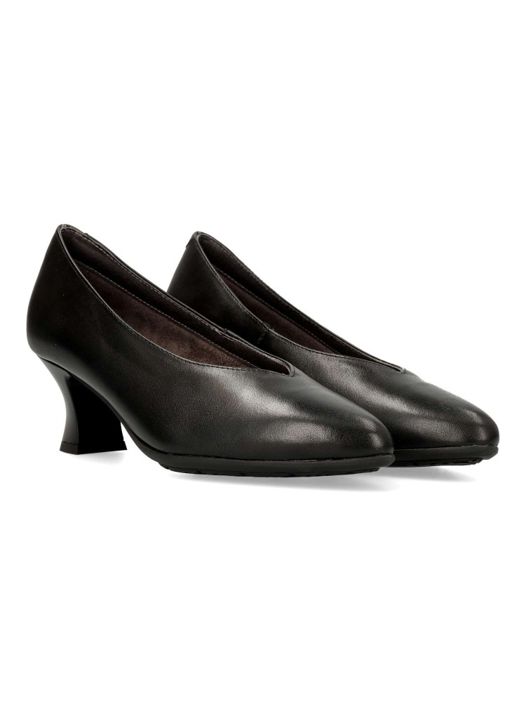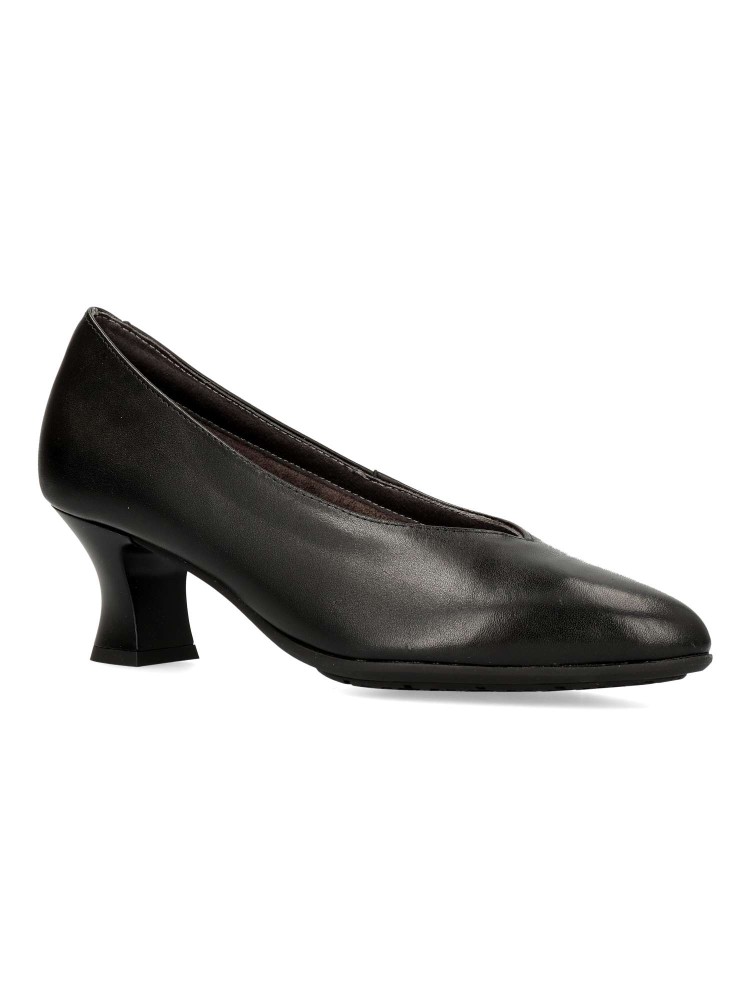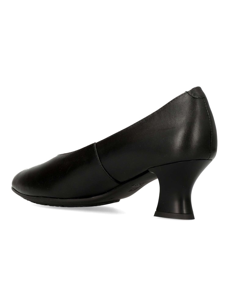 Zapato salón cómodo de mujer. Fabricado en piel, con suela de goma. Plantilla acolchada. Disponible en color negro. Tacón de 5 cm. Combinan calidad, confort y bienestar. Ideal tanto para tu día a día, ocasiones especiales o llevarlos a la oficina.