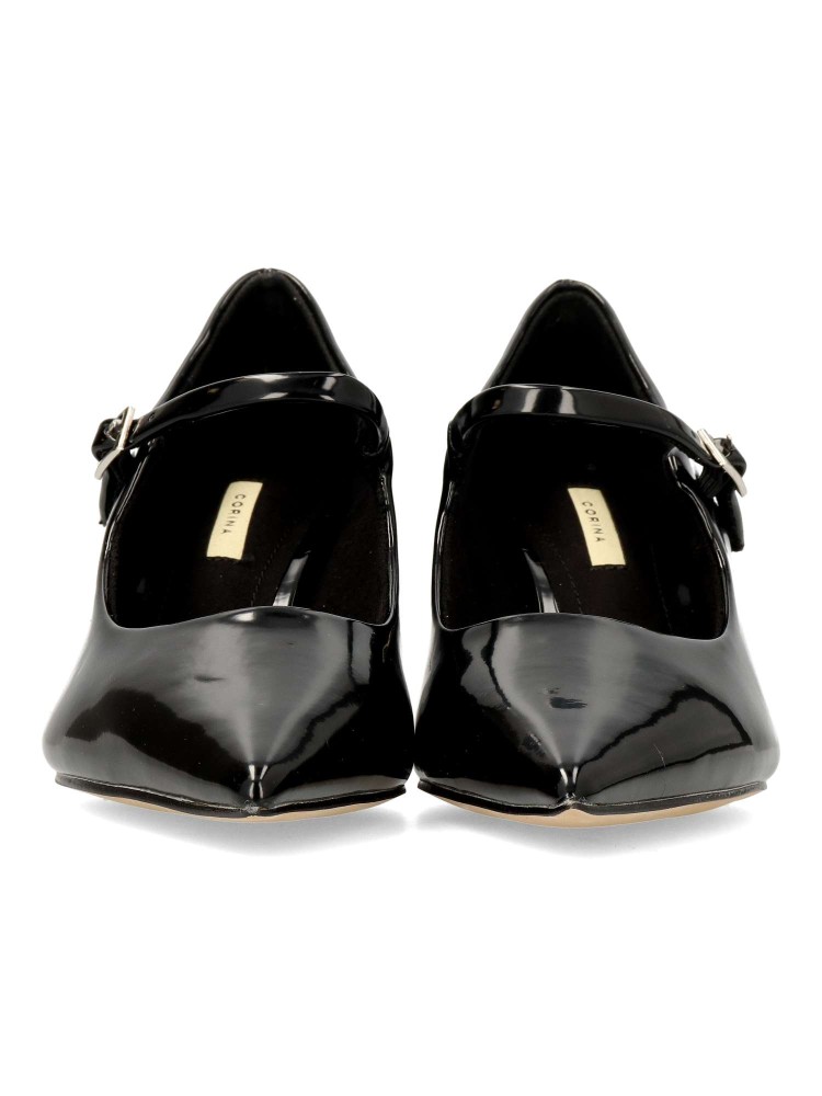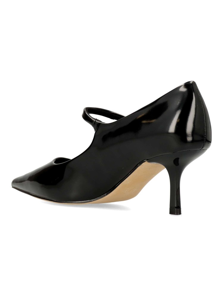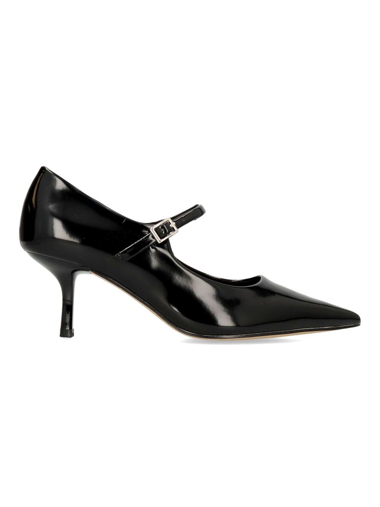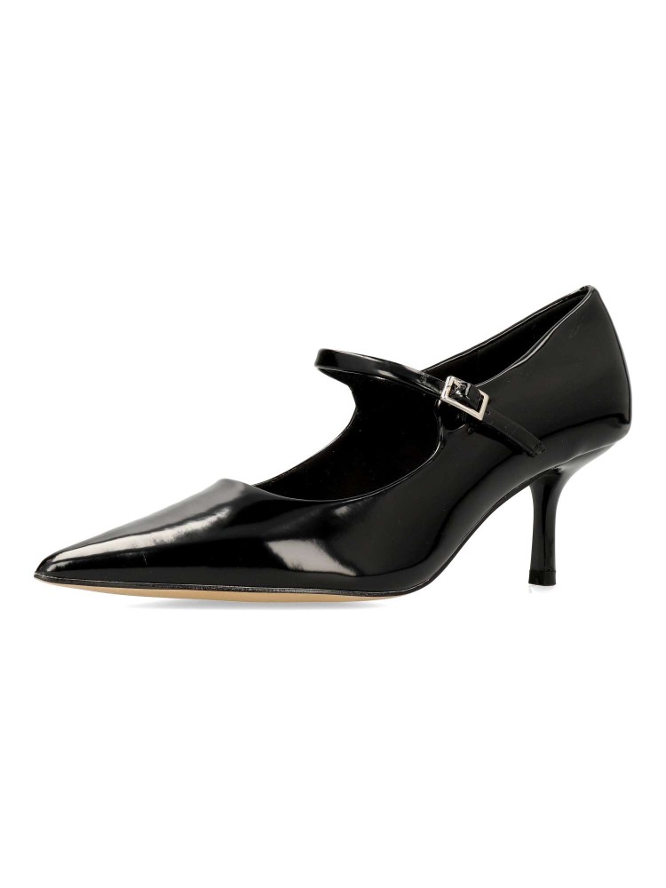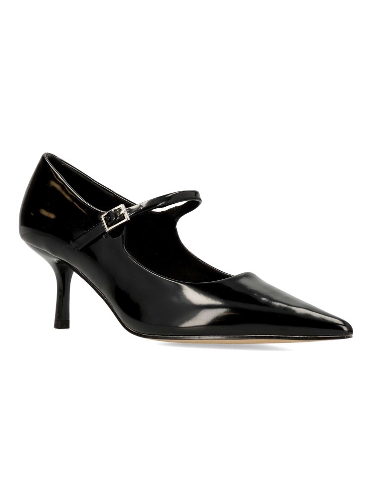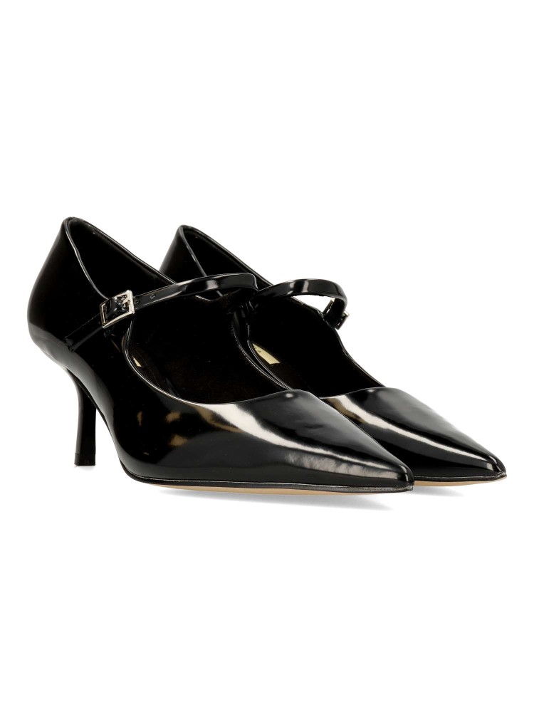 Zapato salón de mujer, con tira al empeine y cierre de hebilla. Modelo con puntera y tacón fino, fabricado en piel sintética. Plantilla acolchada. Color negro. Tacón de 5,5 cm. de altura. Diseño elegante, que combina con conjuntos arreglados o de diario.