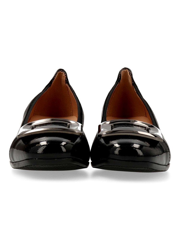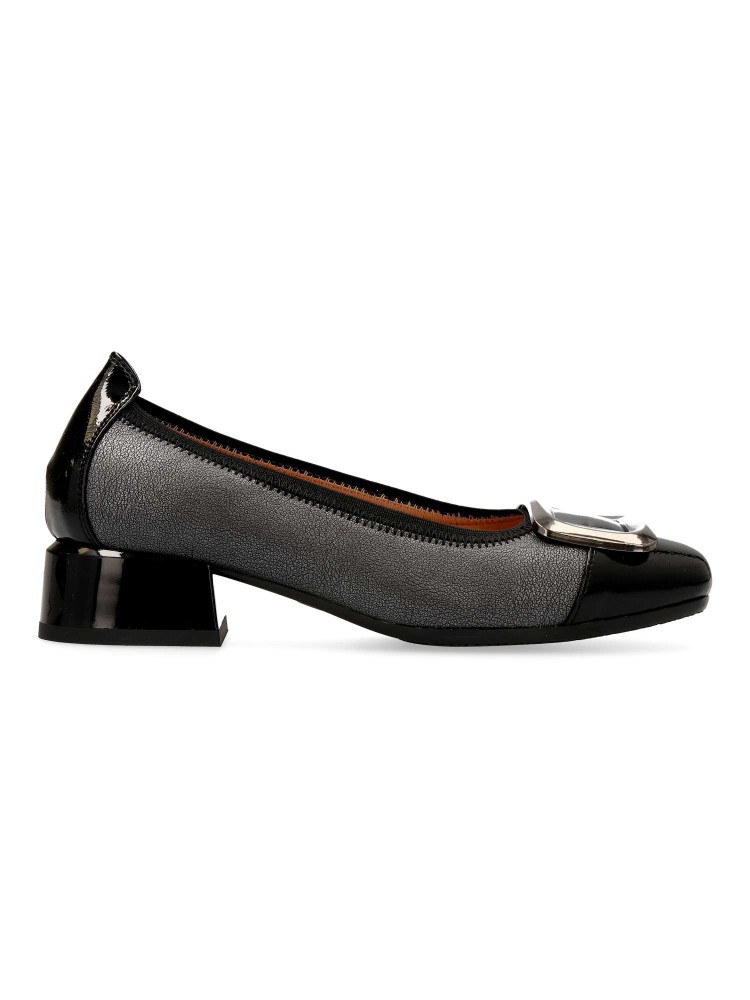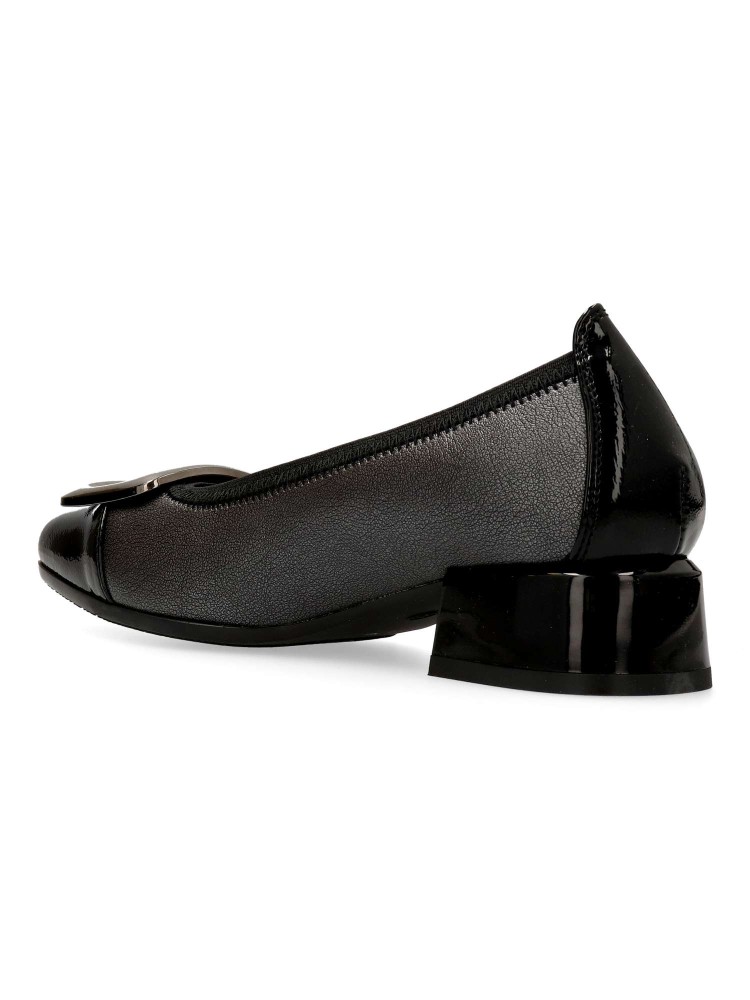 Zapato salón de mujer, fabricado en piel sintética. Elástico para mejor calce. Suela de goma. Detalle charol y aplique en la puntera. Plantilla acolchada. Tacón ancho de 3,5 cm. Ideal tanto para tu día a día, como ocasiones especiales.