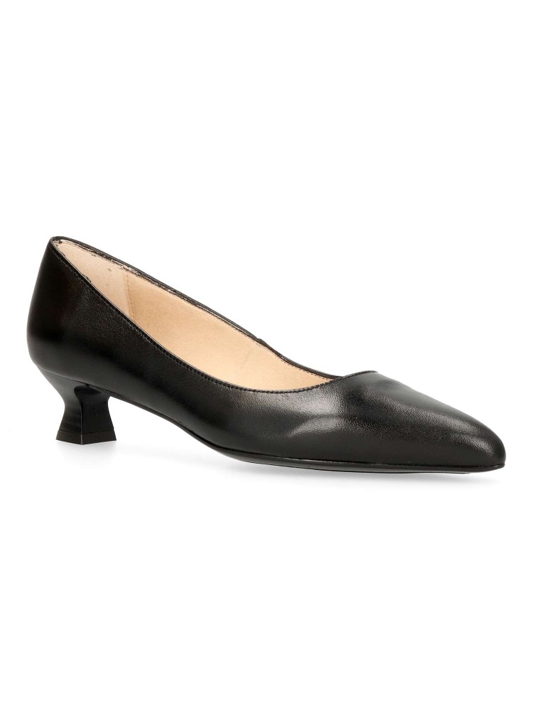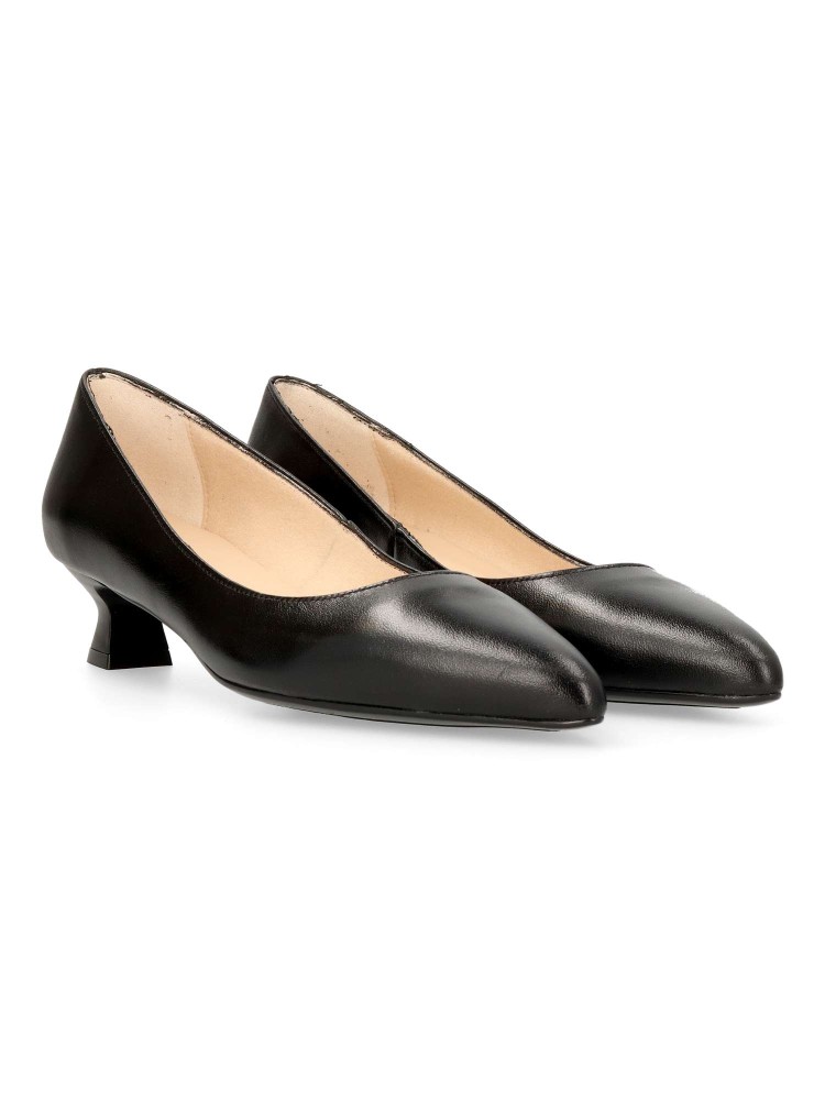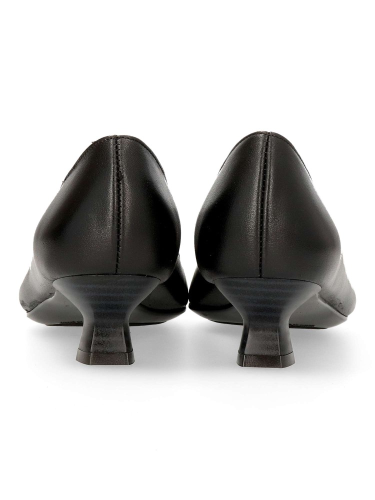 Salón de mujer modelo Ángela en piel negra. Un diseño confeccionado con tacón geométrico de 3.5 cm de altura. Punta fina y escote redondo. Plantilla de piel acolchada. Ideales tanto en tu día a día como para una ocasión especial. Hechos en España.
