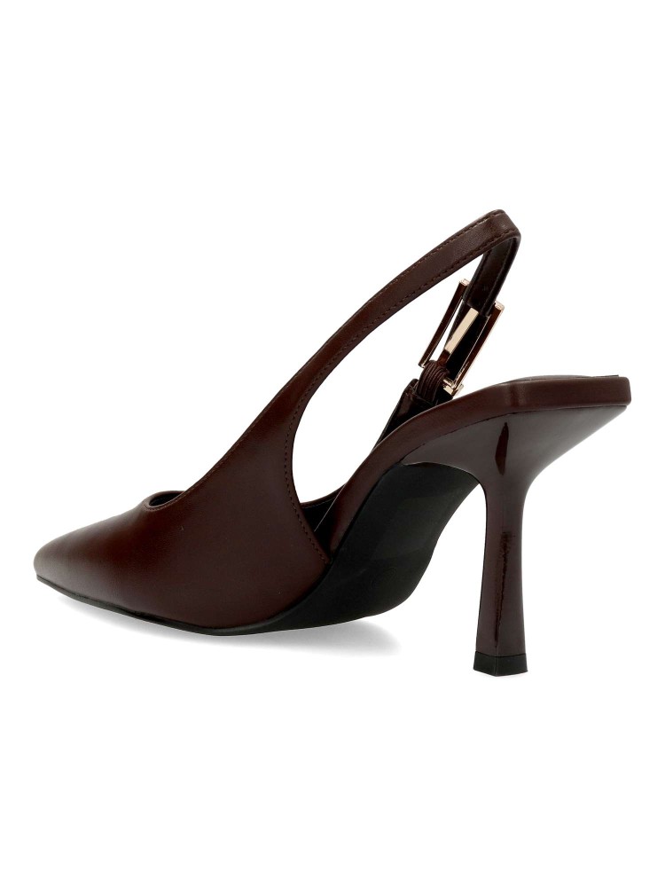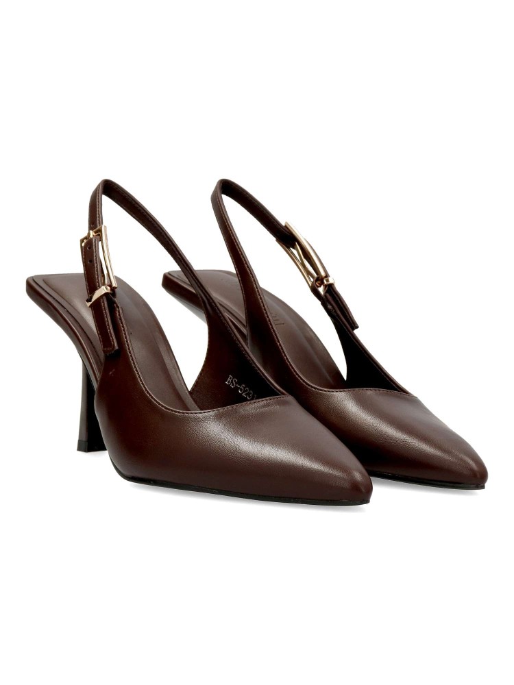 Zapato salón de mujer, con puntera fina y destalonado. Fabricado en material sintético. Planta acolchada. Color café. Tacón fino de 7 cm. de altura. Modelo cómodo y elegante, ideal tanto para tu día a día, como para eventos y celebraciones.