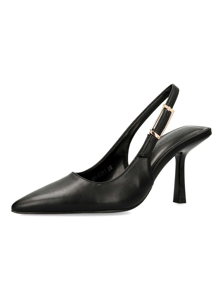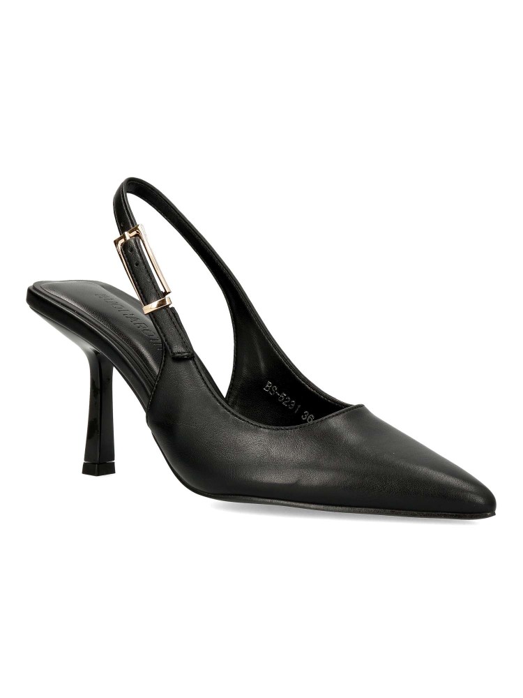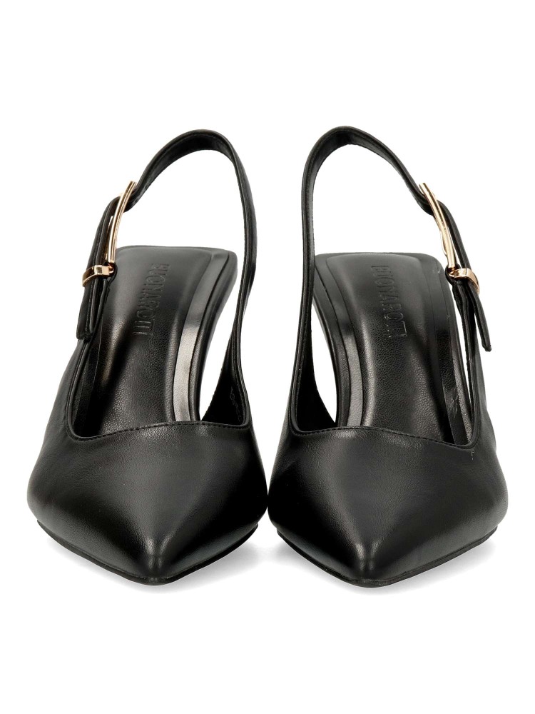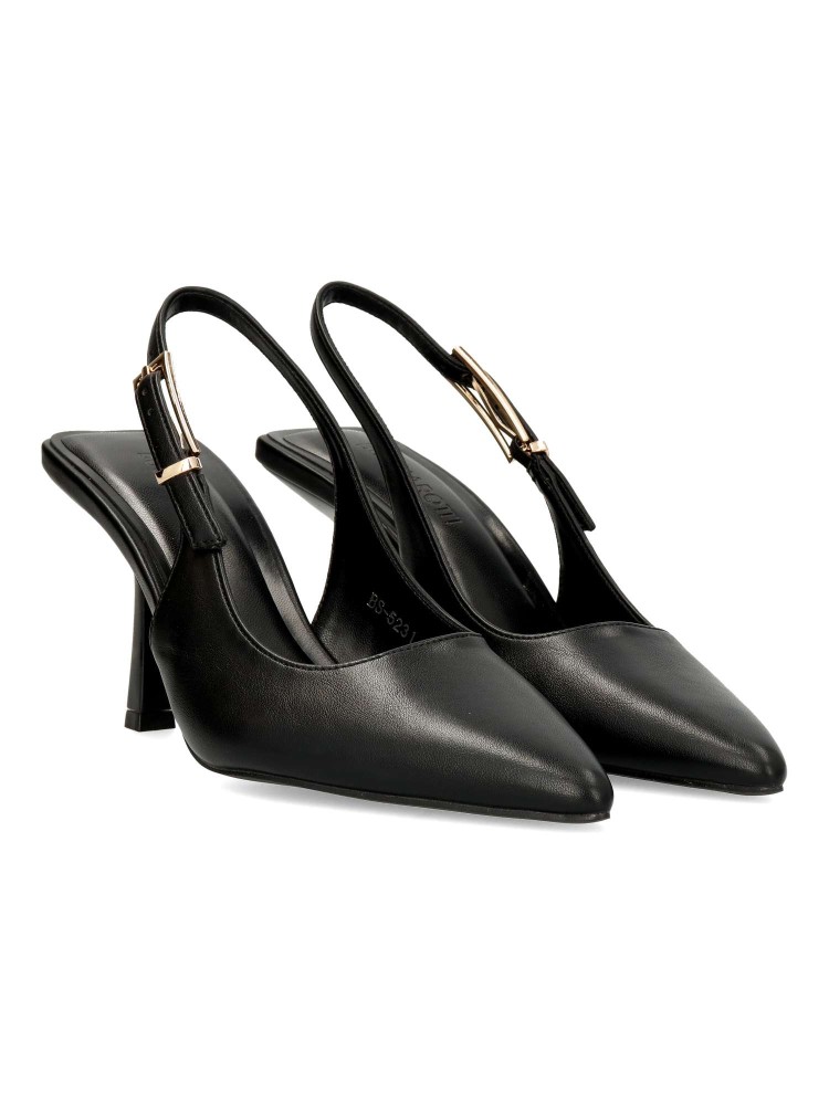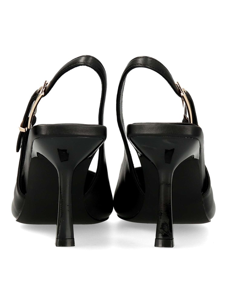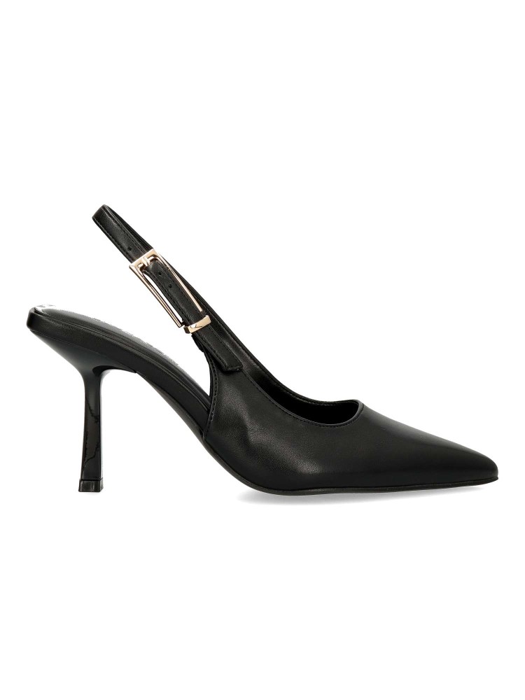 Zapato salón de mujer, con puntera fina y destalonado. Fabricado en material sintético. Planta acolchada. Color negro. Tacón fino de 7 cm. de altura. Modelo cómodo y elegante, ideal tanto para tu día a día, como para eventos y celebraciones.