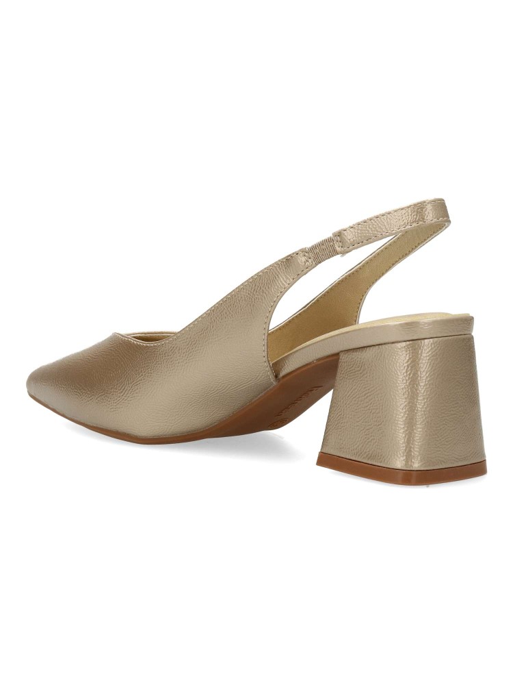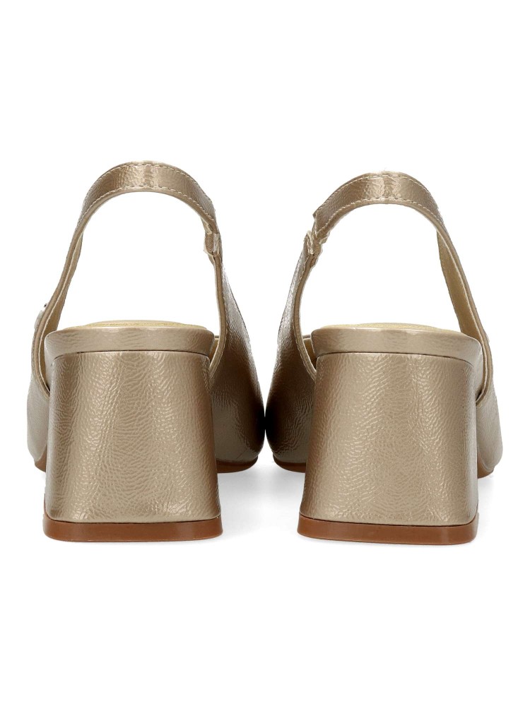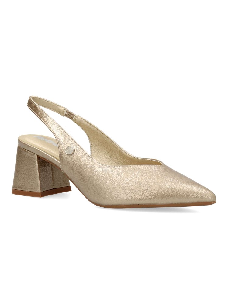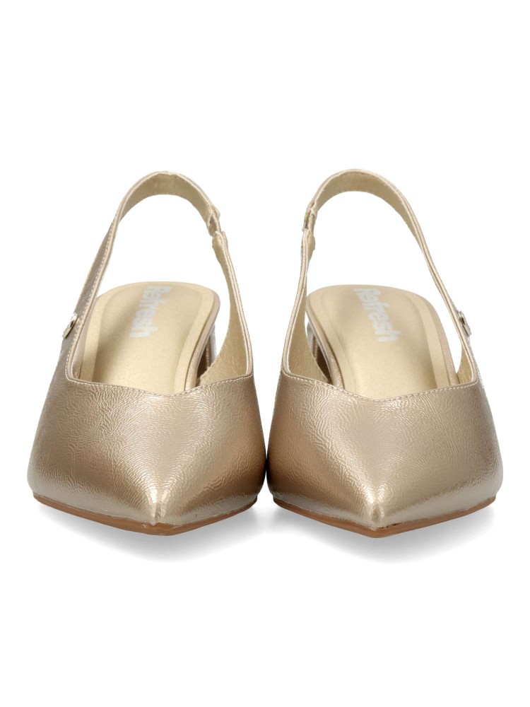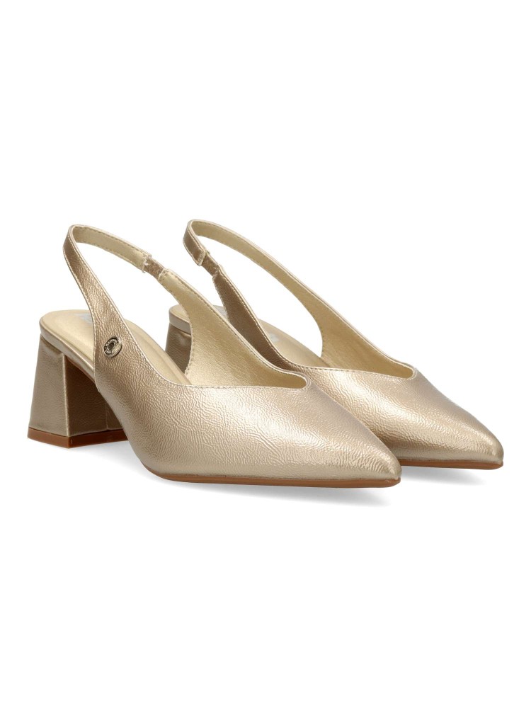 Salón de mujer, con punta fina y destalonado. Fabricado en material sintético grabado. Planta acolchada. Color oro. Tacón ancho de 5,5 cm. Modelo cómodo y elegante, ideal tanto para tu día a día, como para eventos y celebraciones. Certificado vegano.