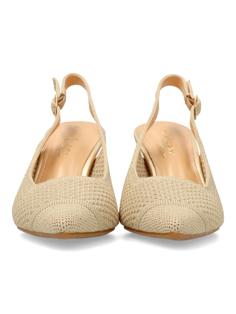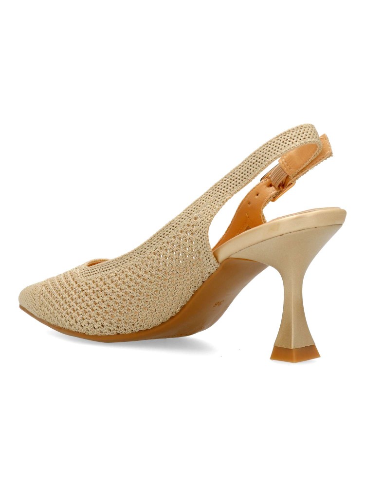 Salón cómodo de mujer destalonado. Fabricado en material textil transpirable color oro. Planta acolchada. Tacón fino de 7 cm. de altura. Modelo cómodo y elegante, ideal tanto para tu día a día, como para eventos y celebraciones.