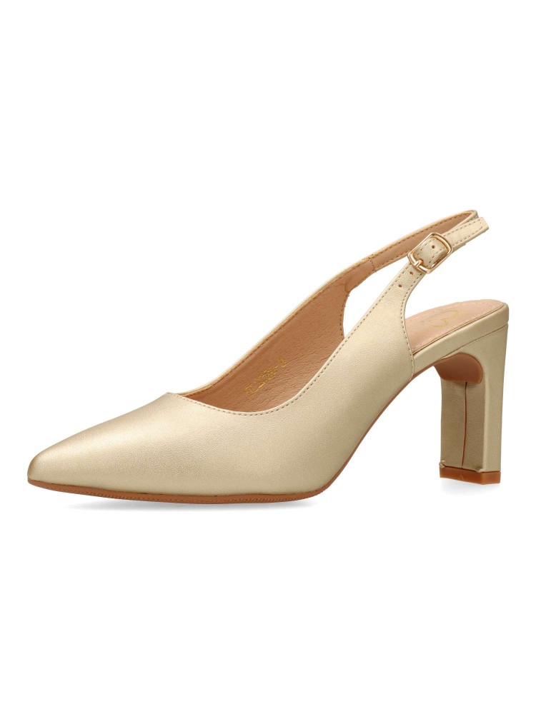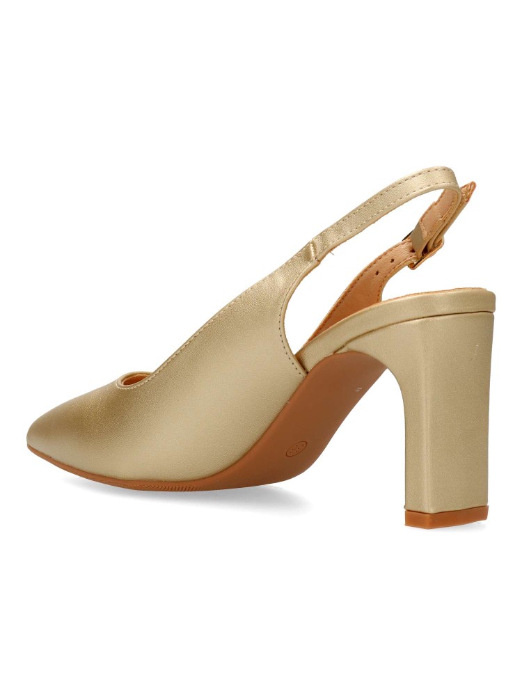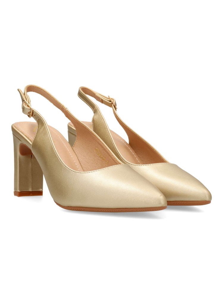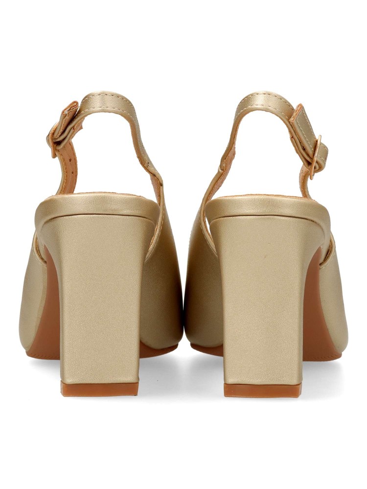 Salón de mujer, con puntera fina y destalonado. Cierre de hebilla. Fabricado en material sintético. Planta acolchada. Color oro. Tacón de 7,5 cm. de altura. Diseño cómodo y elegante, ideal tanto para tu día a día, como para eventos y celebraciones.